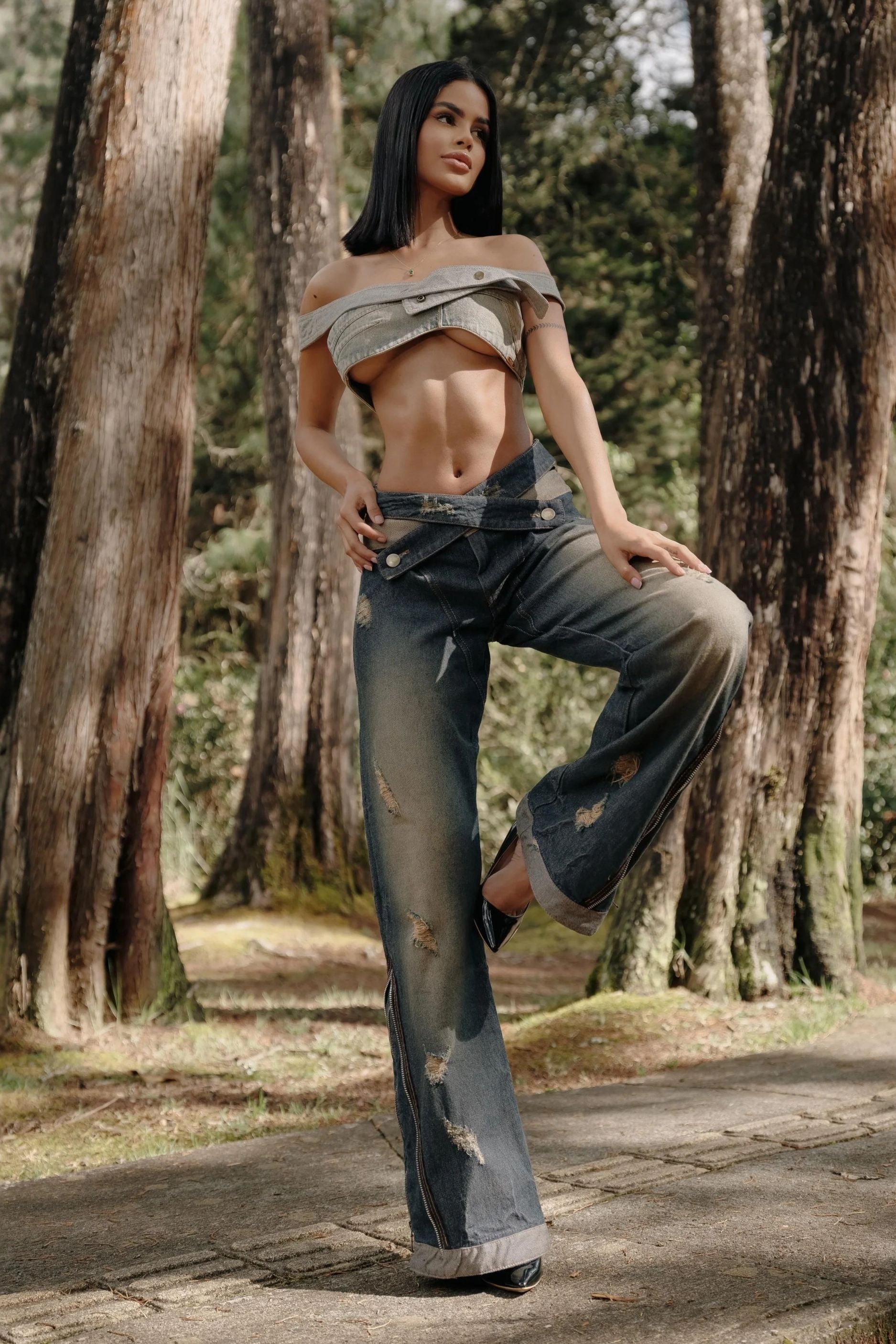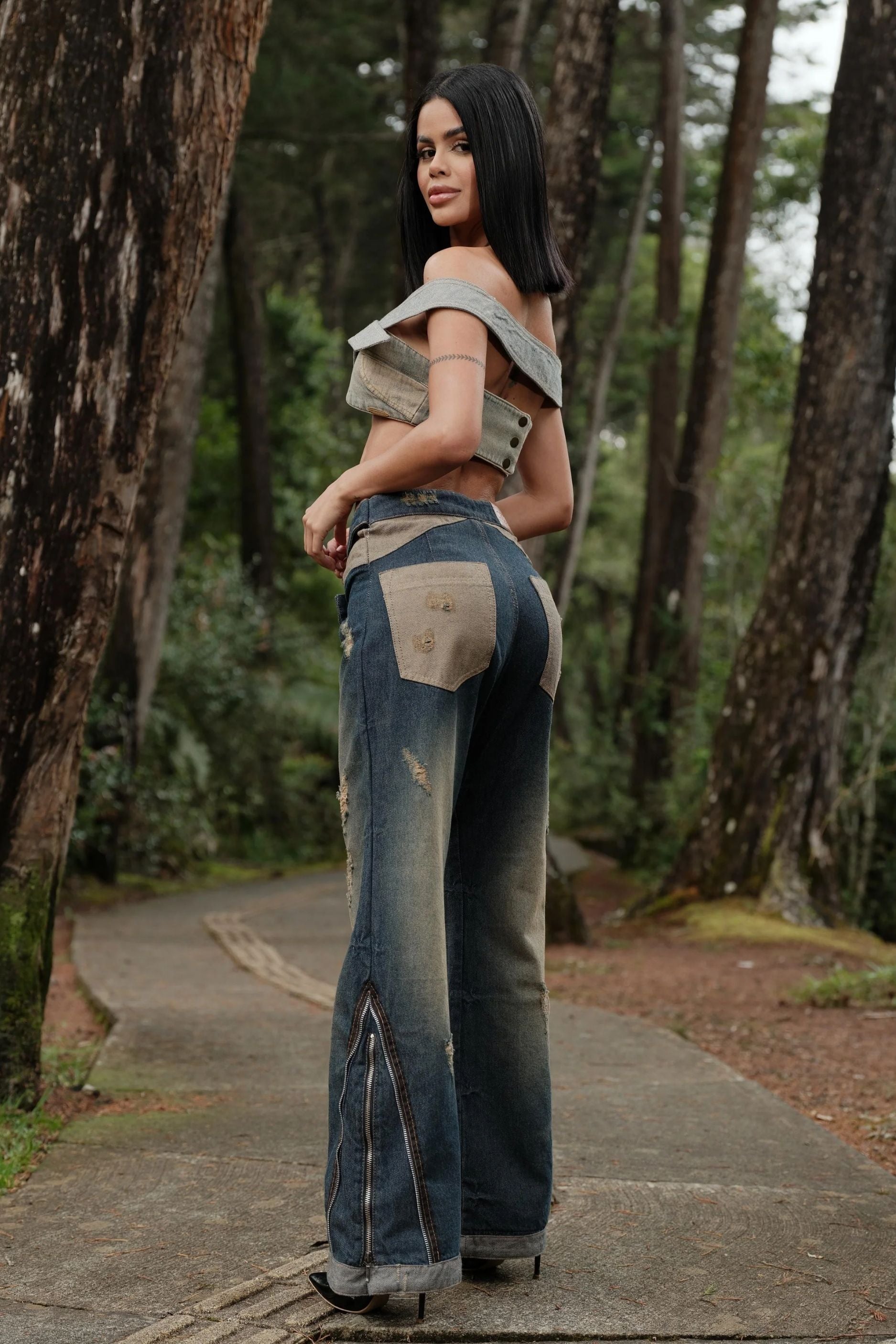 Elaborado en índigo 100% algodón, este modelo destaca por su pretina cruzada en X con botones contramarcados, un detalle que lo diferencia dentro de la colección. Su horma es recta semi ajustada y termina en una bota semi campana con cortes y cintas de cierre. El acabado combina un azul petróleo con sutiles dirtys en tonos amarillosos, desarrollado mediante un proceso exclusivo de OPULENT.