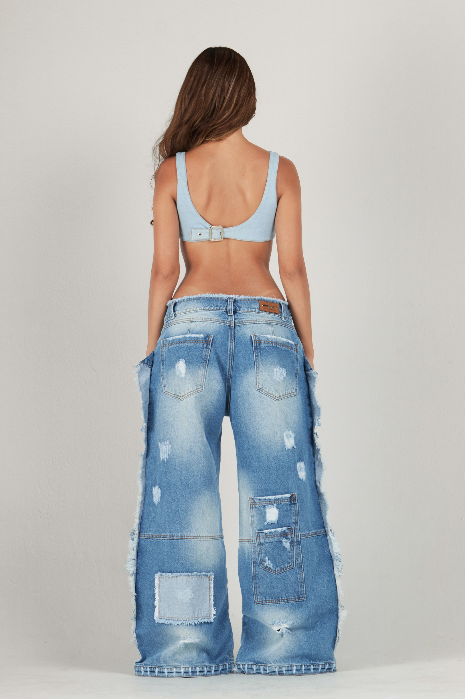 La modelo mide 1,75 cm y viste jean talla 8 y crop top talla M
