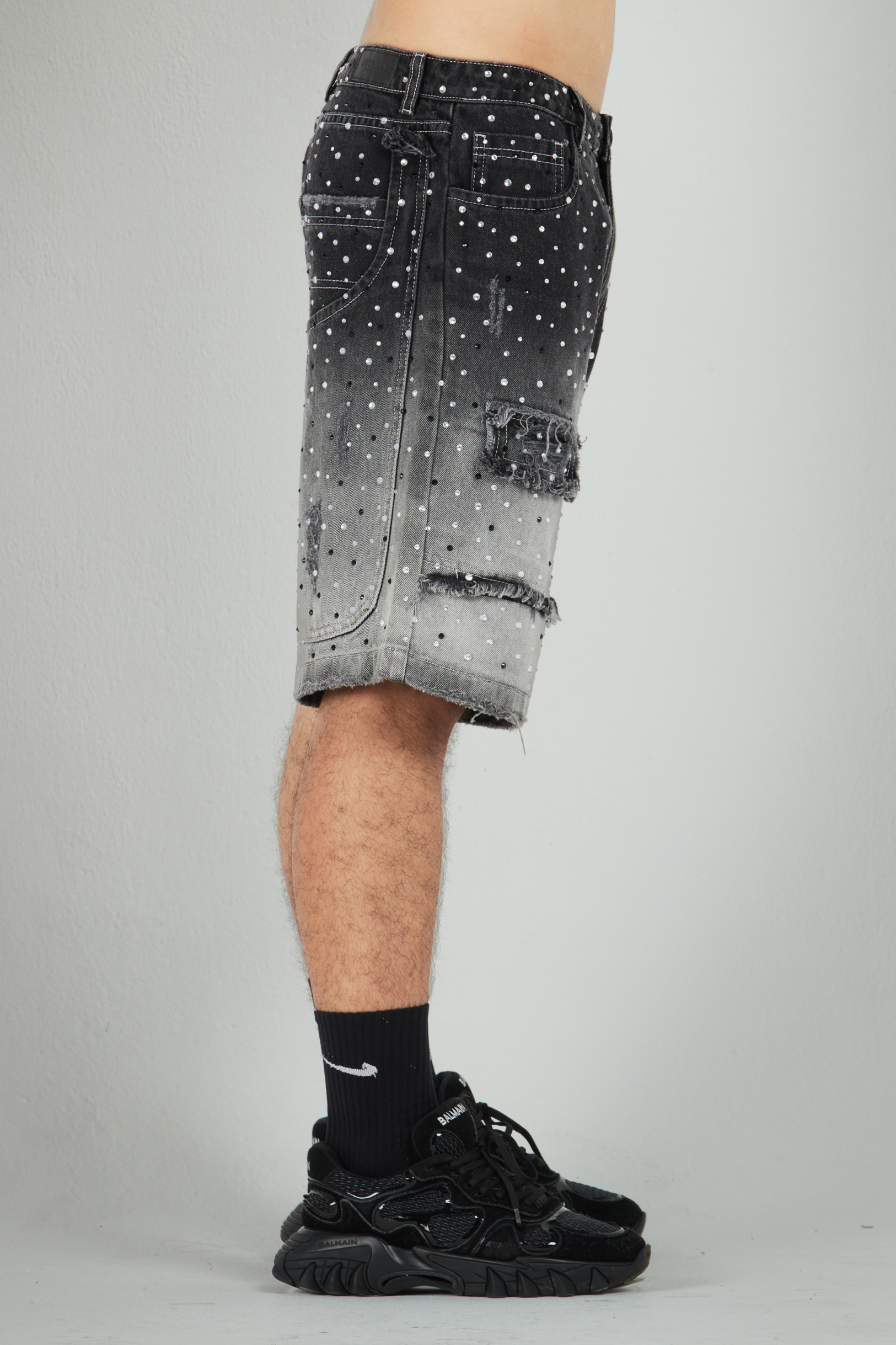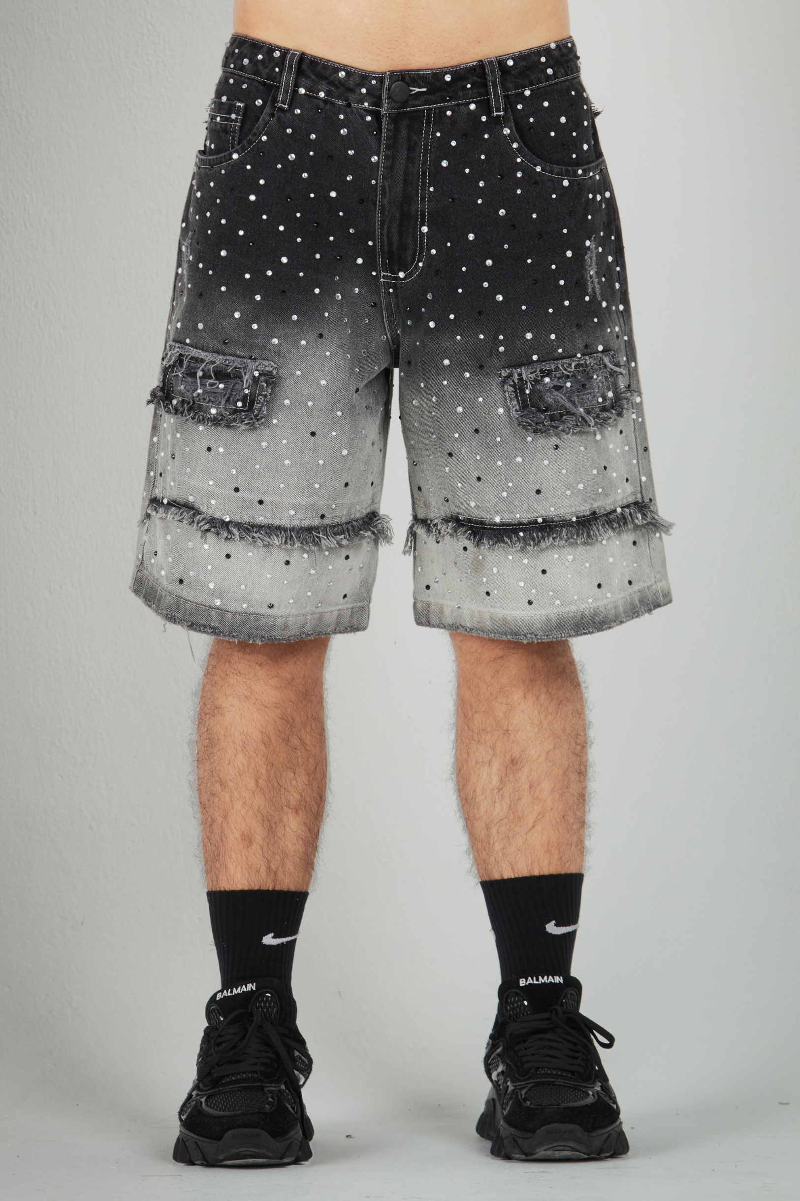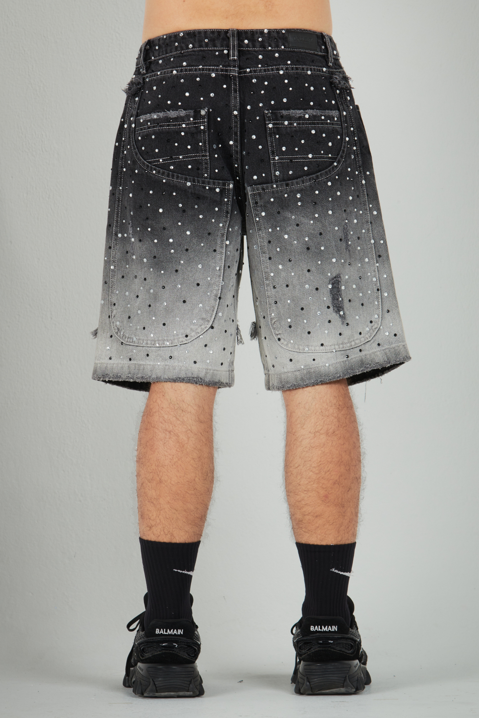 Con pedrería cristal aplicada a mano. Su diseño presenta cortes frontales sutiles y detalles en la parte trasera con cortes bajo los bolsillos. El degradado en tonos negro a gris realza su estética.