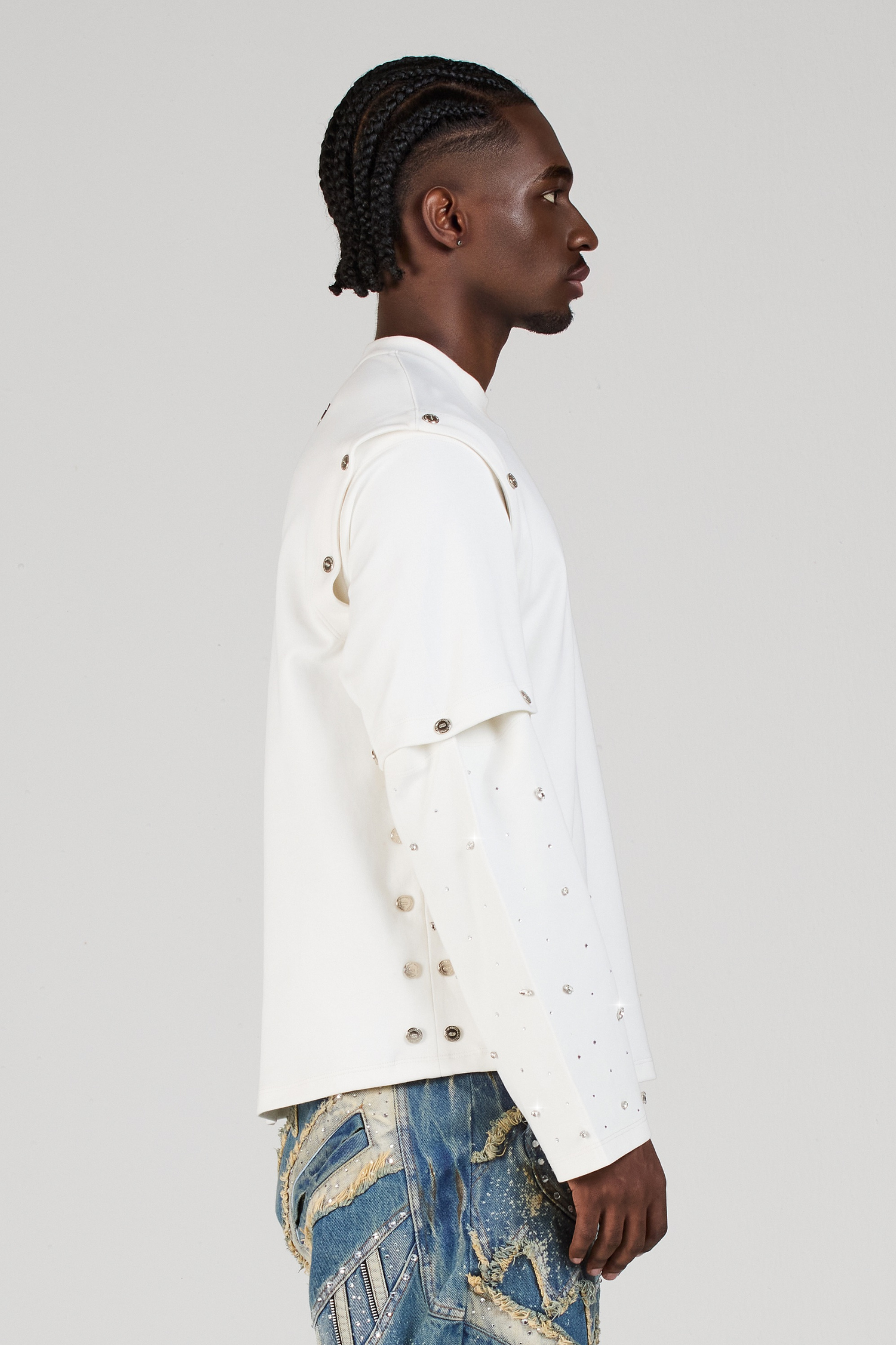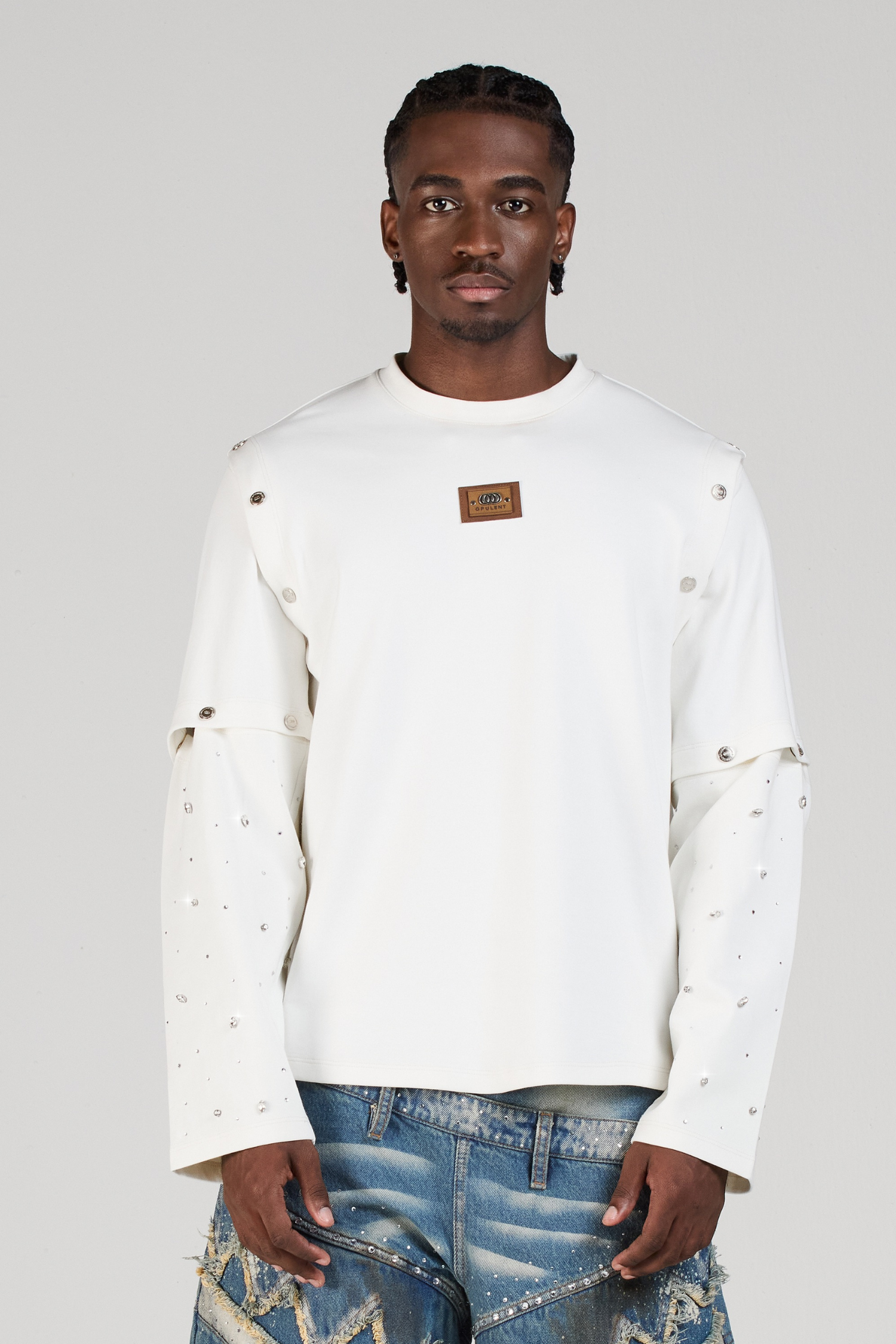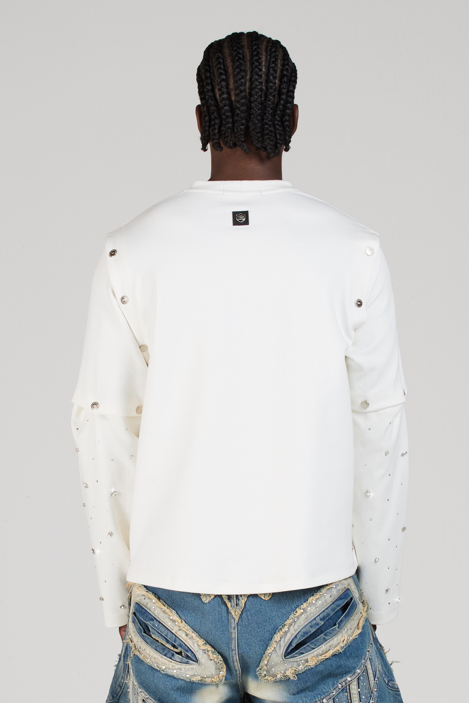 Las mangas del buzo incorporan pedrería cristal cocida a mano, un detalle artesanal que eleva la prenda y la convierte en un ícono de la línea.
