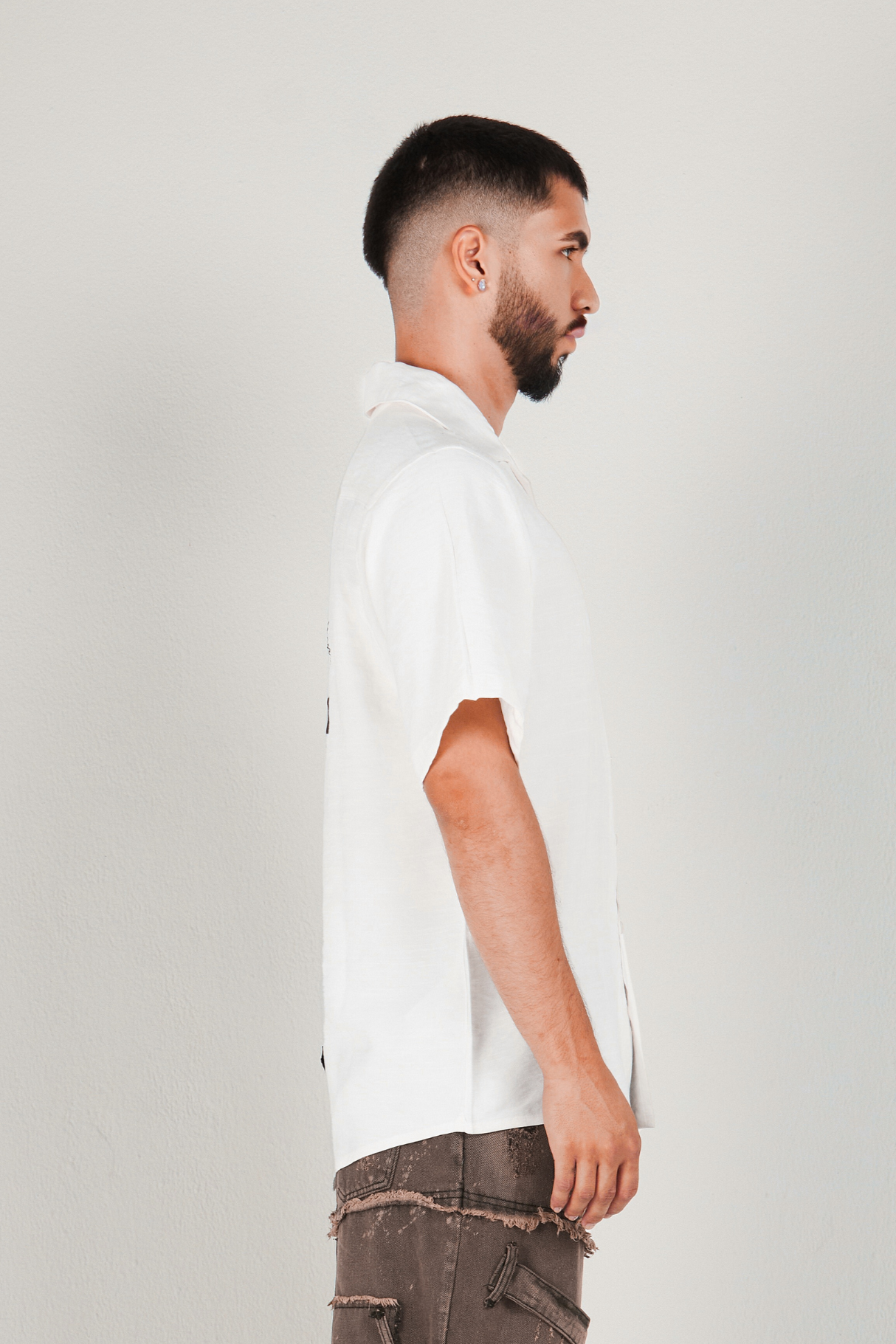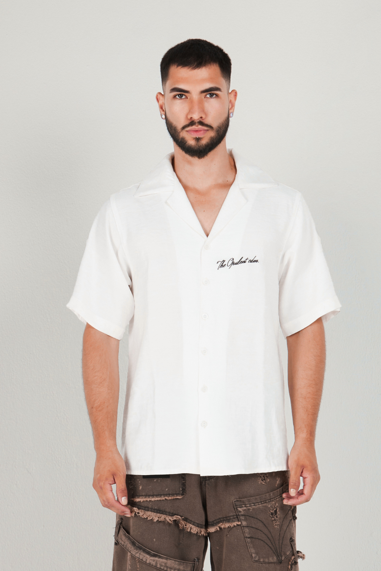 El diseño incorpora un bordado en la parte delantera y otro en la trasera, acompañado de placas metálicas ubicadas estratégicamente en la parte superior e inferior. Su cierre frontal con botones aporta un acabado clásico y elegante que equilibra el estilo con la identidad OPULENT.