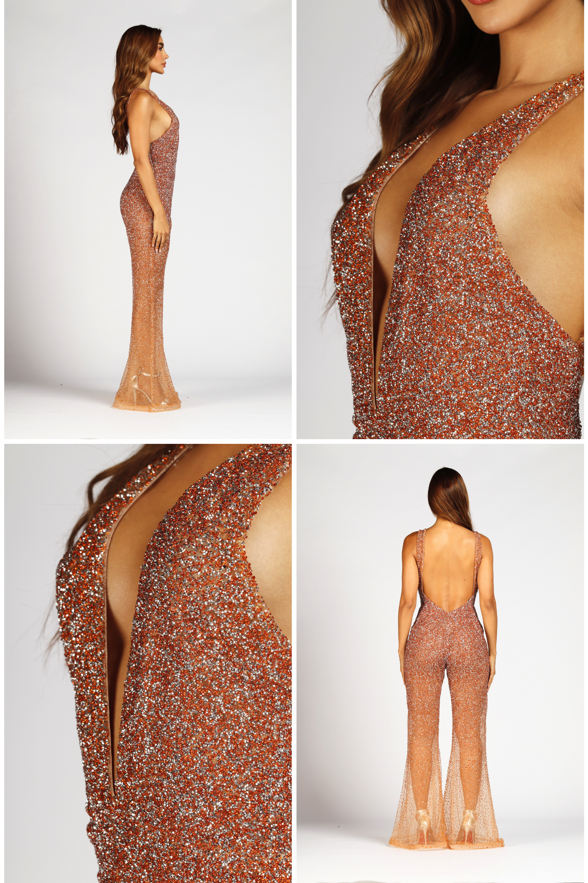 Confeccionado en tela cristal intervenida con pedrería en tonos naranja con destellos plateados, este enterizo se ajusta al cuerpo resaltando la silueta femenina y culmina en una bota semi campana que aporta movimiento. Su diseño revela una espalda totalmente descubierta y un delicado escote en ‘V’, logrando un balance entre sensualidad y elegancia.