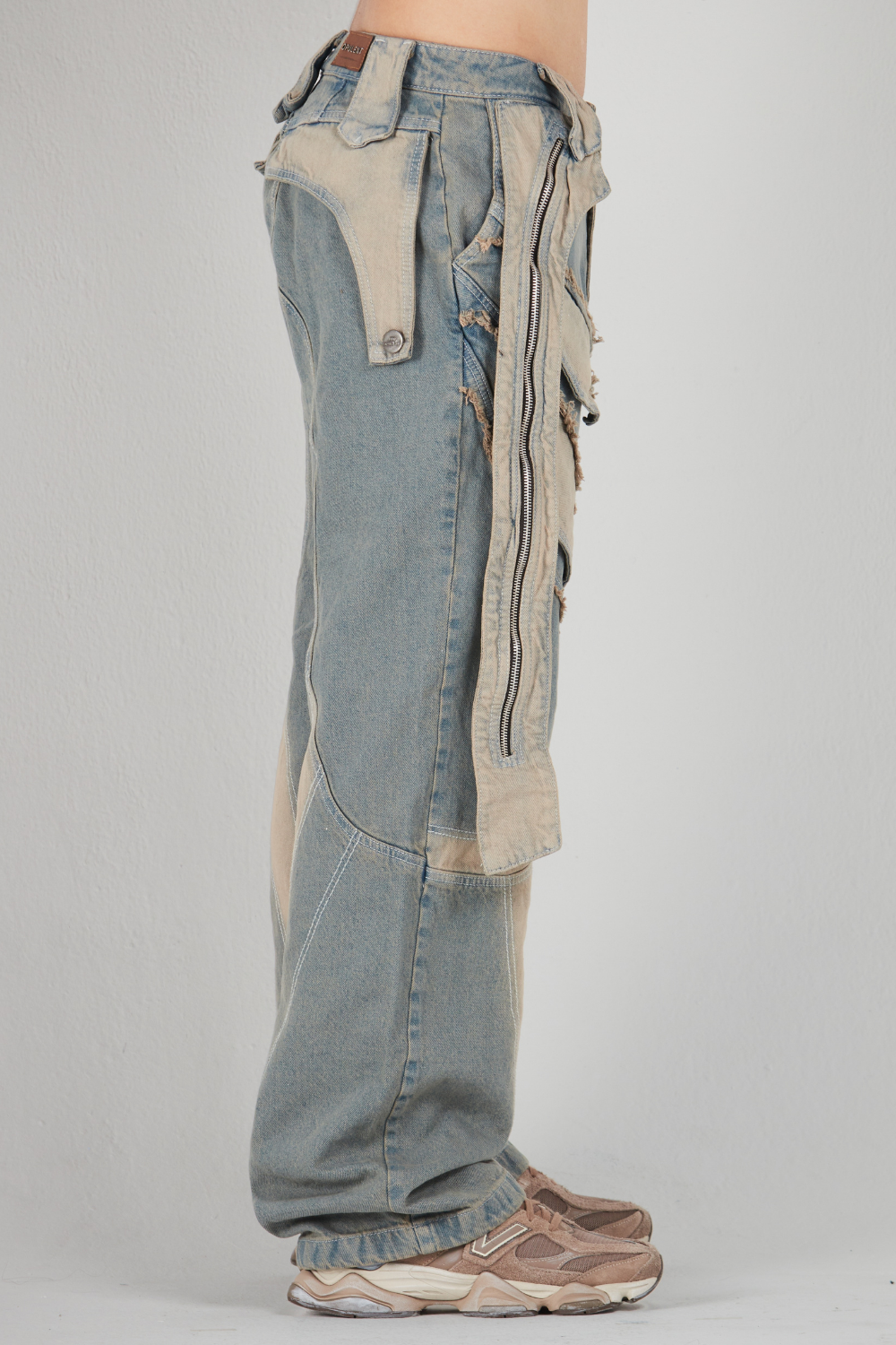 Este modelo descaderado integra cierres verticales que refuerzan su carácter y aportan dinamismo al diseño. Incluye botón contramarcado, detalles en piezas desflecadas y múltiples cortes con costuras visibles, elementos que consolidan su identidad.