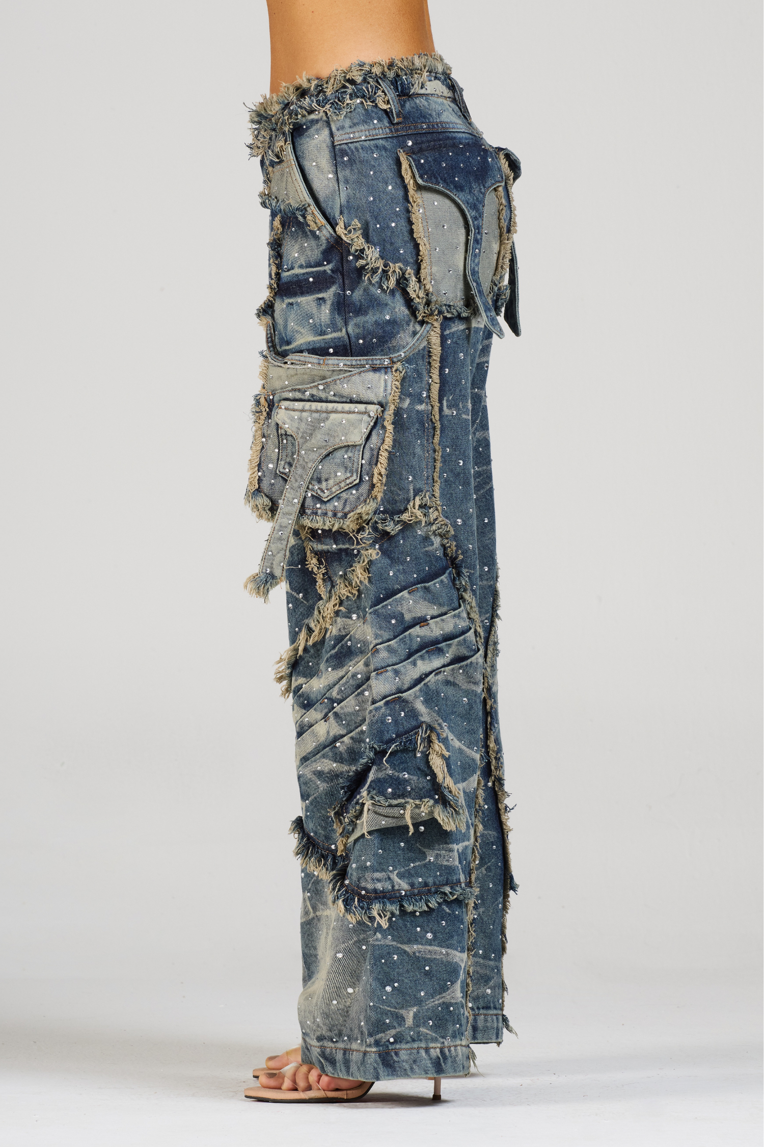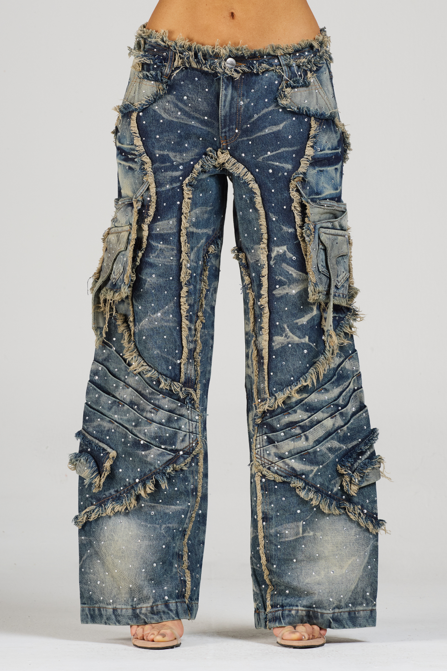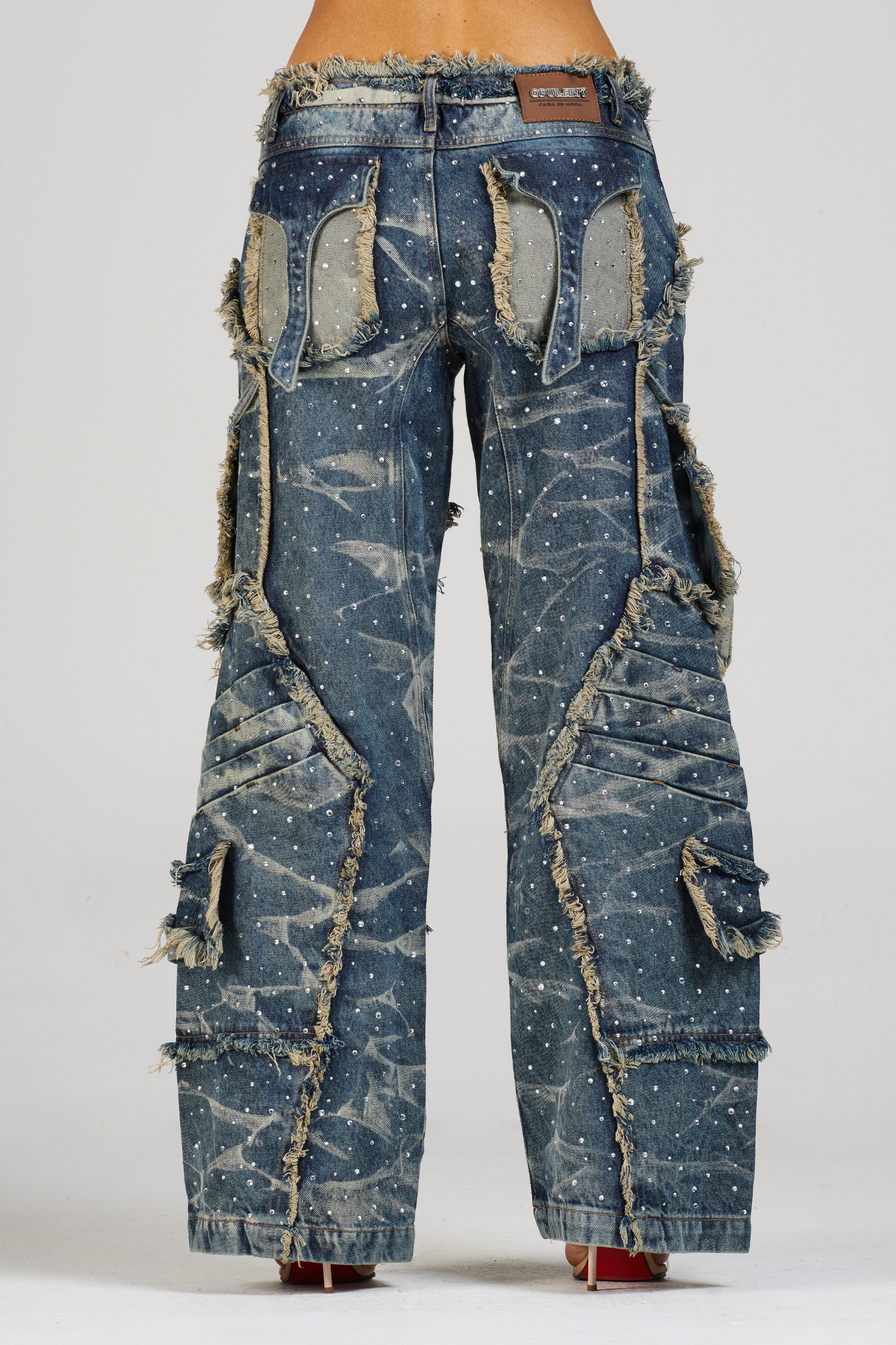 Diseño descaderado con bragueta y botón contramarcado. Tiene Pedrería cristal pegada a mano. Su estructura presenta bolsillos colgantes laterales, cortes asimétricos, grapeado en la parte inferior de las botas y detalles en desflecado que elevan la estética del denim apocalíptico.