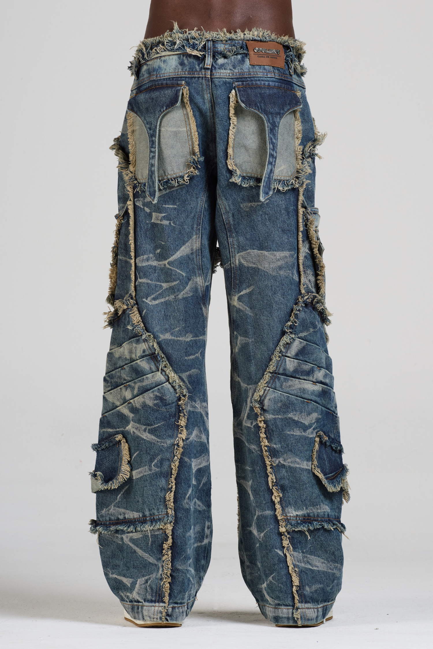 Diseño con botón contramarcado. Su estructura presenta bolsillos colgantes laterales, cortes asimétricos, grapeado en la parte inferior de las botas y detalles en desflecado que elevan la estética del denim apocalíptico.
