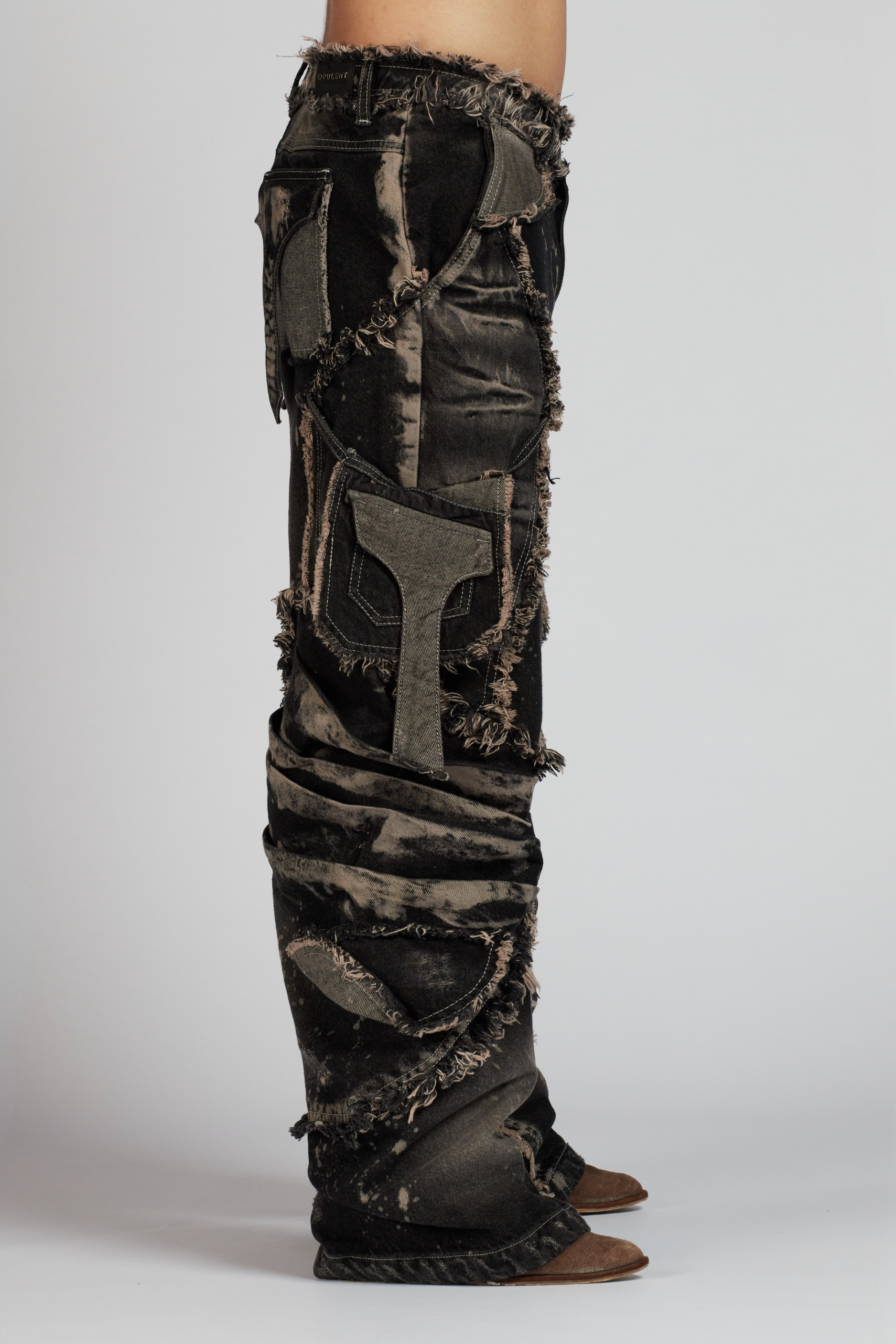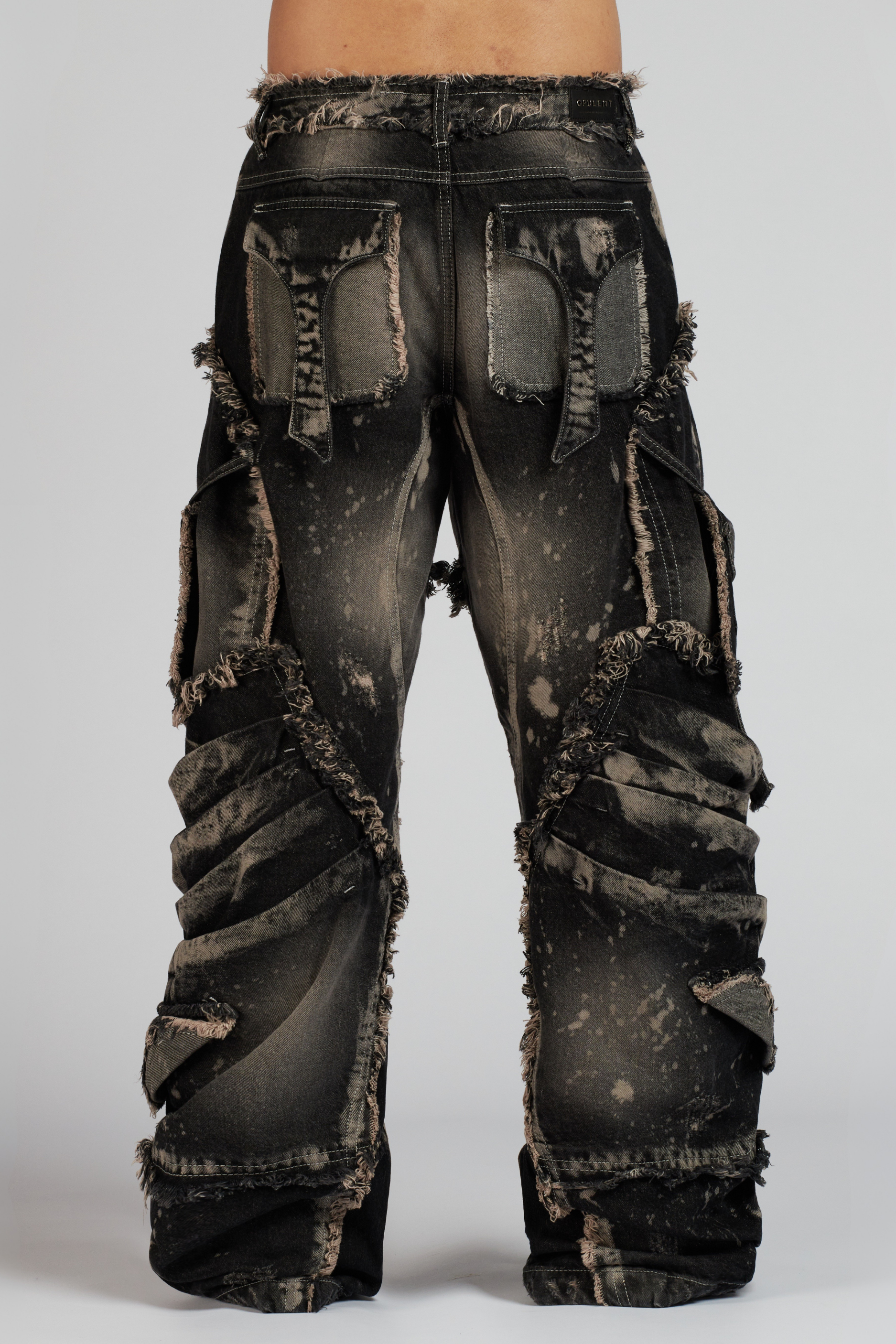 Los detalles en desfleque y costuras visibles refuerzan la identidad de la prenda. El acabado combina un fondo negro con lavados en chafados y dirtys, desarrollado mediante un proceso exclusivo de OPULENT, lo que lo convierte en una pieza única y diferenciada.
