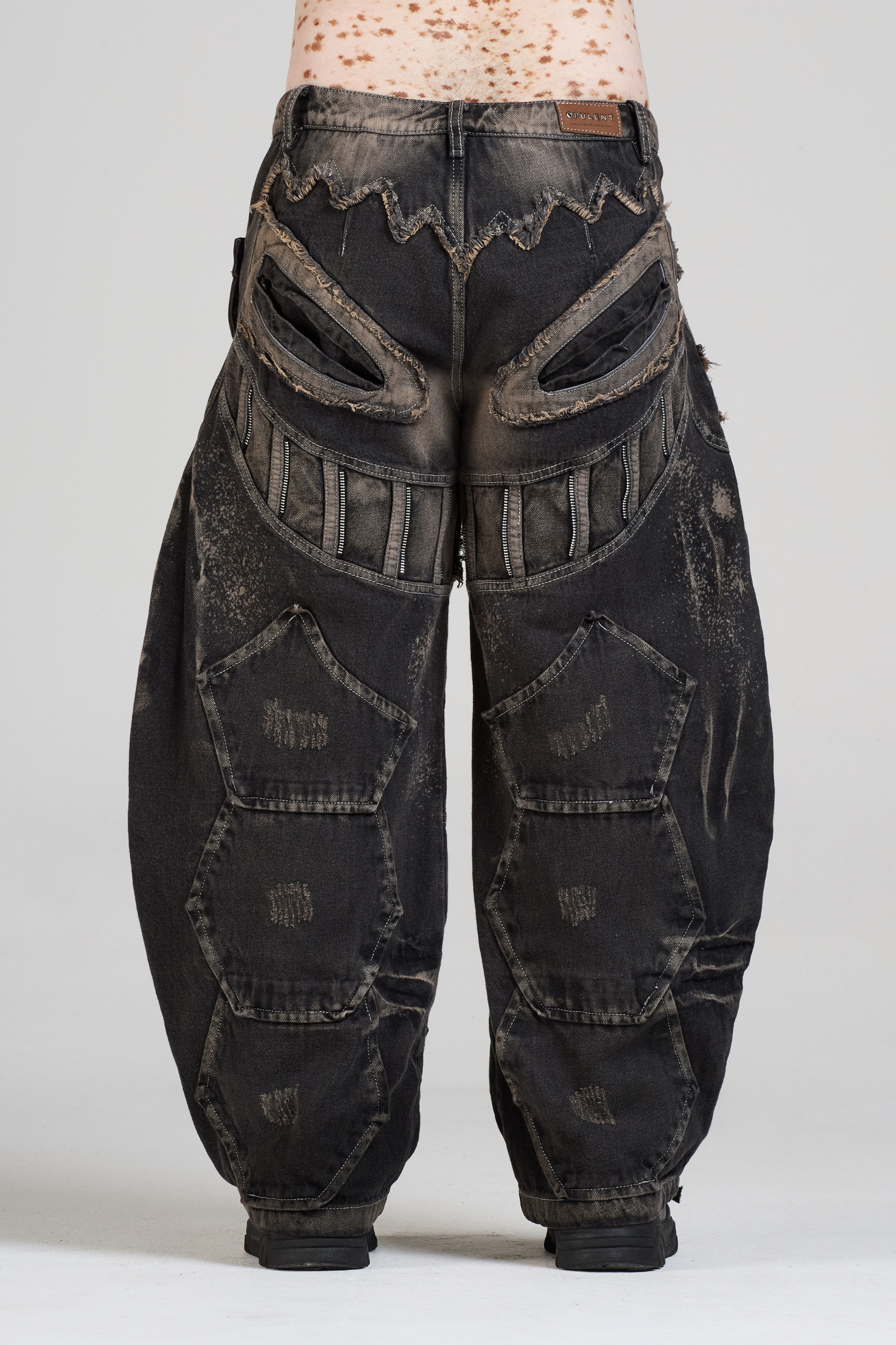 En la parte trasera se repite el rostro construido en denim, donde los ojos funcionan como bolsillos ribete, replicando el concepto presente en la parte frontal.