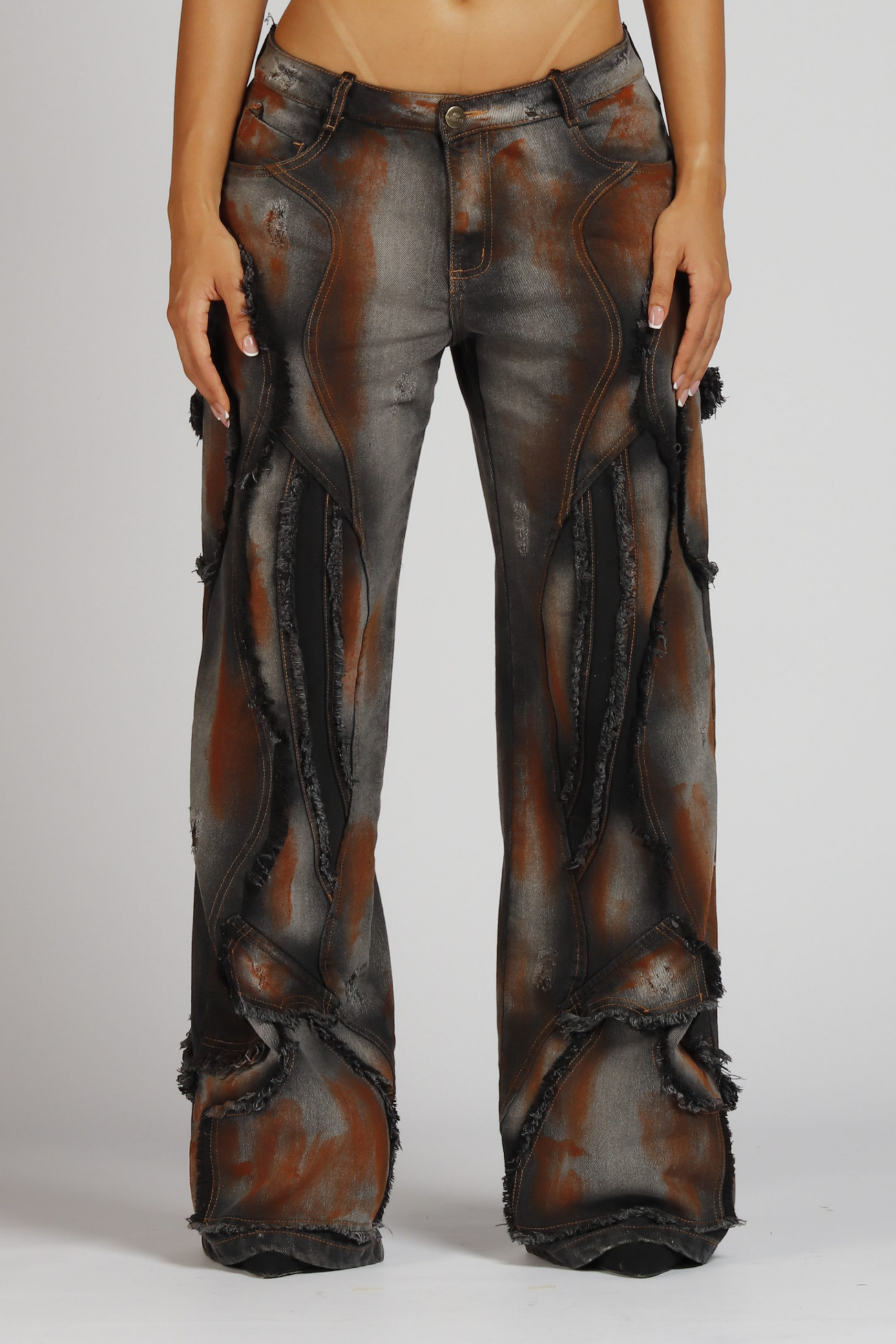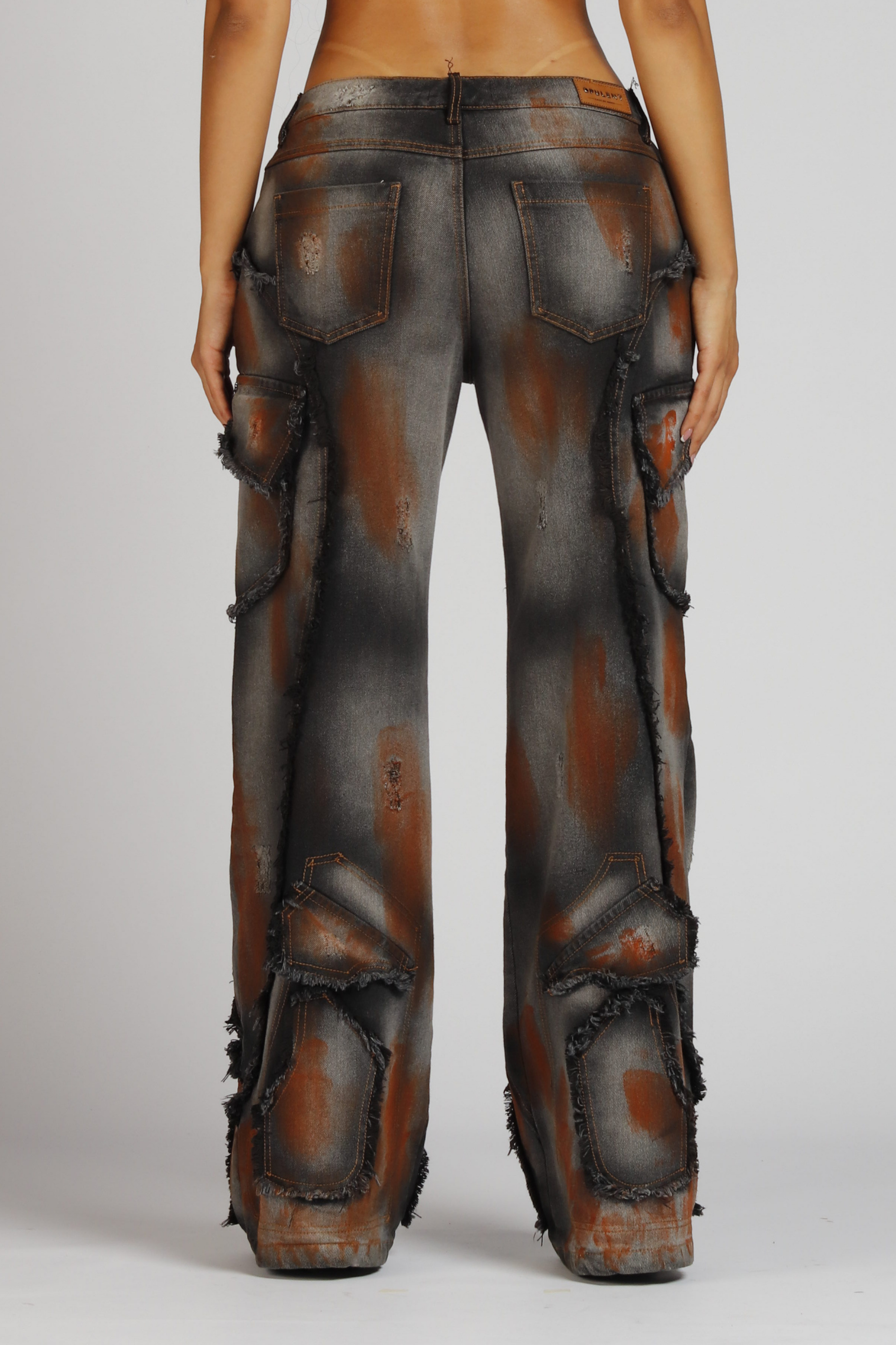 Modelo descaderado con una construcción que integra más de 30 cortes asimétricos y verticales. Presenta bolsillos traseros y delanteros funcionales, además de piezas desflecadas y costuras visibles que refuerzan el carácter artesanal de la prenda.