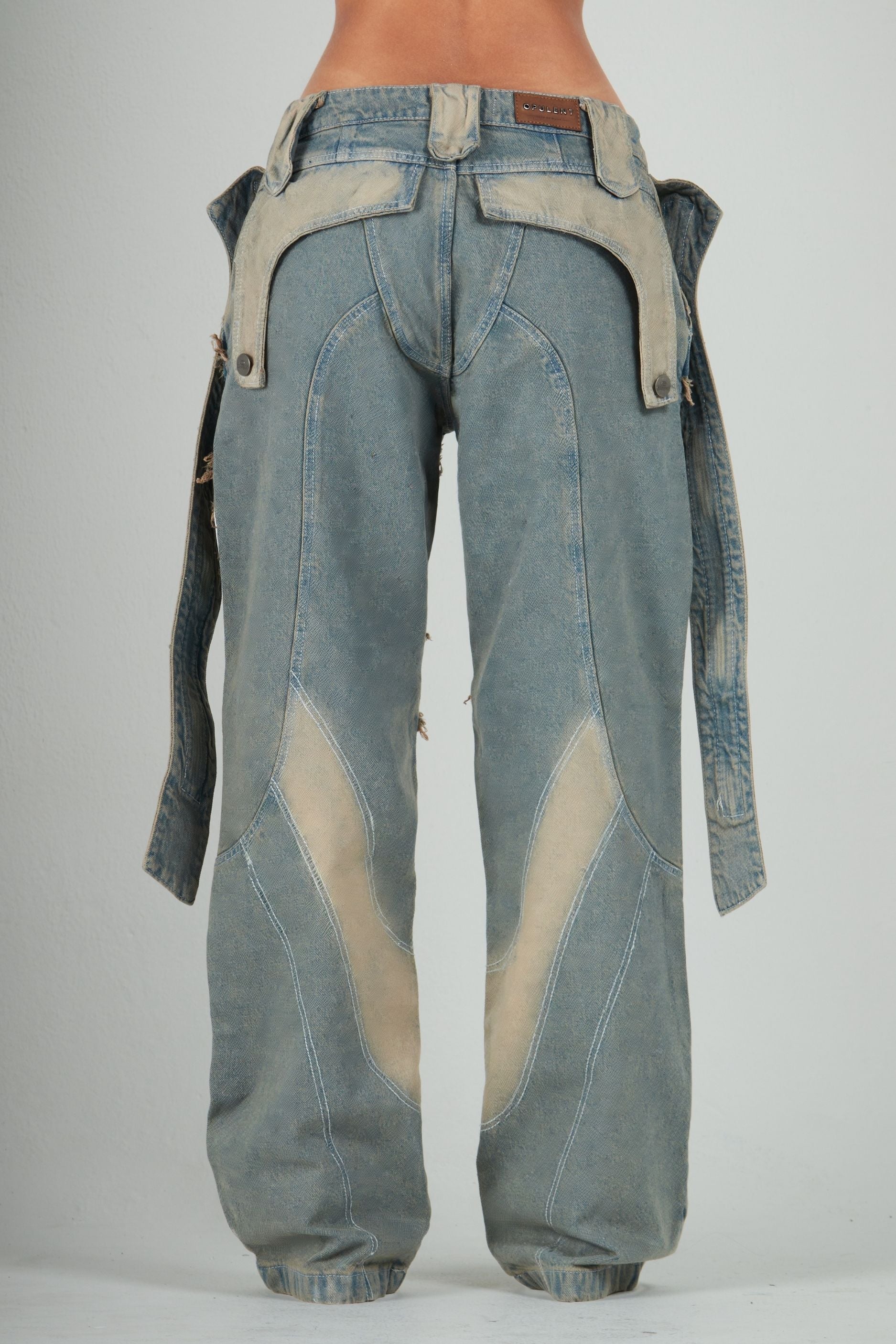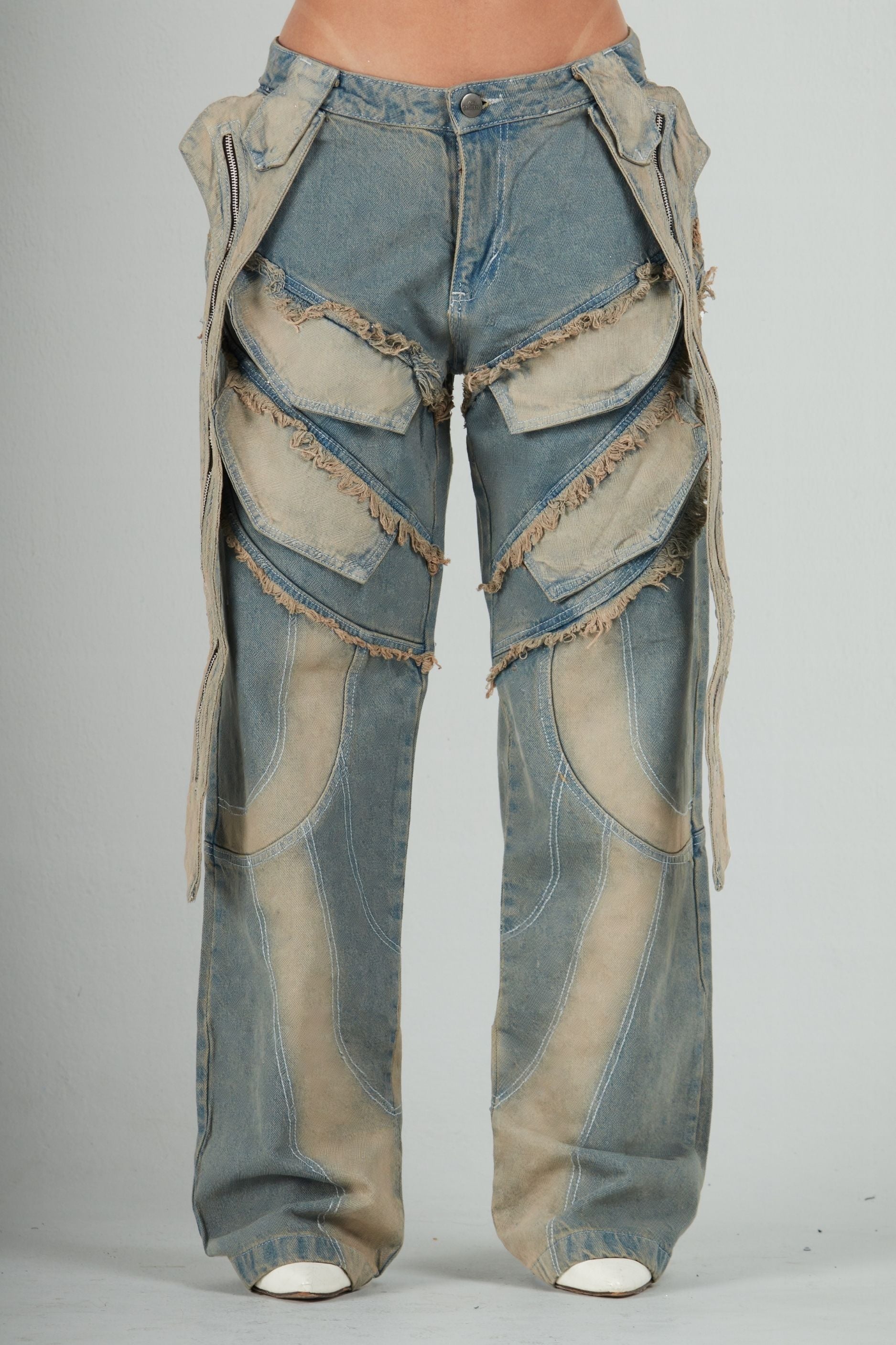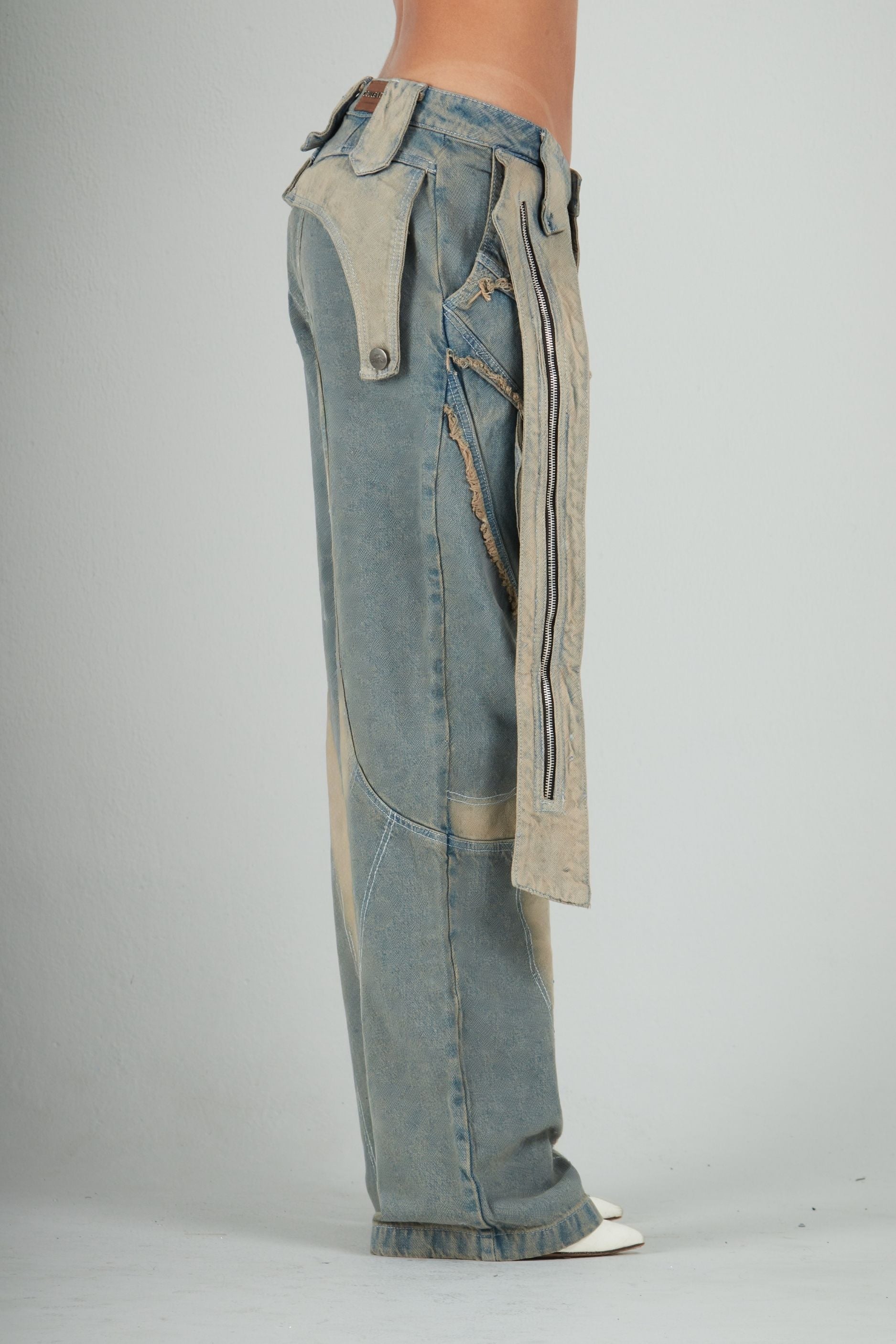 Confeccionado en índigo 100% algodón, este modelo descaderado integra detalles distintivos que consolidan su identidad. Presenta cierres verticales funcionales, botón contramarcado y piezas con desfleque, acompañadas de cortes con costuras visibles que refuerzan su carácter artesanal.