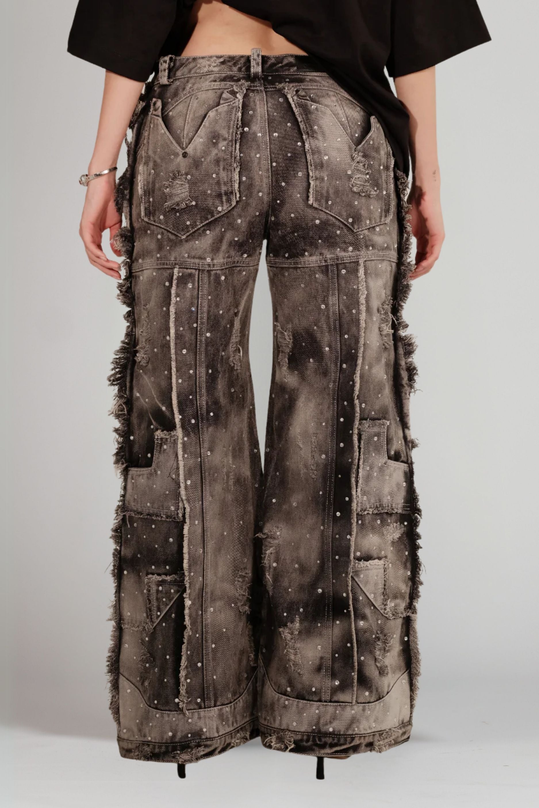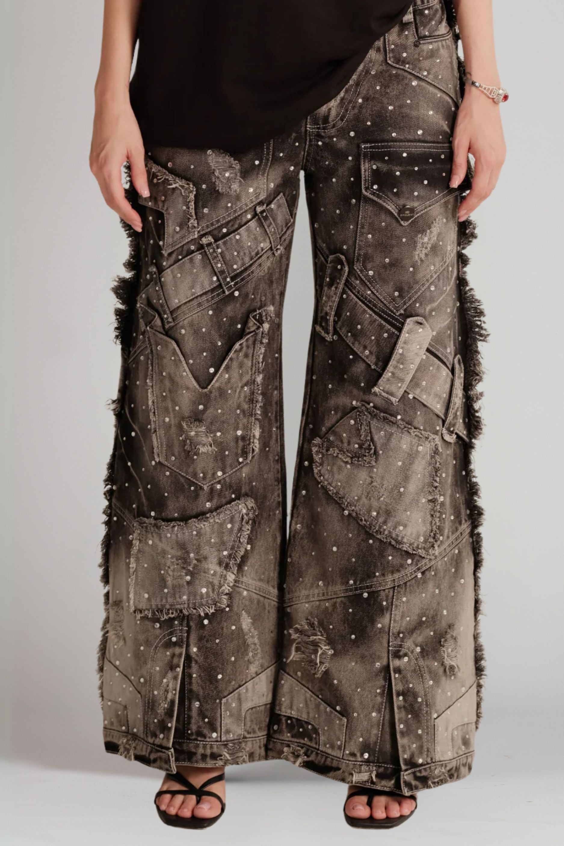 Intervenido con pedrería cristal aplicada a mano, este modelo descaderado está confeccionado en índigo premium 100% algodón. Su construcción integra cortes asimétricos y detalles exclusivos en la bota, que realzan su carácter artesanal.