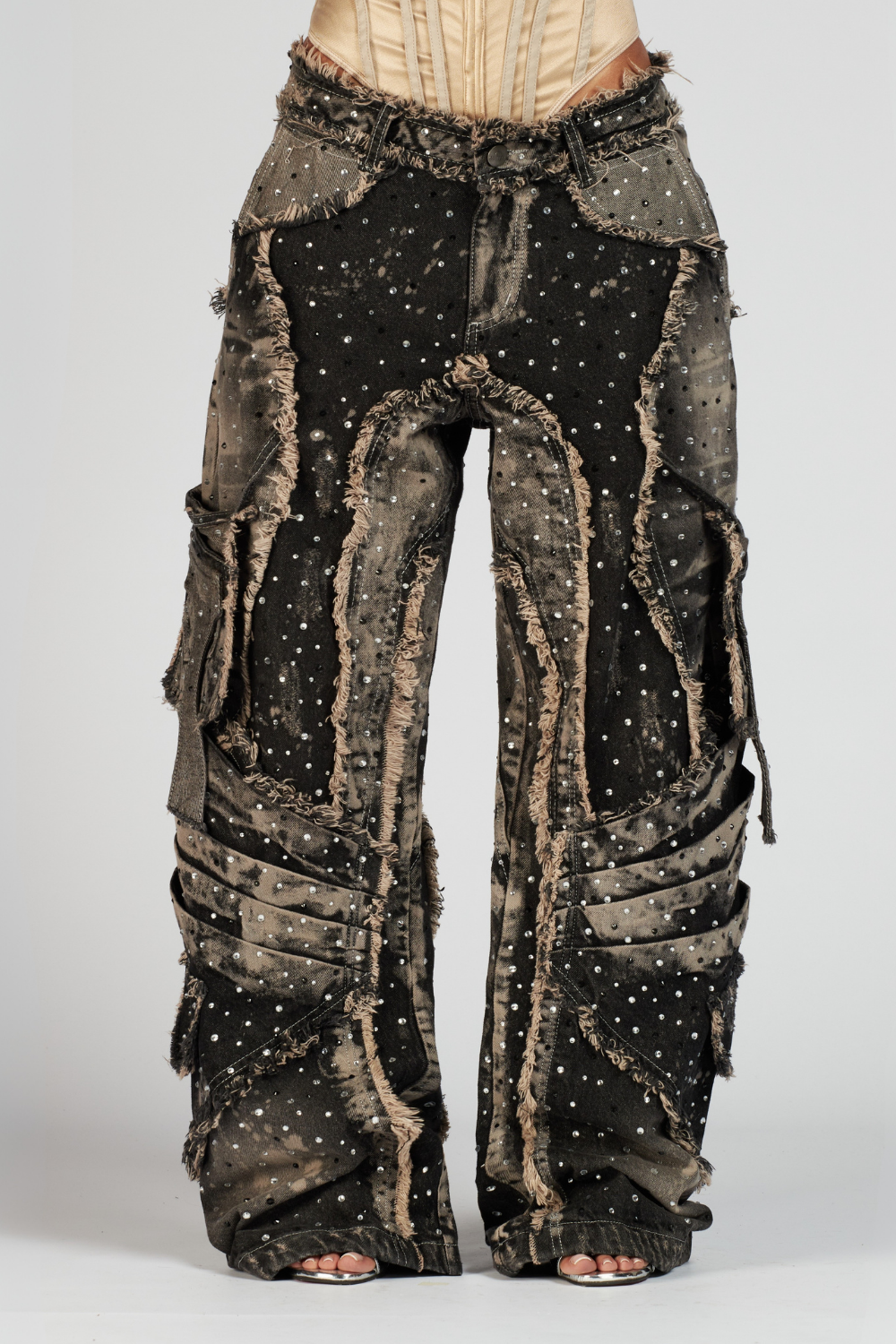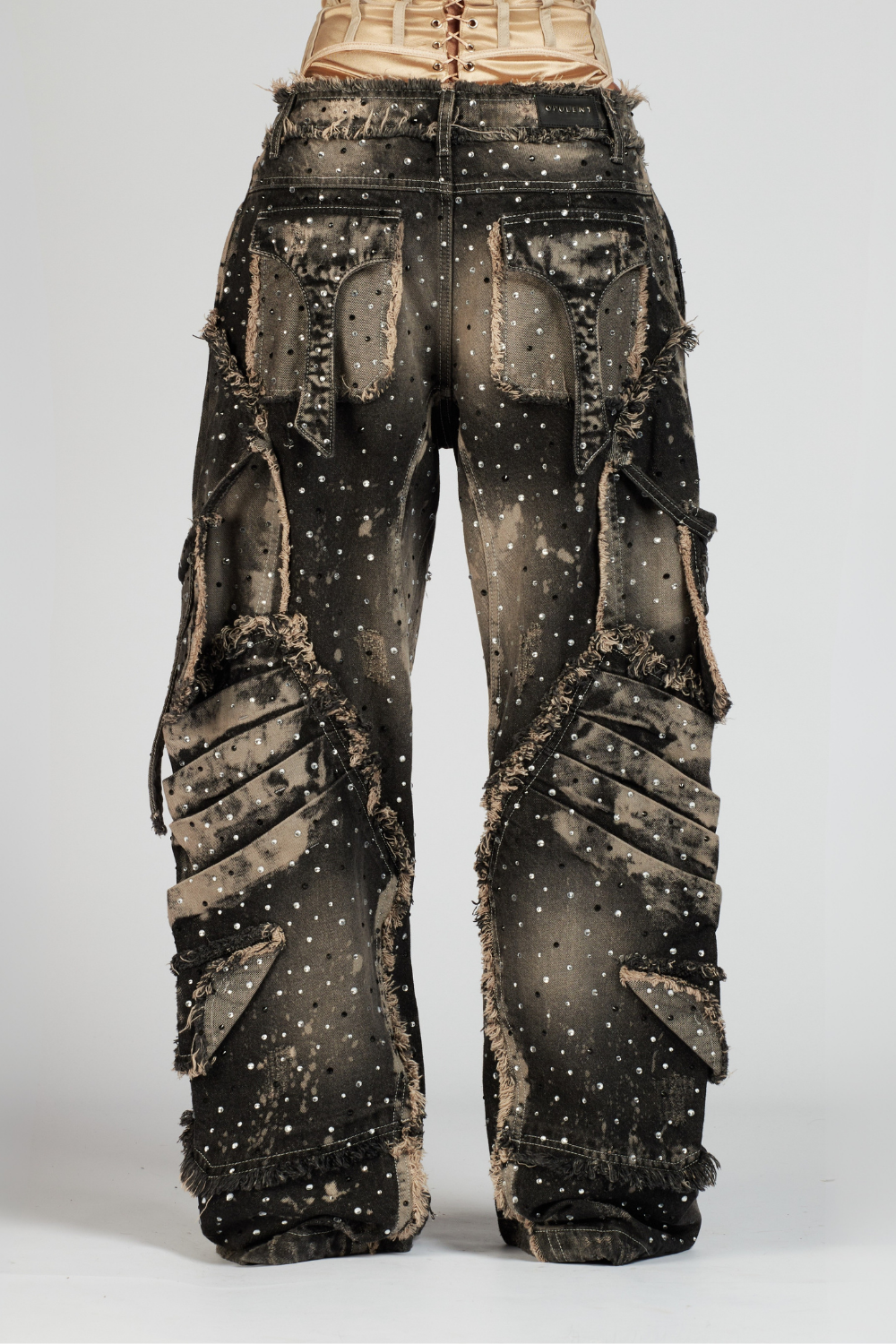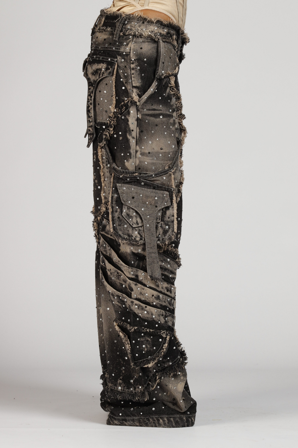 Intervenido con pedrería cristal aplicada a mano, este modelo descaderado incluye bragueta y botón contramarcado. Su construcción integra bolsillos colgantes en los laterales, un grapeado en la parte inferior de las botas y múltiples cortes asimétricos, que aportan complejidad al diseño.