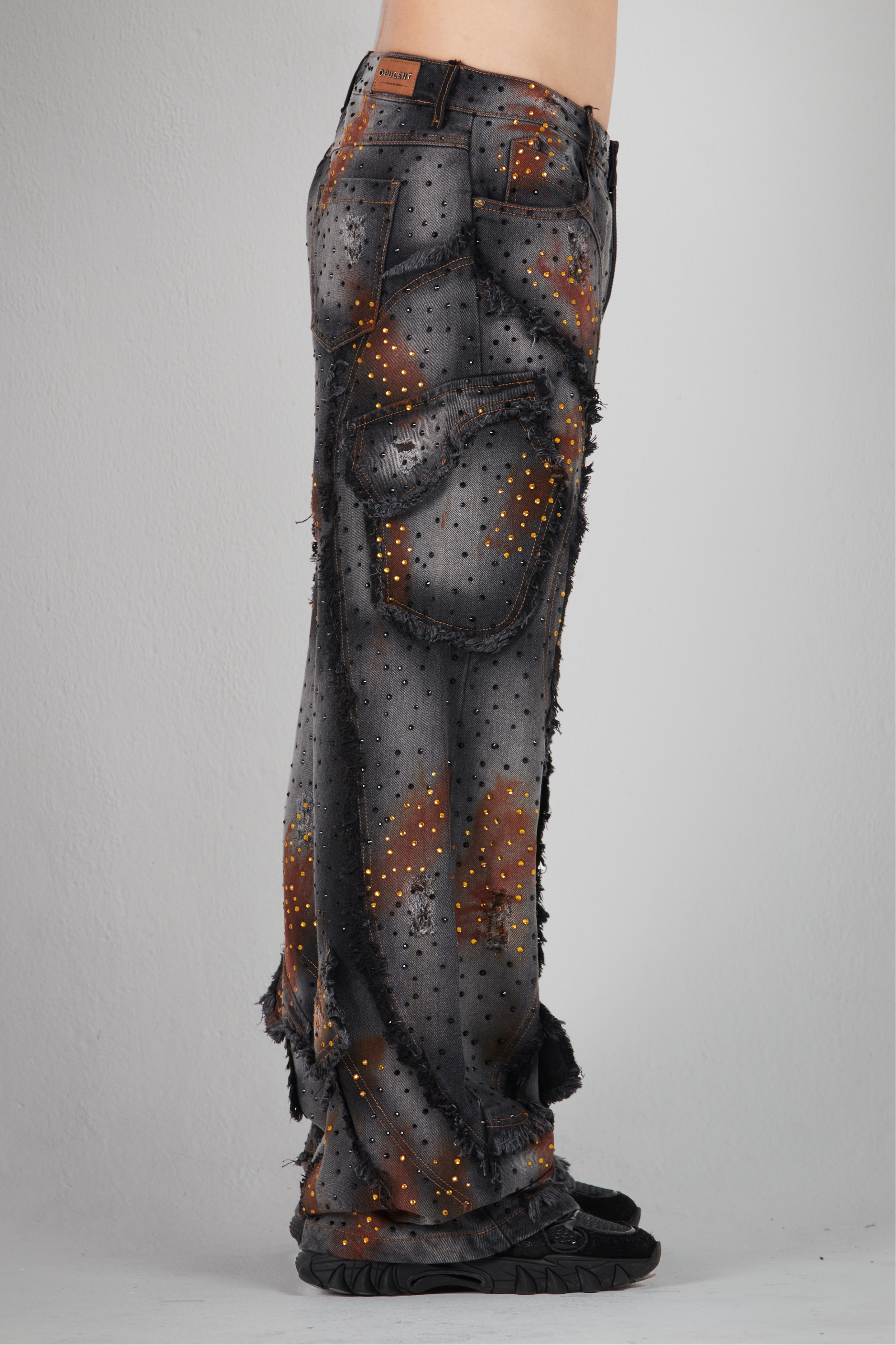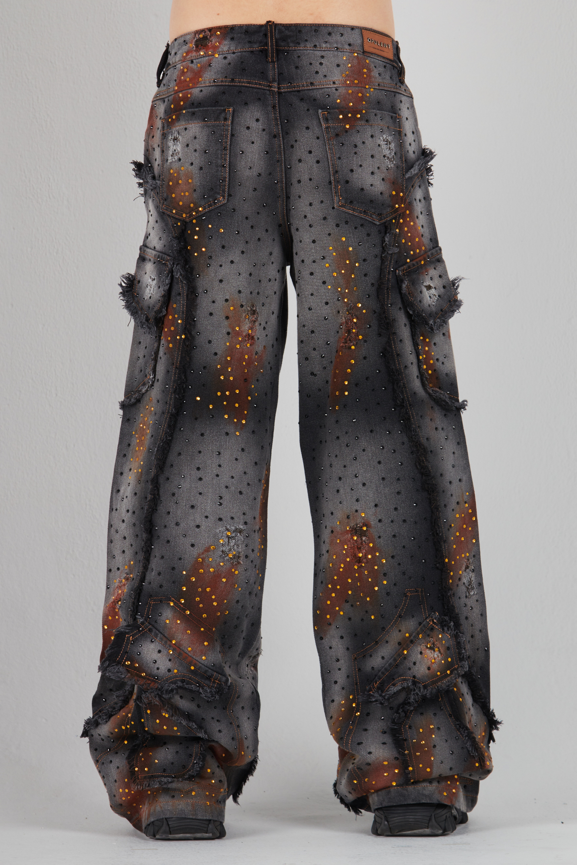 Incrustado con pedrería, este modelo descaderado con una construcción que integra más de 30 cortes asimétricos y verticales. Presenta bolsillos traseros y delanteros funcionales, además de piezas desflecadas y costuras visibles que refuerzan el carácter artesanal de la prenda.