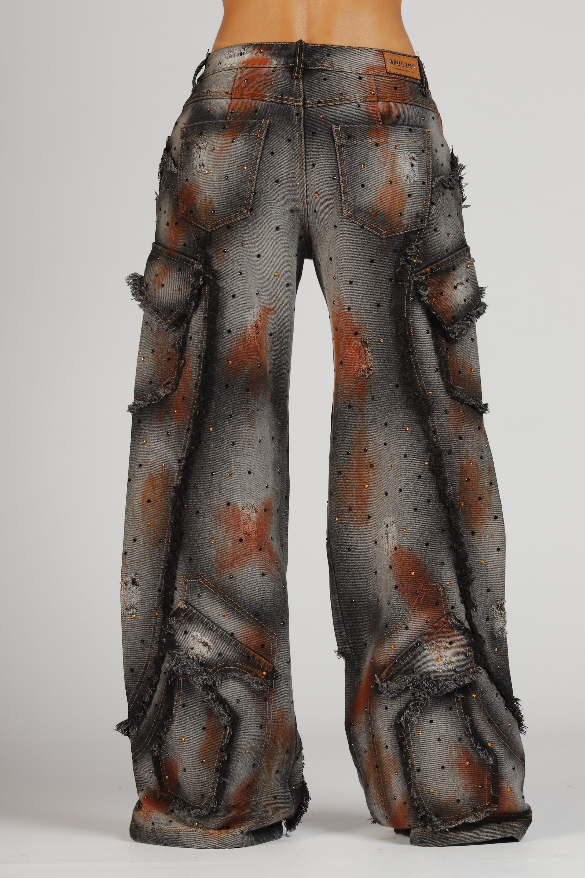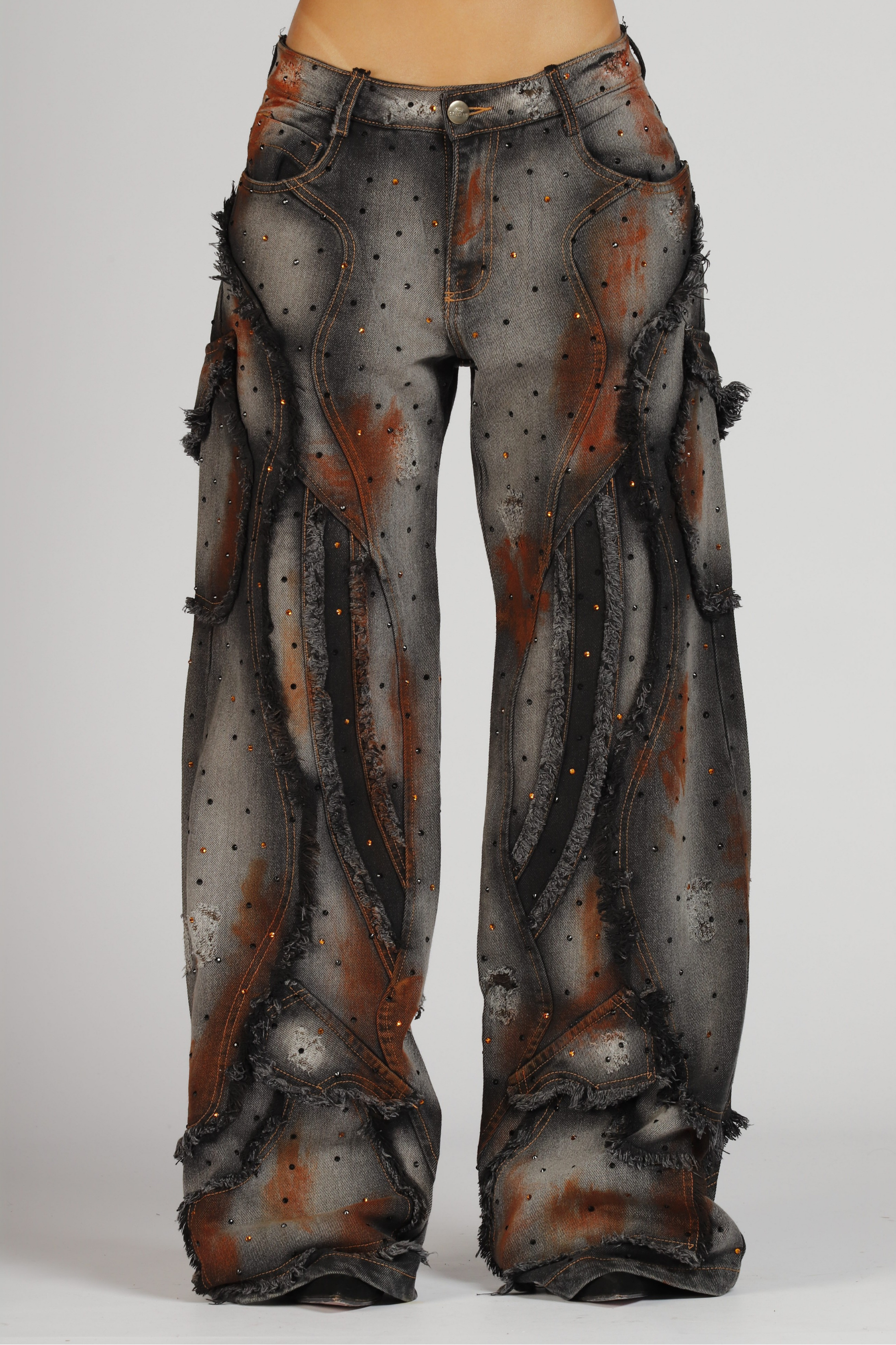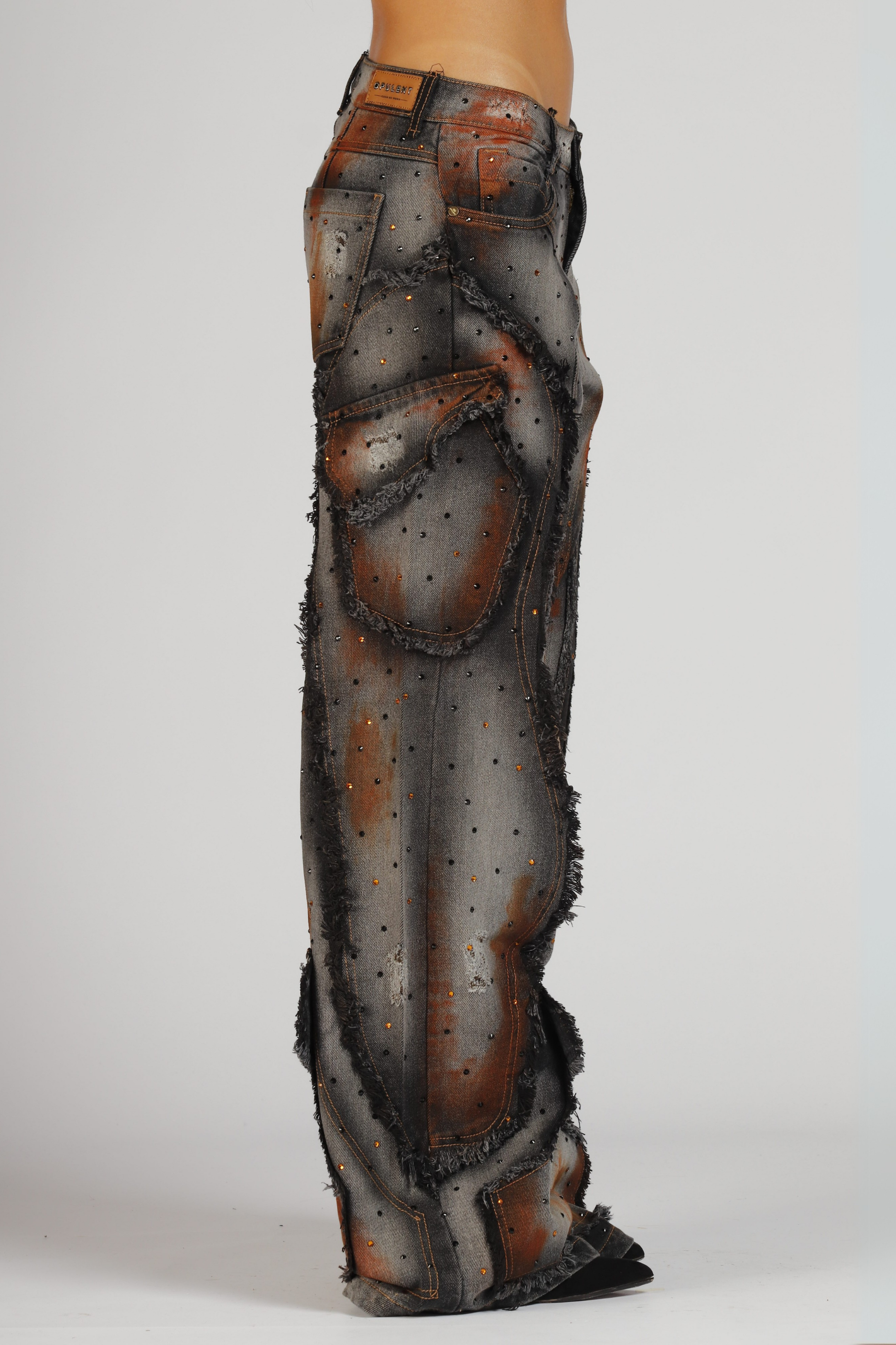 Incrustado con pedrería , este modelo descaderado con una construcción que integra más de 30 cortes asimétricos y verticales. Presenta bolsillos traseros y delanteros funcionales, además de piezas desflecadas y costuras visibles que refuerzan el carácter artesanal de la prenda.