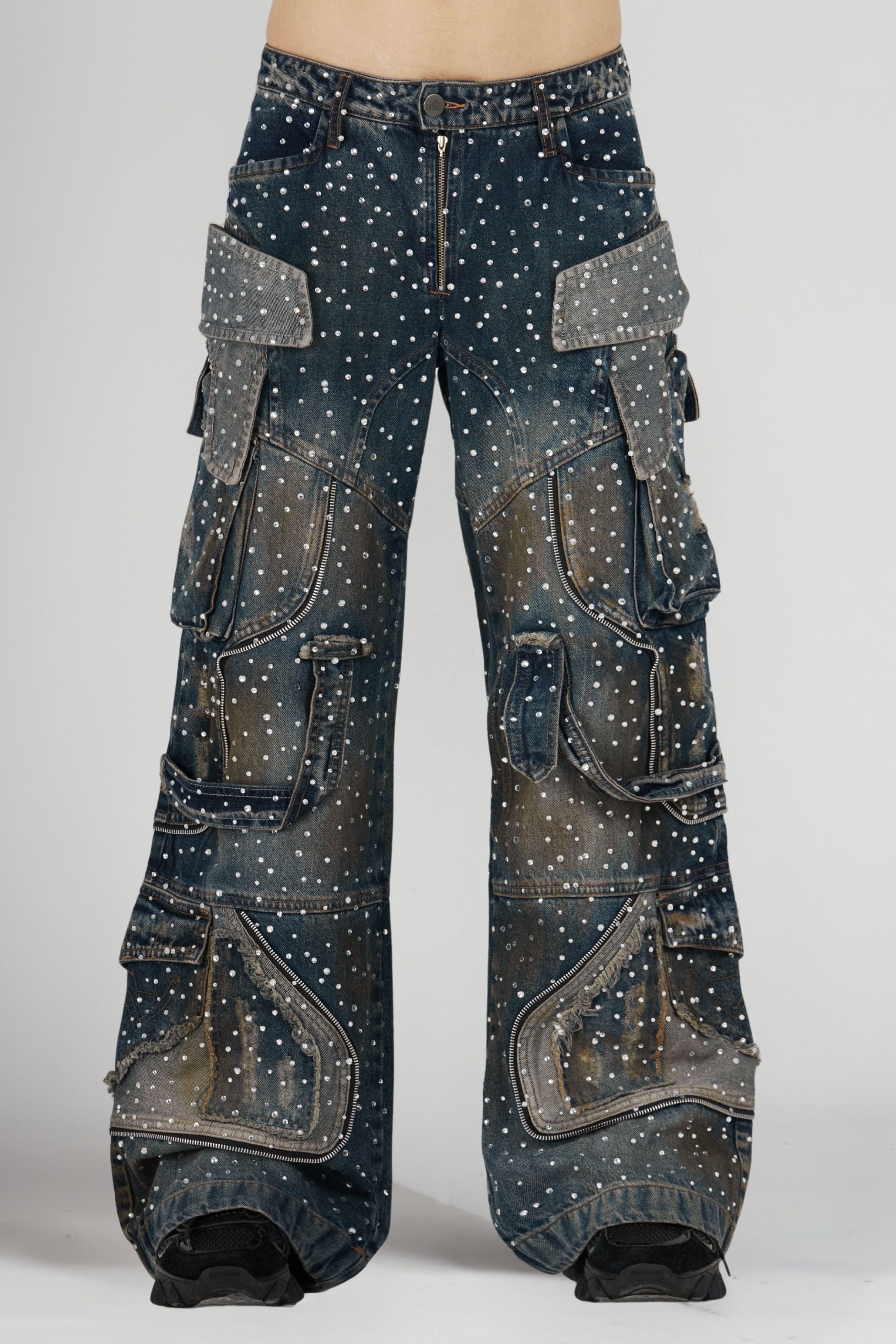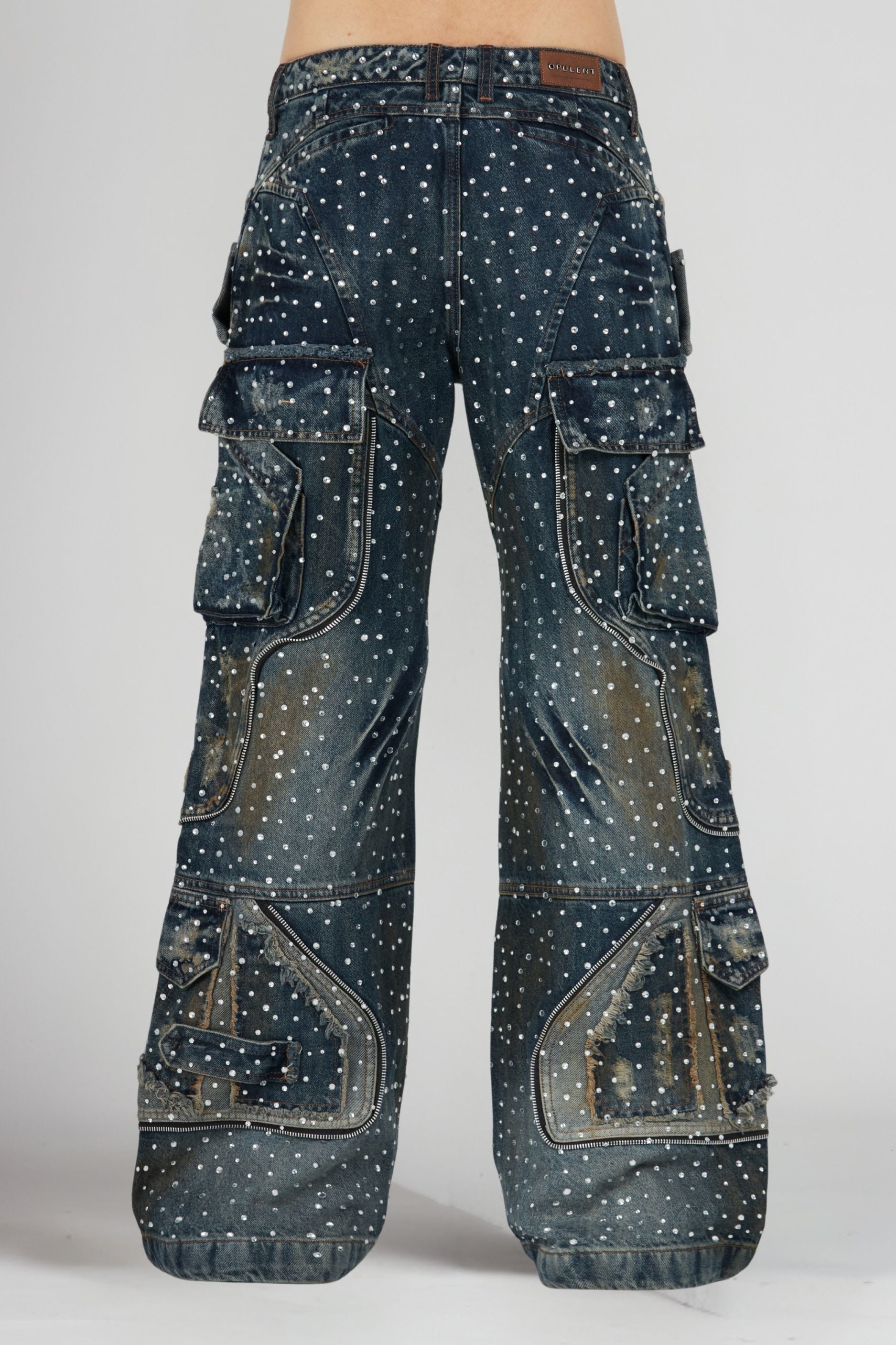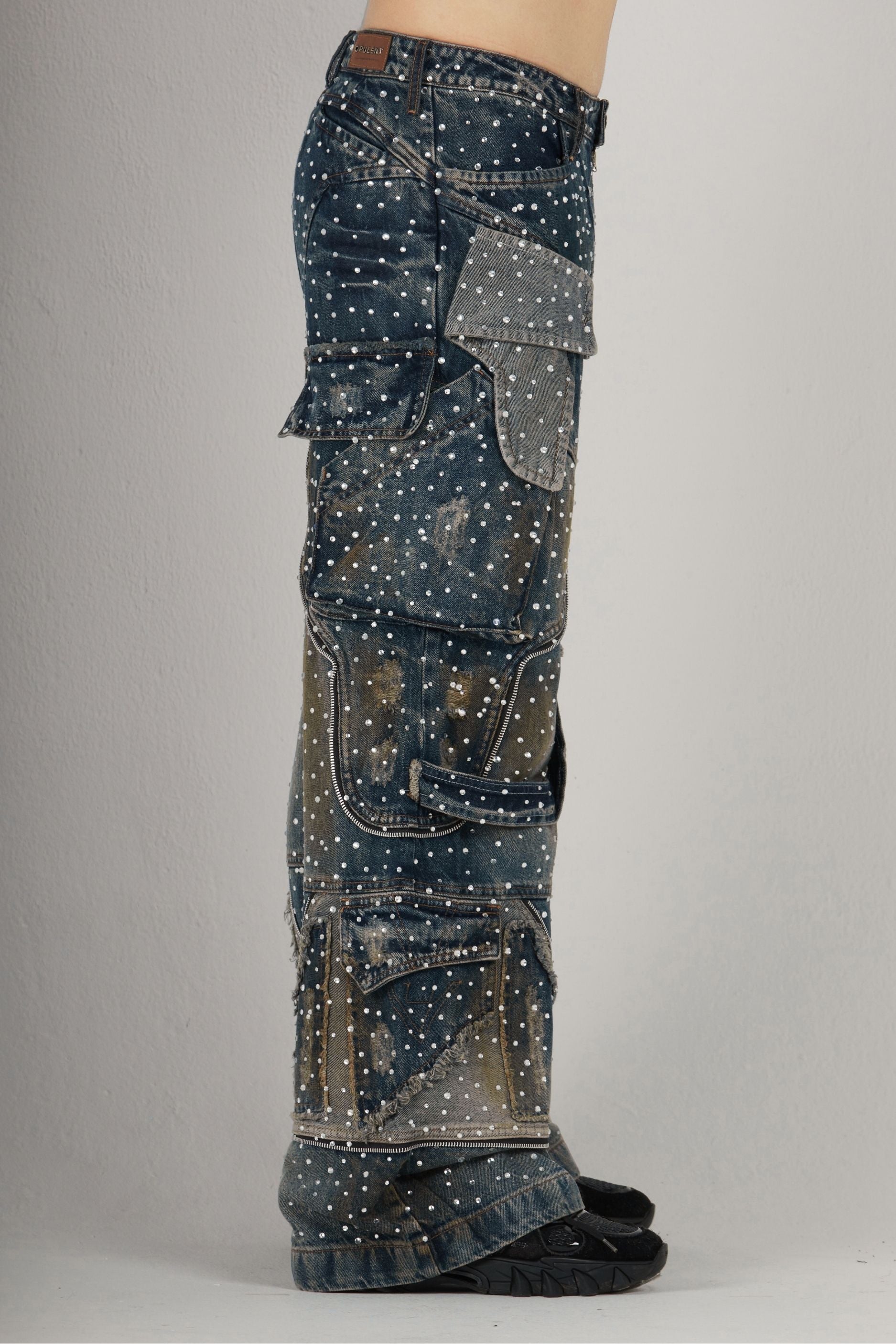 Intervenido con pedrería cristal aplicada a mano, este modelo incorpora cintas con cierres funcionales, además de cortes asimétricos que refuerzan su carácter único. Incluye bolsillos traseros tipo ribete, botón contramarcado, piezas con desfleque y costuras visibles que consolidan su diseño artesanal.