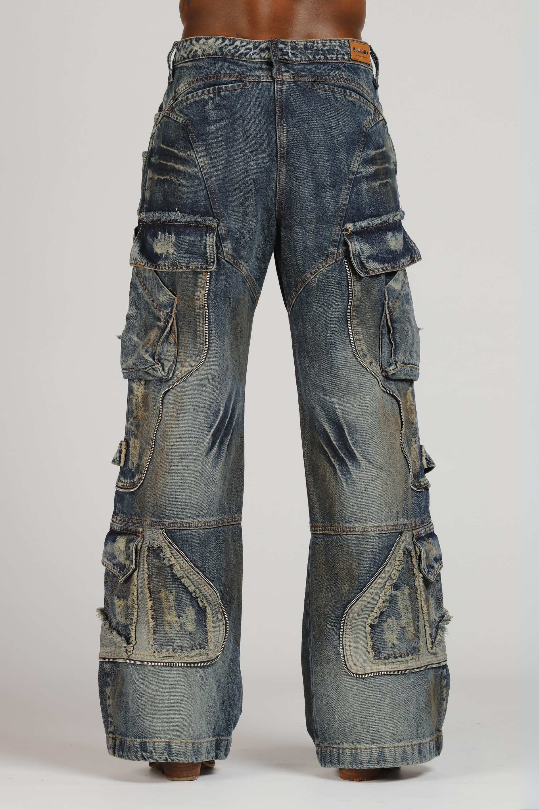 Este modelo incorpora cintas con cierres funcionales, además de cortes asimétricos que refuerzan su carácter único. Incluye bolsillos traseros tipo ribete, botón contramarcado, piezas con desfleque y costuras visibles que consolidan su diseño artesanal.