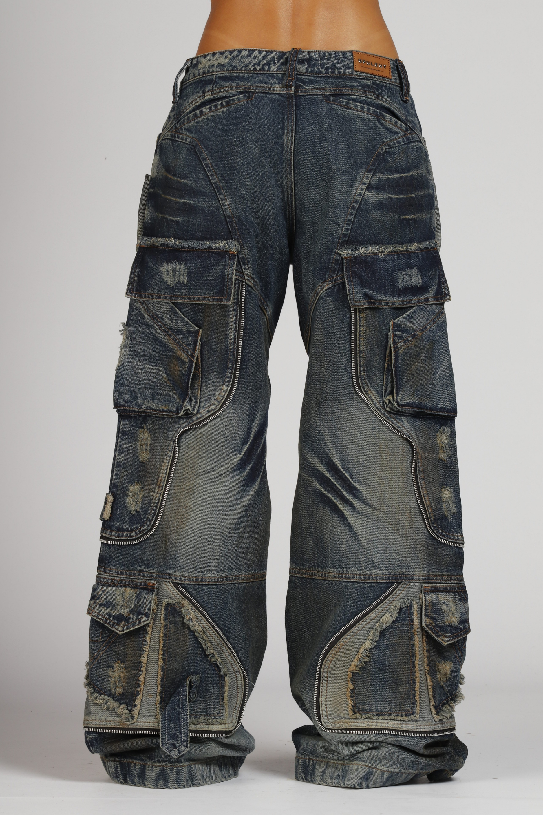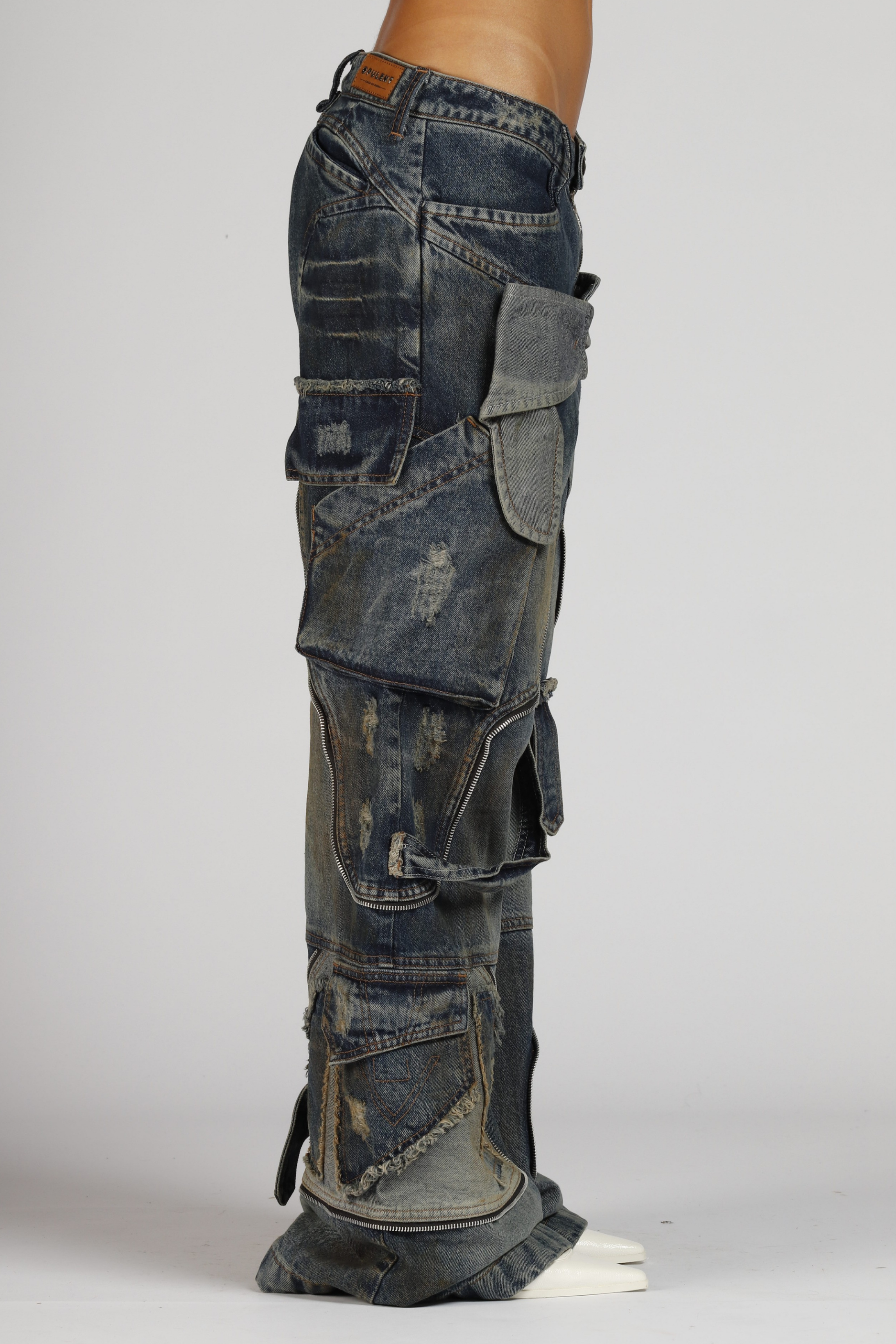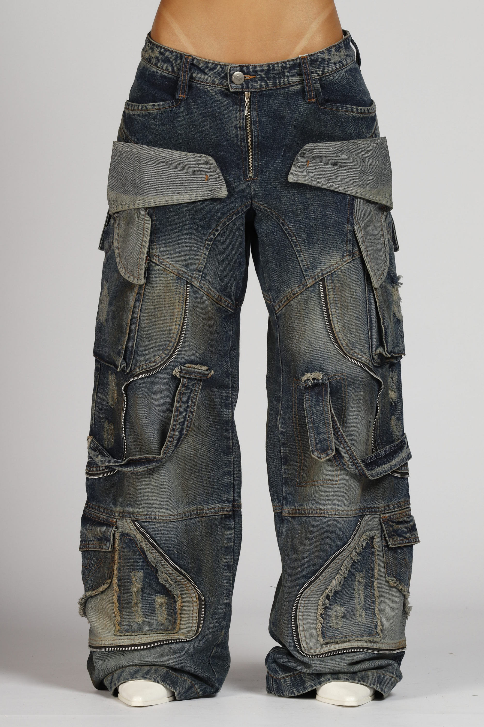 Este modelo descaderado incorpora cintas con cierres y una construcción con cortes asimétricos que le aportan carácter y distinción. Incluye bolsillos traseros tipo ribete, botón contramarcado, piezas con desfleque y costuras visibles que refuerzan su diseño artesanal.