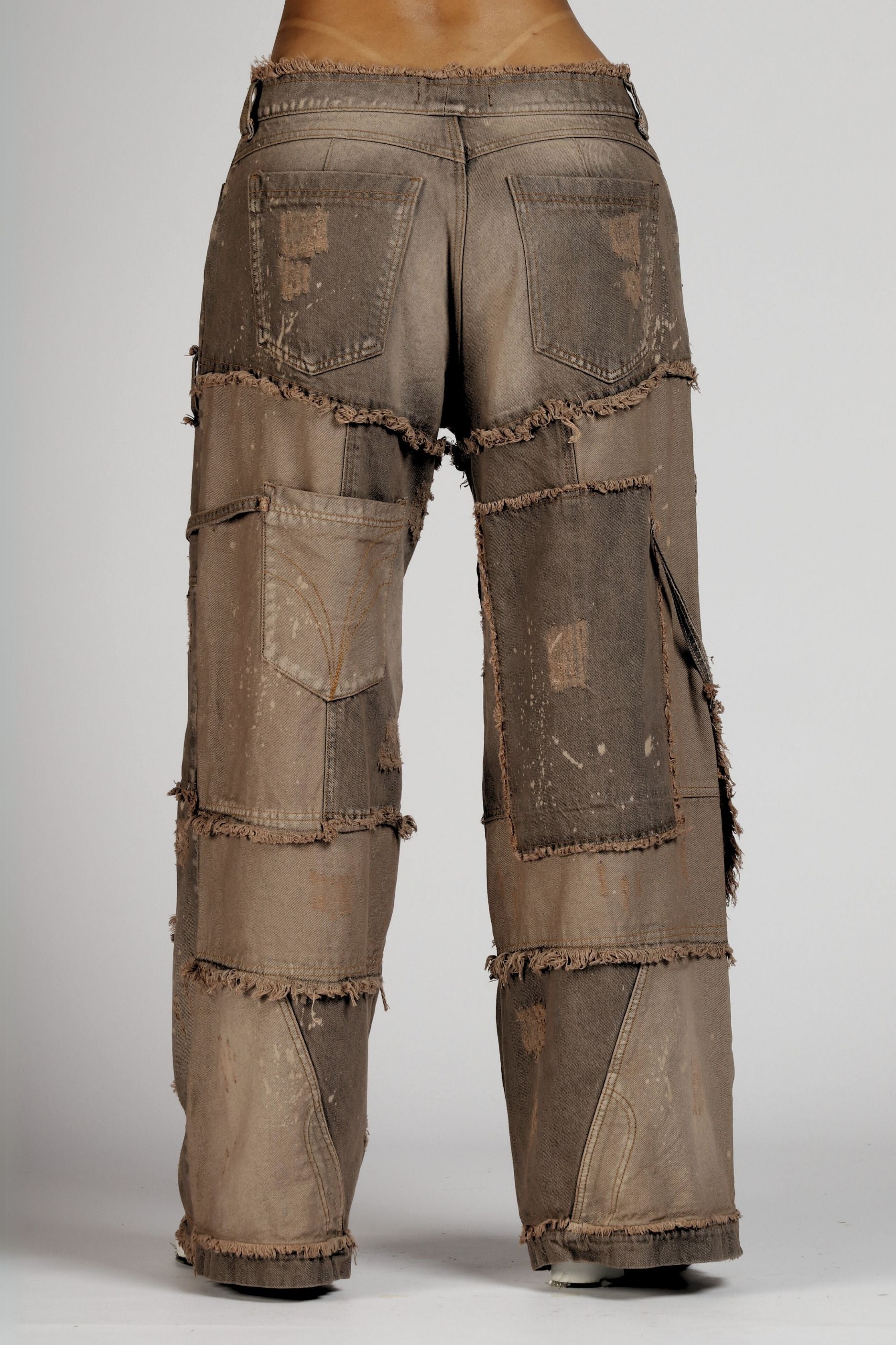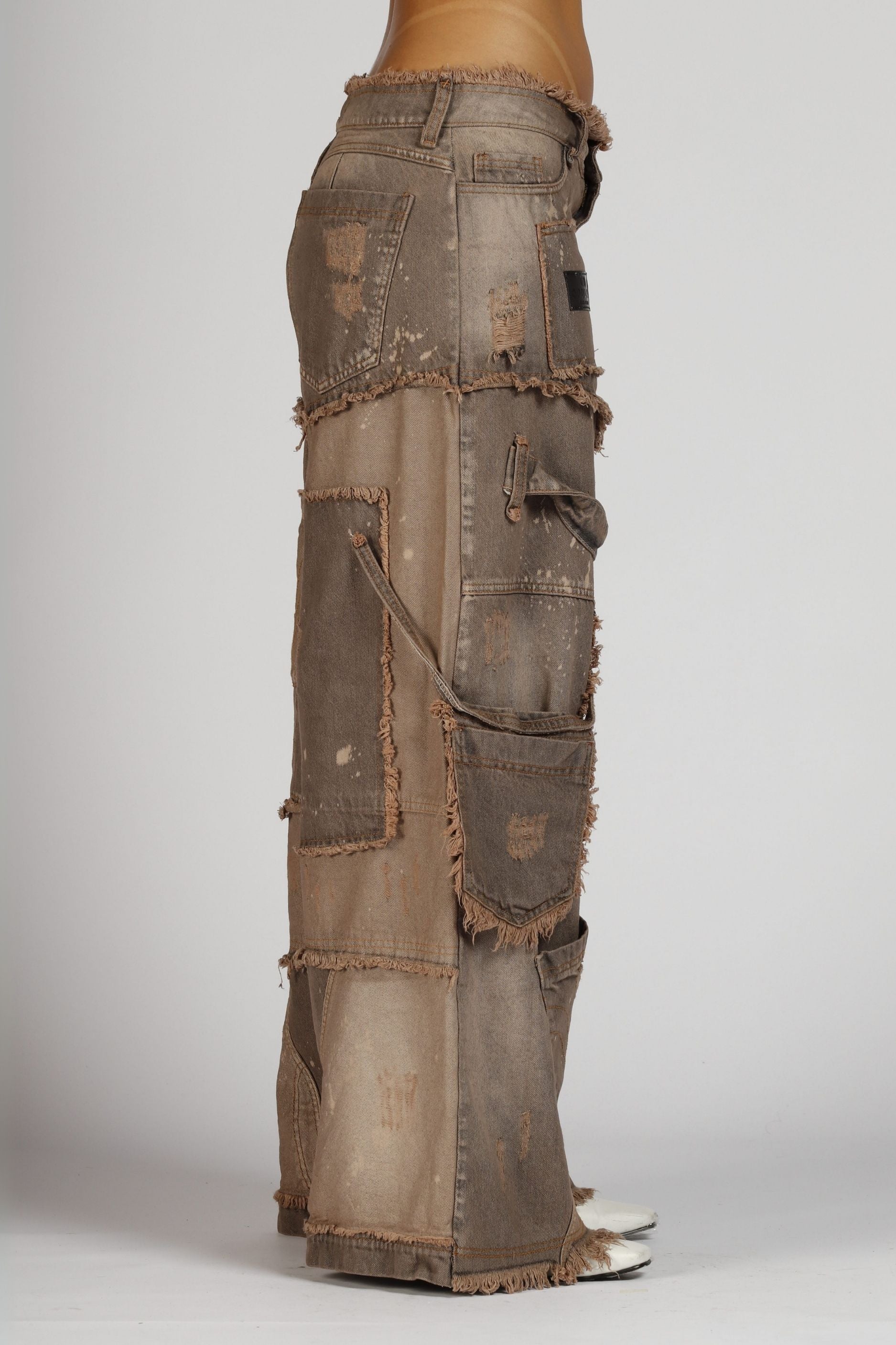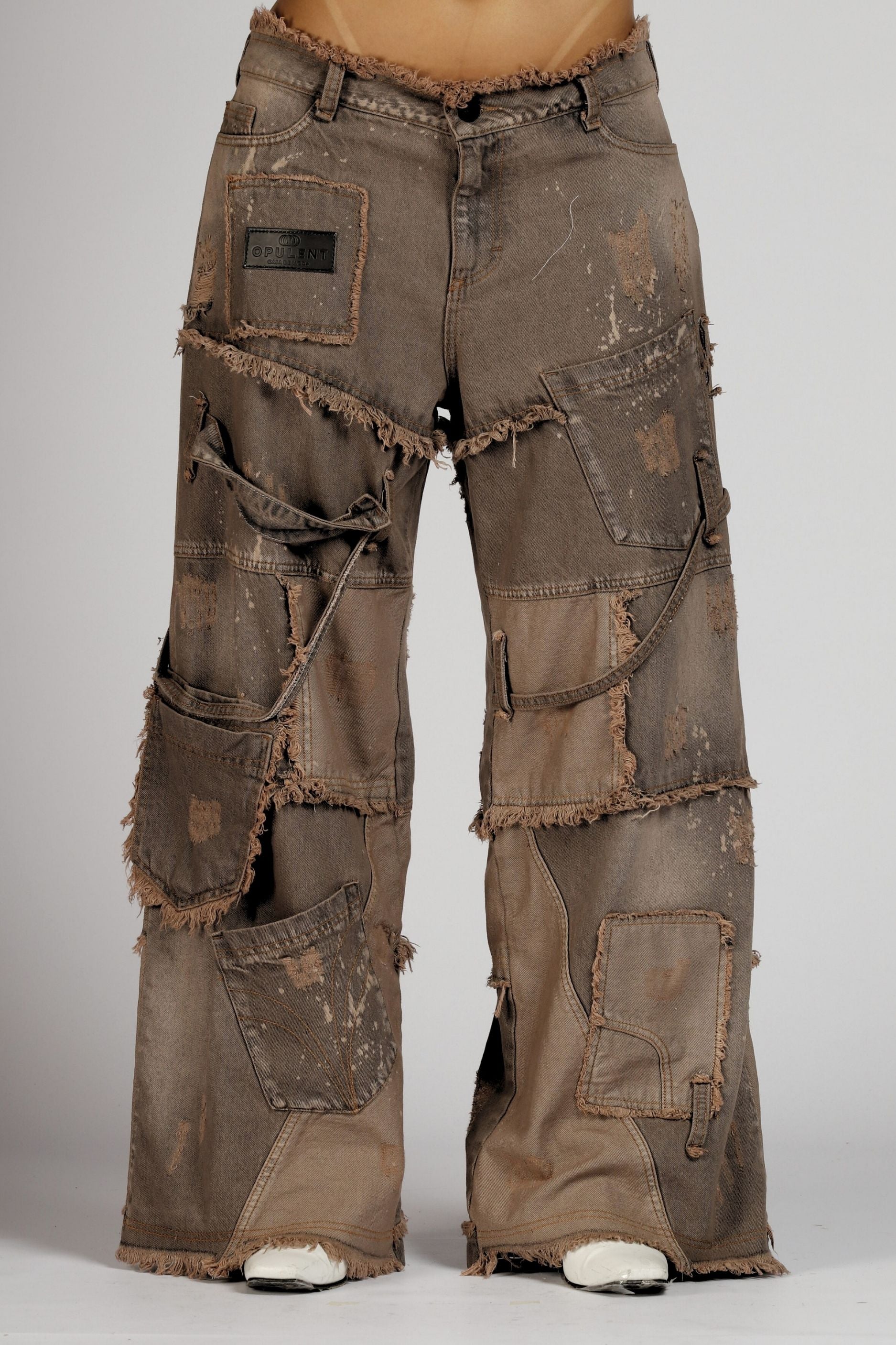Modelo descaderado con una construcción que integra más de 30 cortes, pensados para aportar complejidad y detalle. Incorpora un bolsillo aéreo, un sesgo en denim colgante, además de un botón contramarcado con el logo OPULENT y una garra metálica trasera, distintivos de la marca.