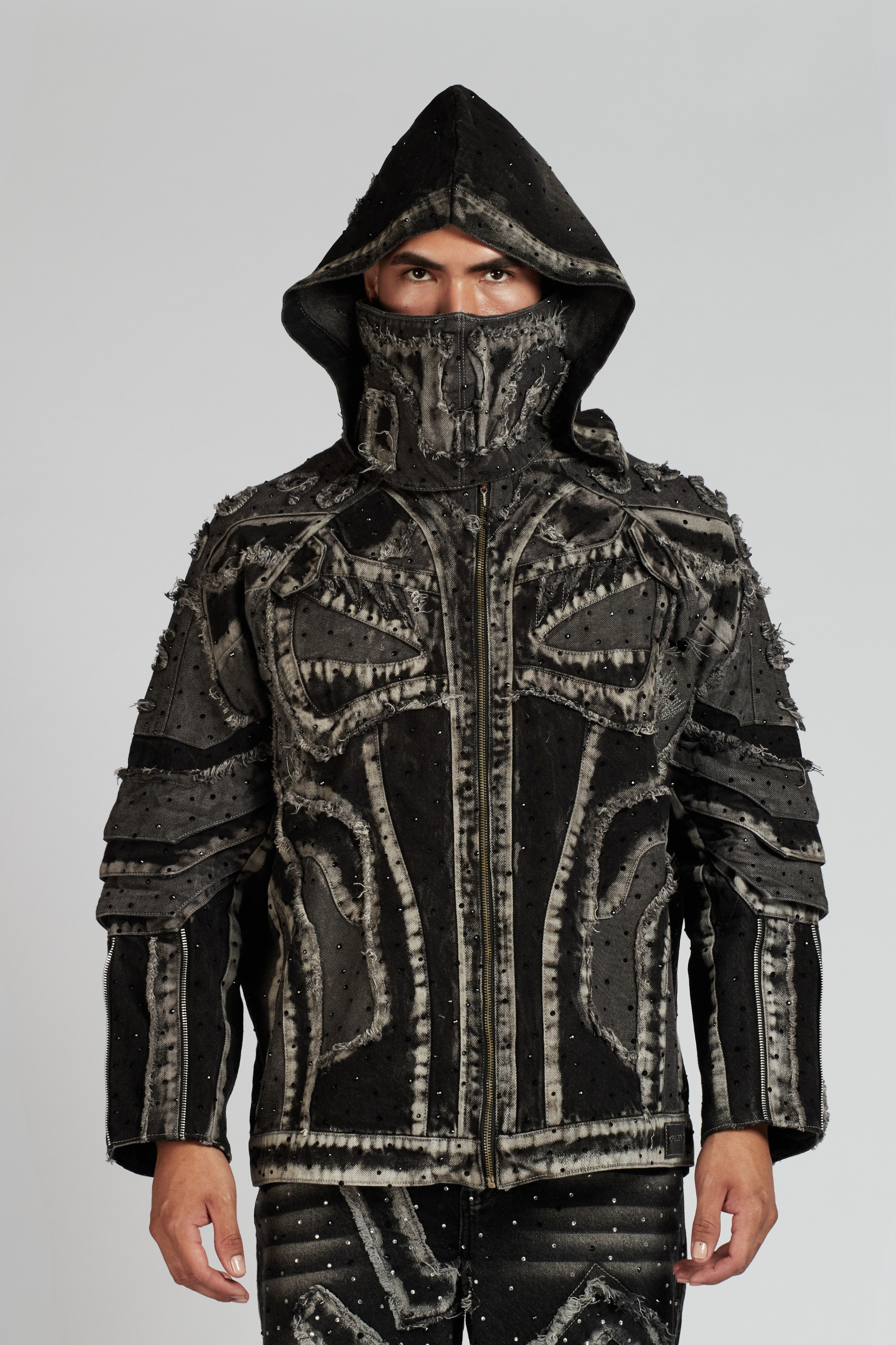Una pieza de diseño único que fusiona estilo urbano y detalle artesanal. Elaborada en tono negro con sombras blancas en los cortes, presenta un cierre frontal y detalles que marcan la diferencia: capucha desmontable para mayor versatilidad y un cubrebocas estilo depredador removible, pensado para quienes buscan un look atrevido, tiene pedrería cristal pegada totalmente a mano.