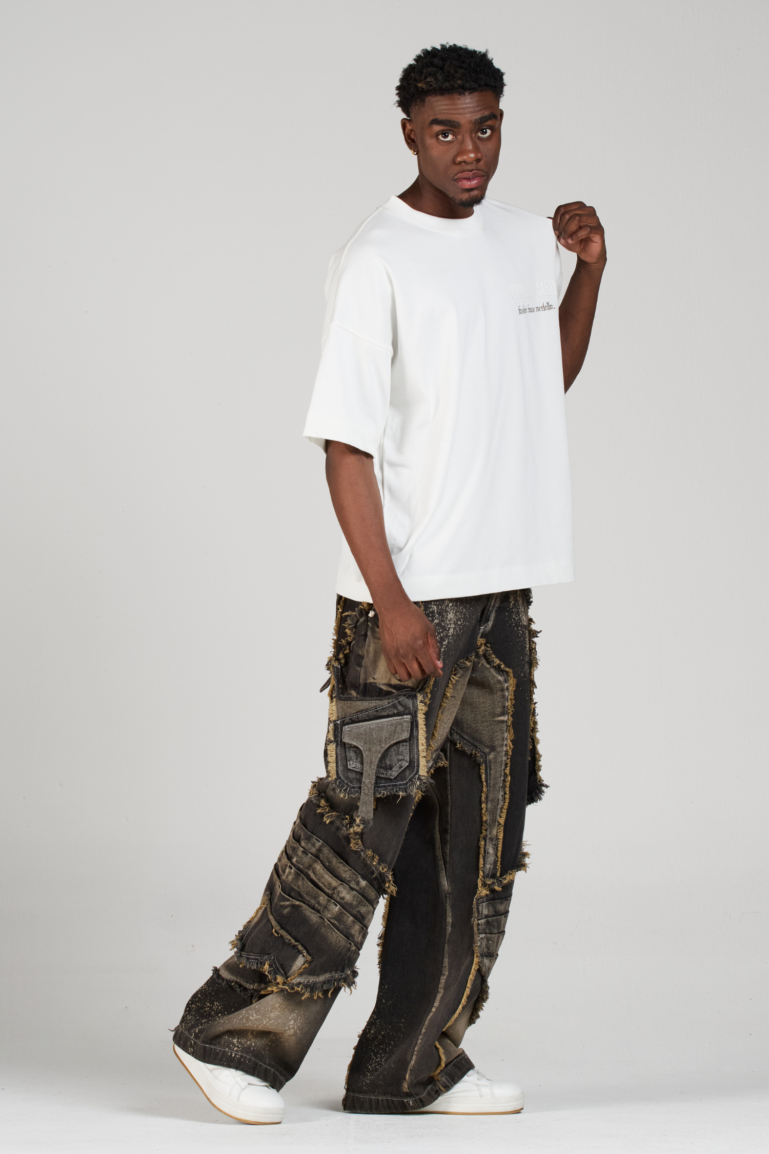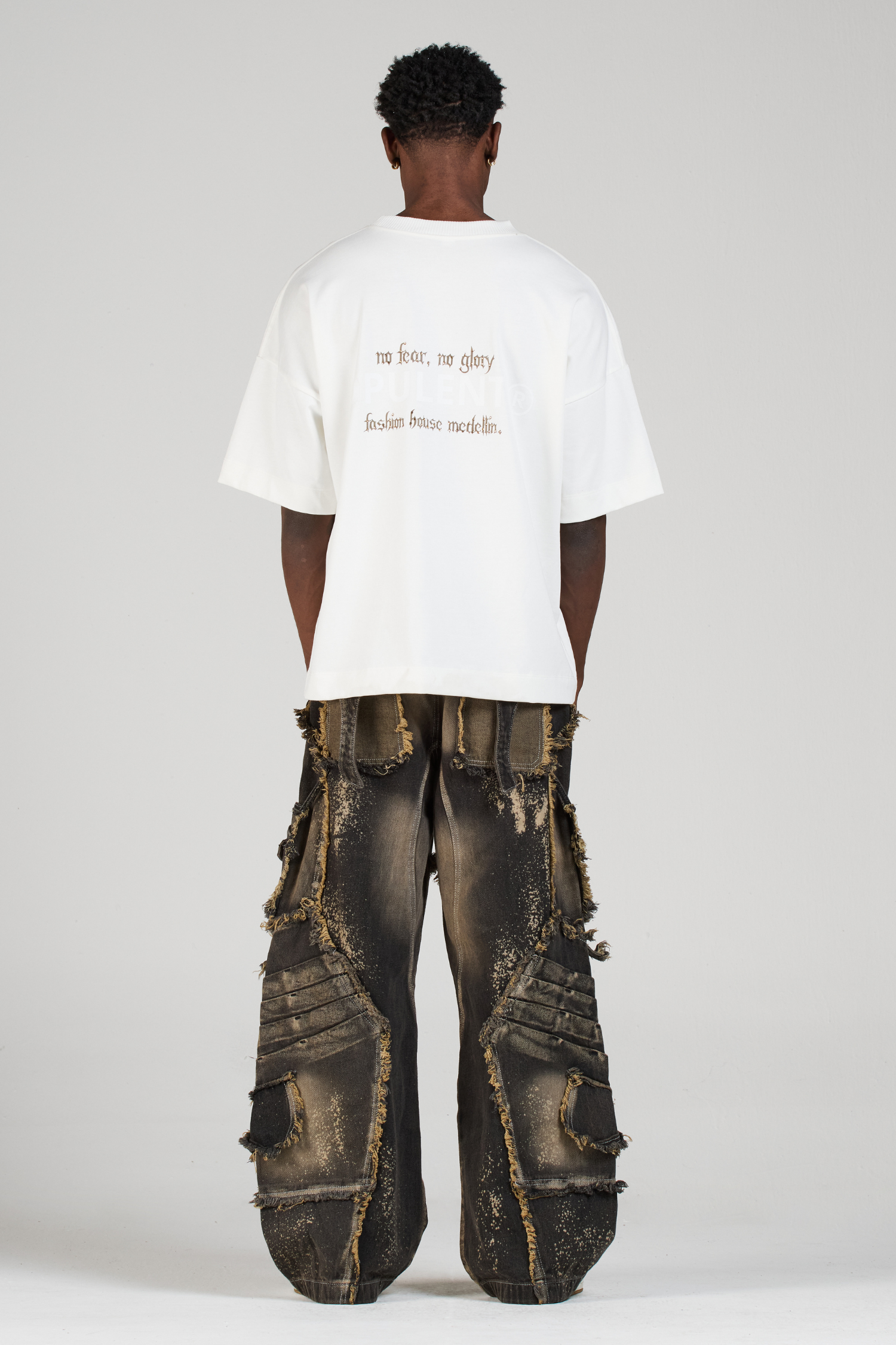 Diseño con tonos contramarcados, cortes asimétricos y grapeado en la parte inferior de las botas. Presenta detalles en desflecado que refuerzan la estética del denim apocalíptico y le aportan una identidad cruda y distintiva.