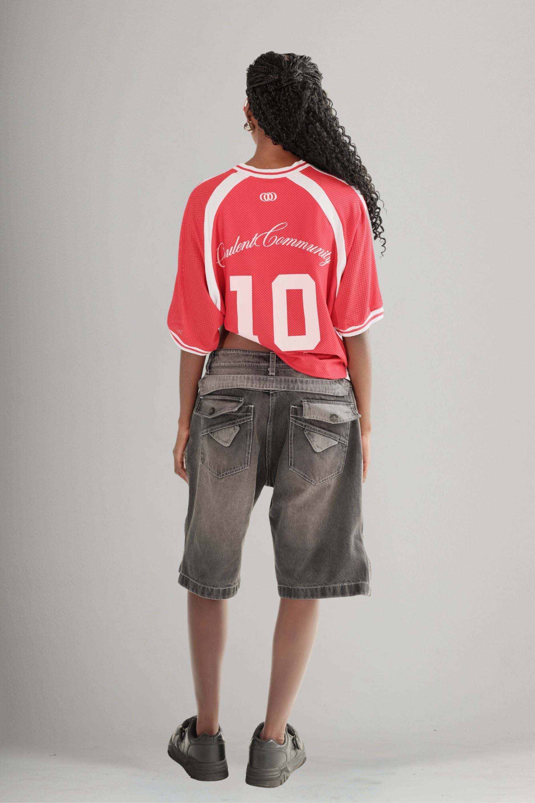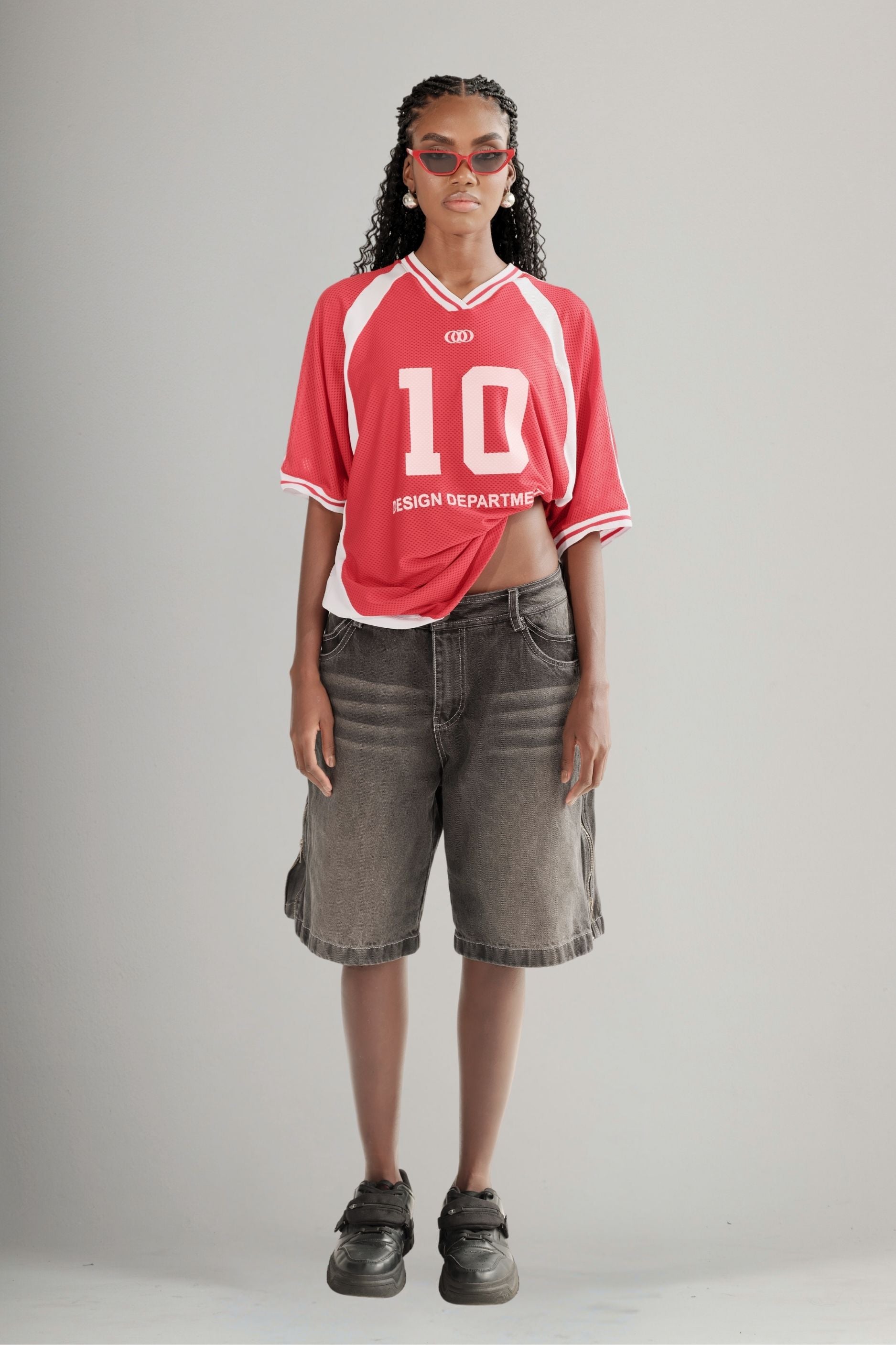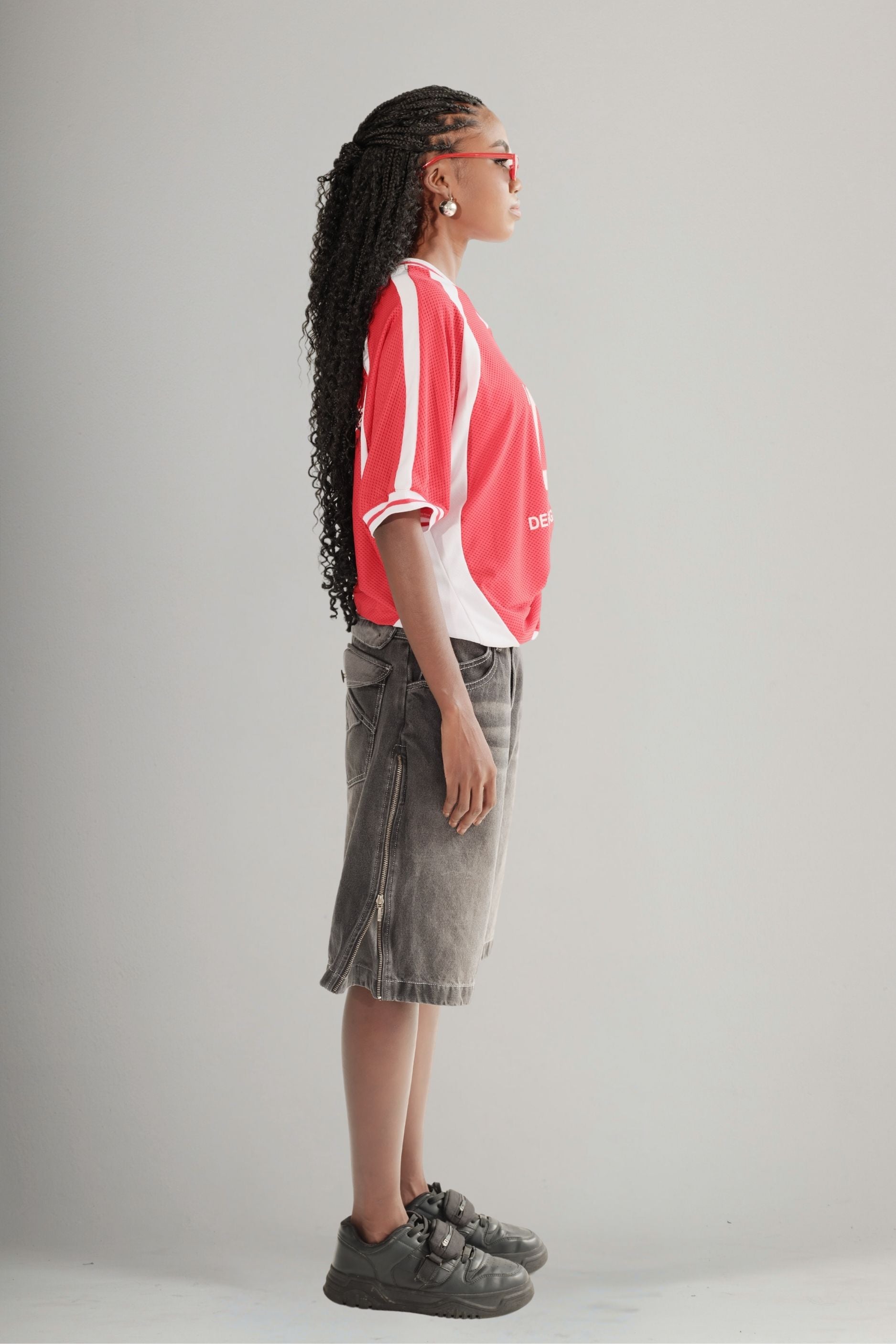 Confeccionada en tela de malla deportiva negra y blanca, pensada para frescura y resistencia. Incorpora cortes laterales y un forro interno que mejora la horma. Toda la estampación, frontal y trasera, está realizada en vinilo de alta densidad importado, garantizando durabilidad y definición. El cuello tejido mantiene la estructura y las mangas en el mismo tejido aportan comodidad adicional.