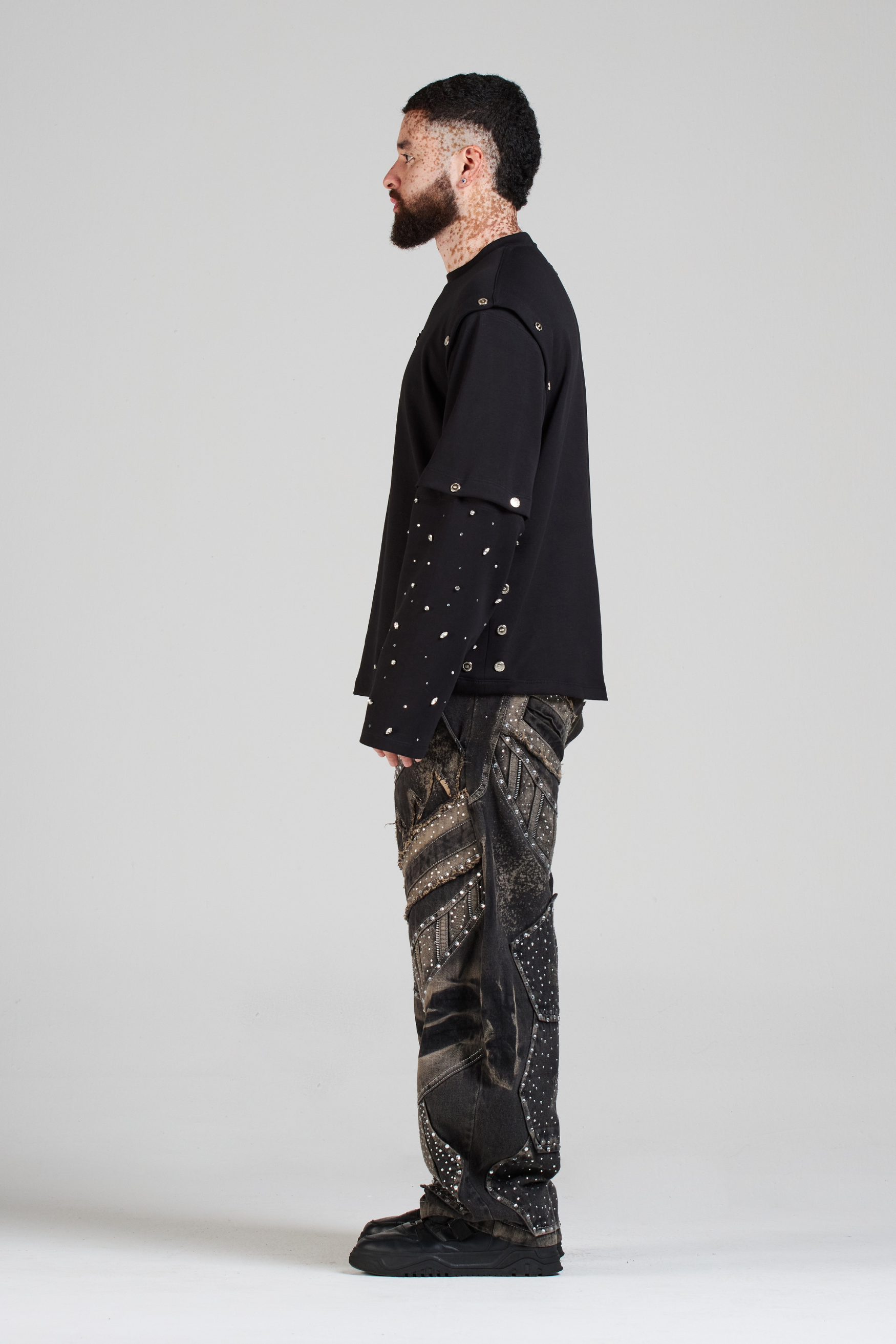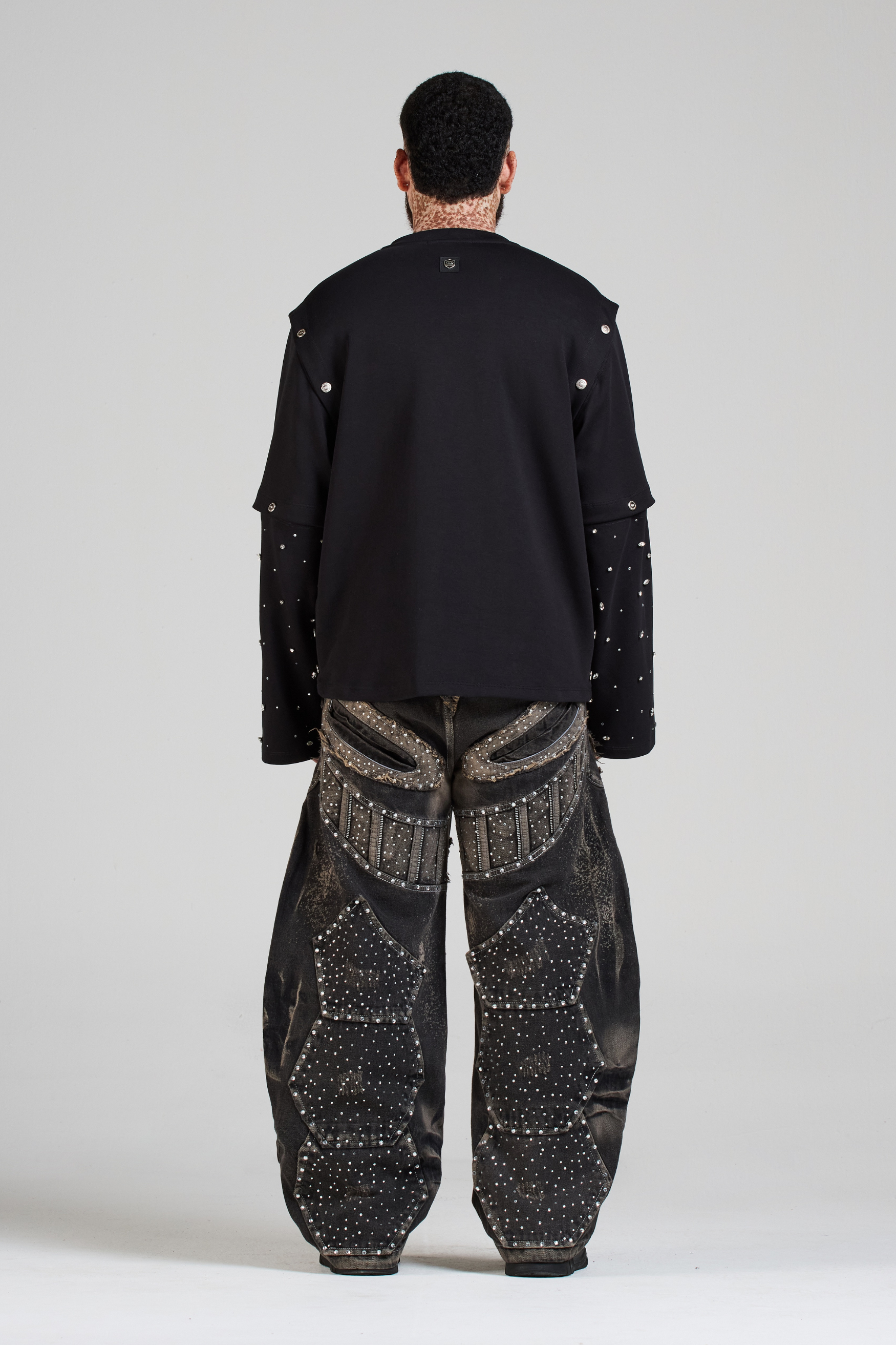 Las mangas del buzo incorporan pedrería cristal cocida a mano, un detalle artesanal que eleva la prenda y la convierte en un ícono de la línea.