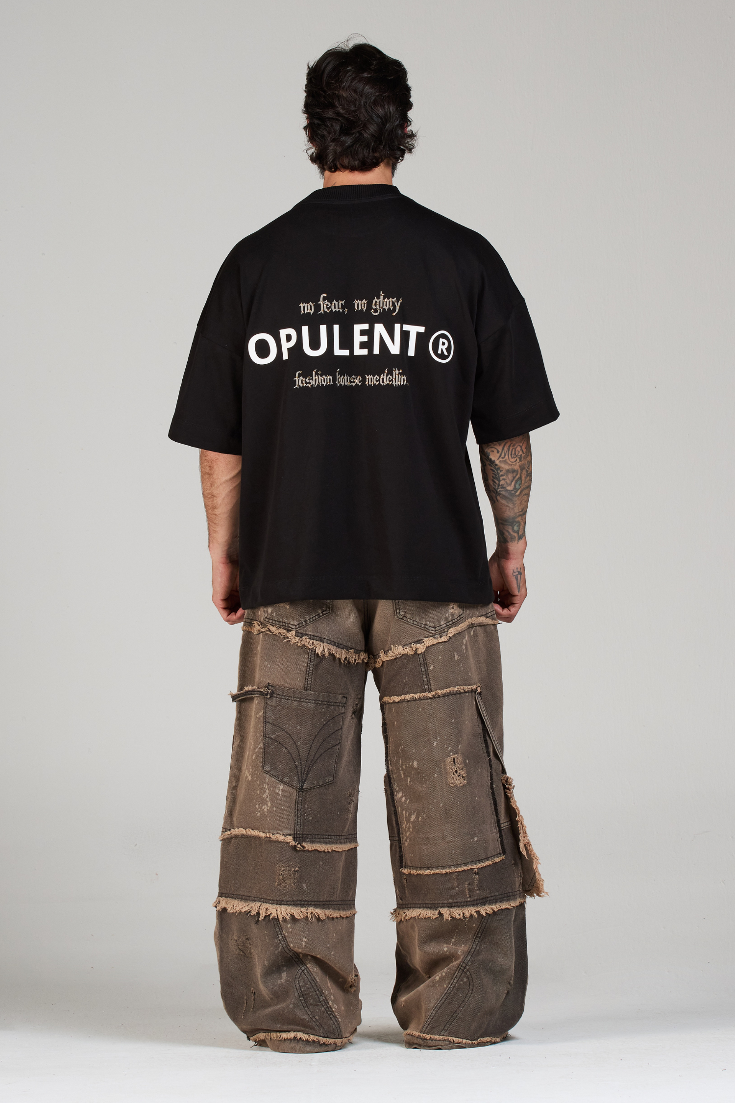 Modelo descaderado con una construcción que integra más de 30 cortes, pensados para aportar complejidad y detalle. Incorpora un bolsillo aéreo, un sesgo en denim colgante, además de un botón contramarcado con el logo OPULENT y una garra metálica trasera, distintivos de la marca.