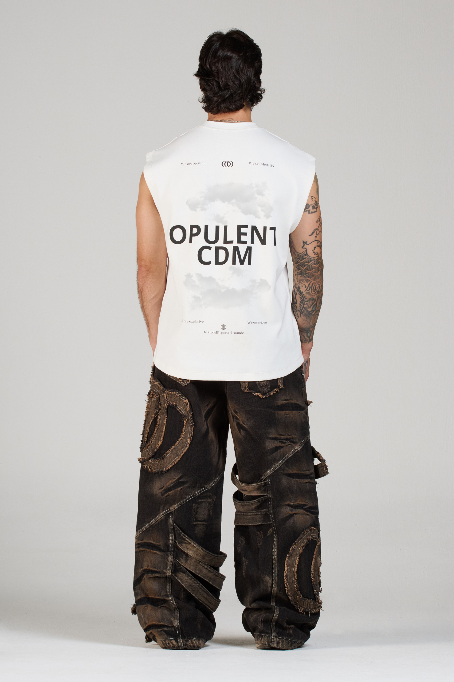 Su gráfica en serigrafía incluye, en el frente, un paisaje griego acompañado de las siglas OPULENT CDM, evocando una estética mítica y futurista. En la parte trasera, incorpora textos de OPULENT acompañados de nubes en un tono gris claro, creando un contraste etéreo que eleva la pieza.