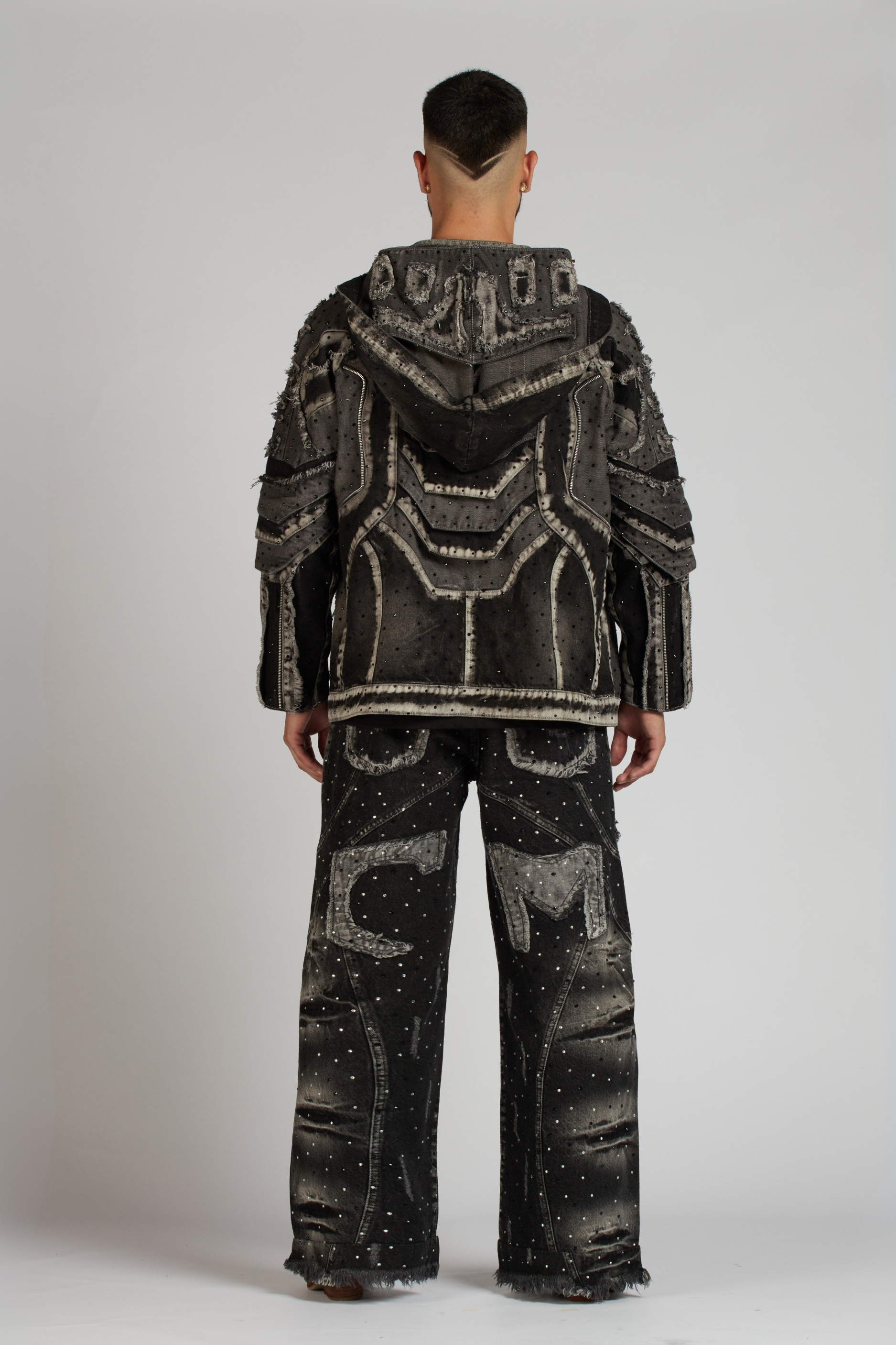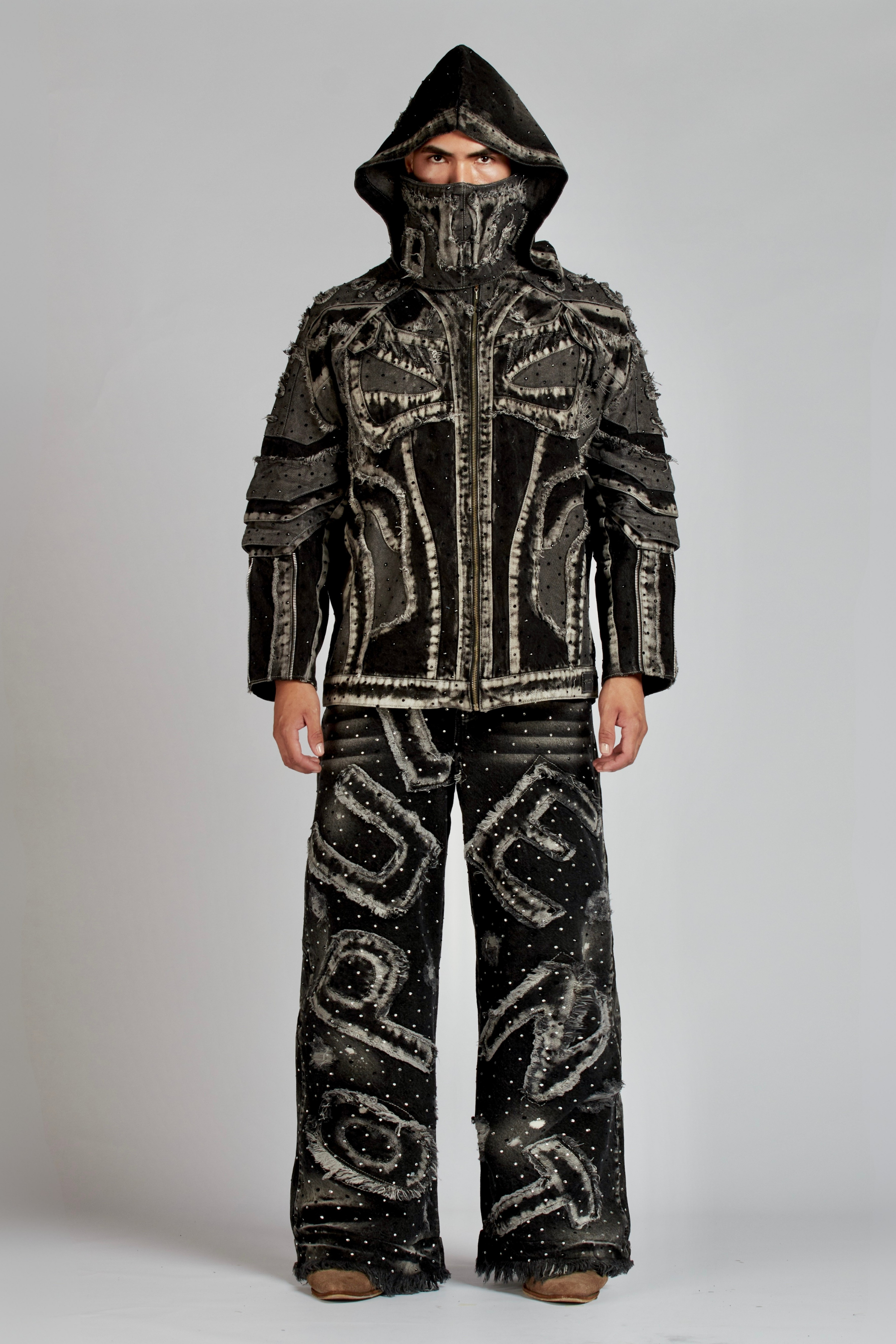 Diseñada en negro con sombras blancas en los cortes, presenta un cierre frontal y detalles innovadores como una capucha desmontable y un cubrebocas estilo depredador removible. Su compleja construcción de aproximadamente 100 cortes requiere más de 17 días de trabajo artesanal, convirtiéndola en una auténtica obra de diseño.