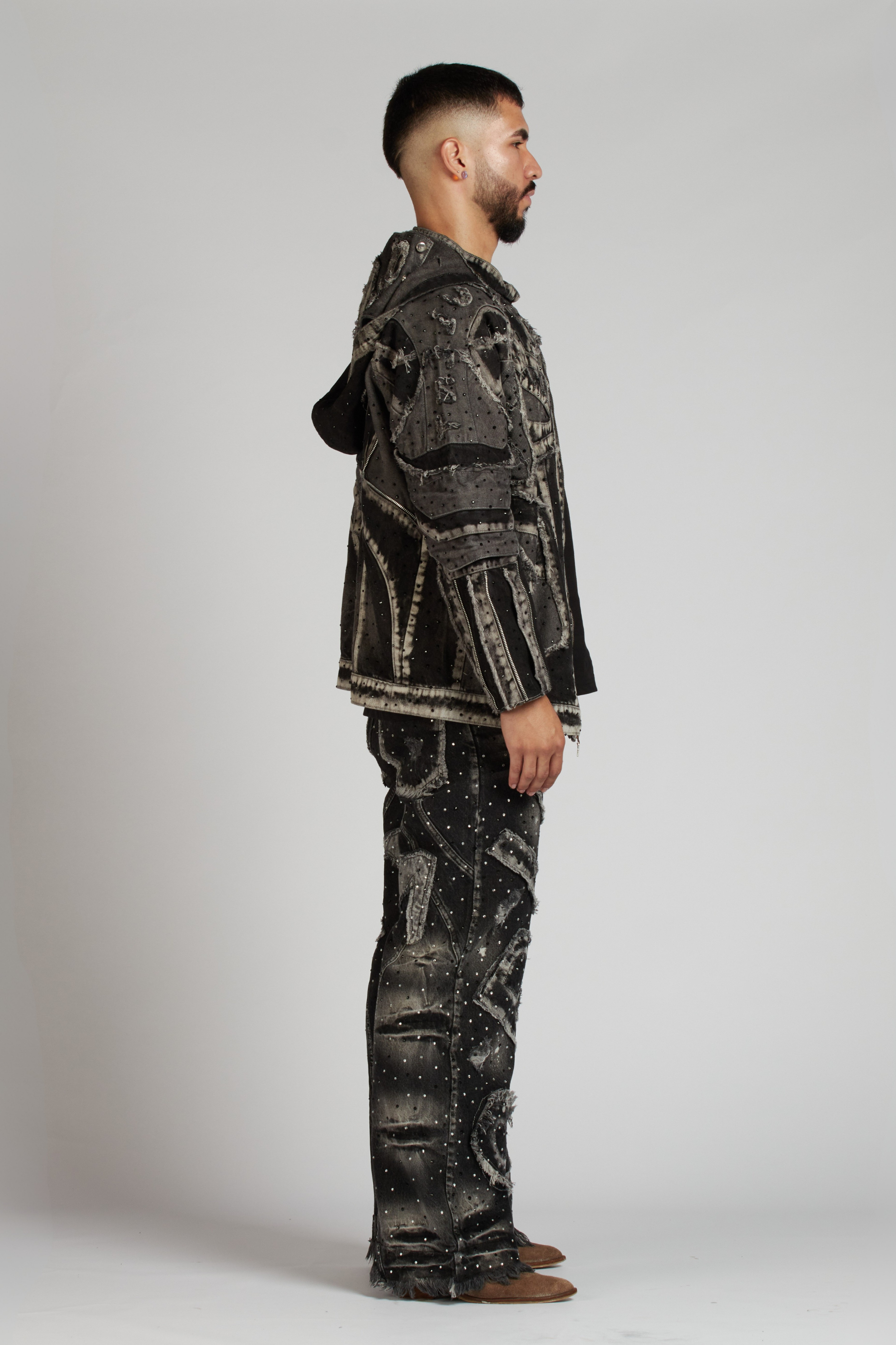 Una pieza icónica de la línea masculina. Con pedrería cristal aplicada a mano, este jean descaderado cuenta con bragueta con botón contramarcado y una construcción impecable que realza su silueta contemporánea. Su diseño incorpora el logo OPULENT en la parte frontal y dos piezas traseras que forman la CM de Casa de Moda.