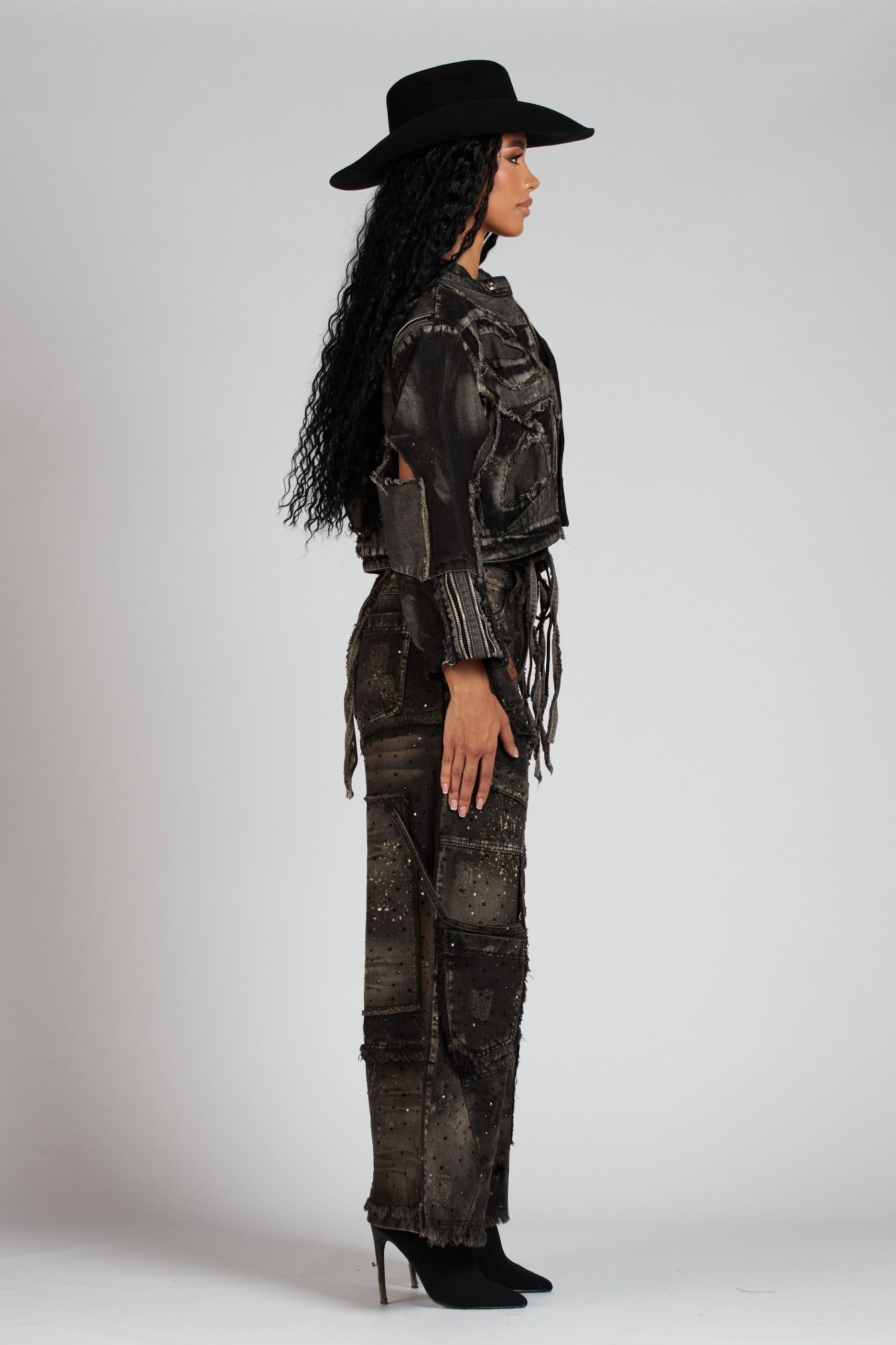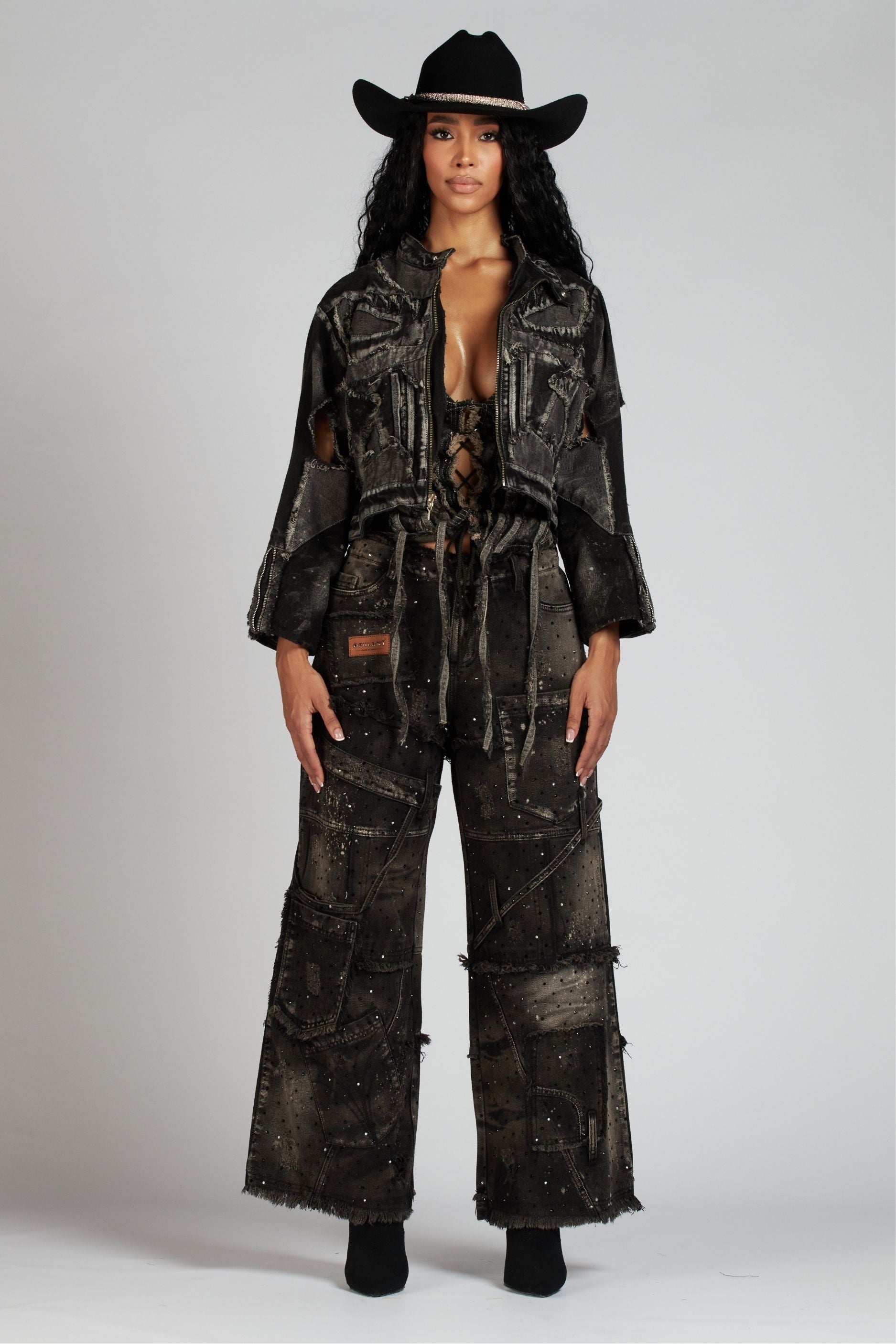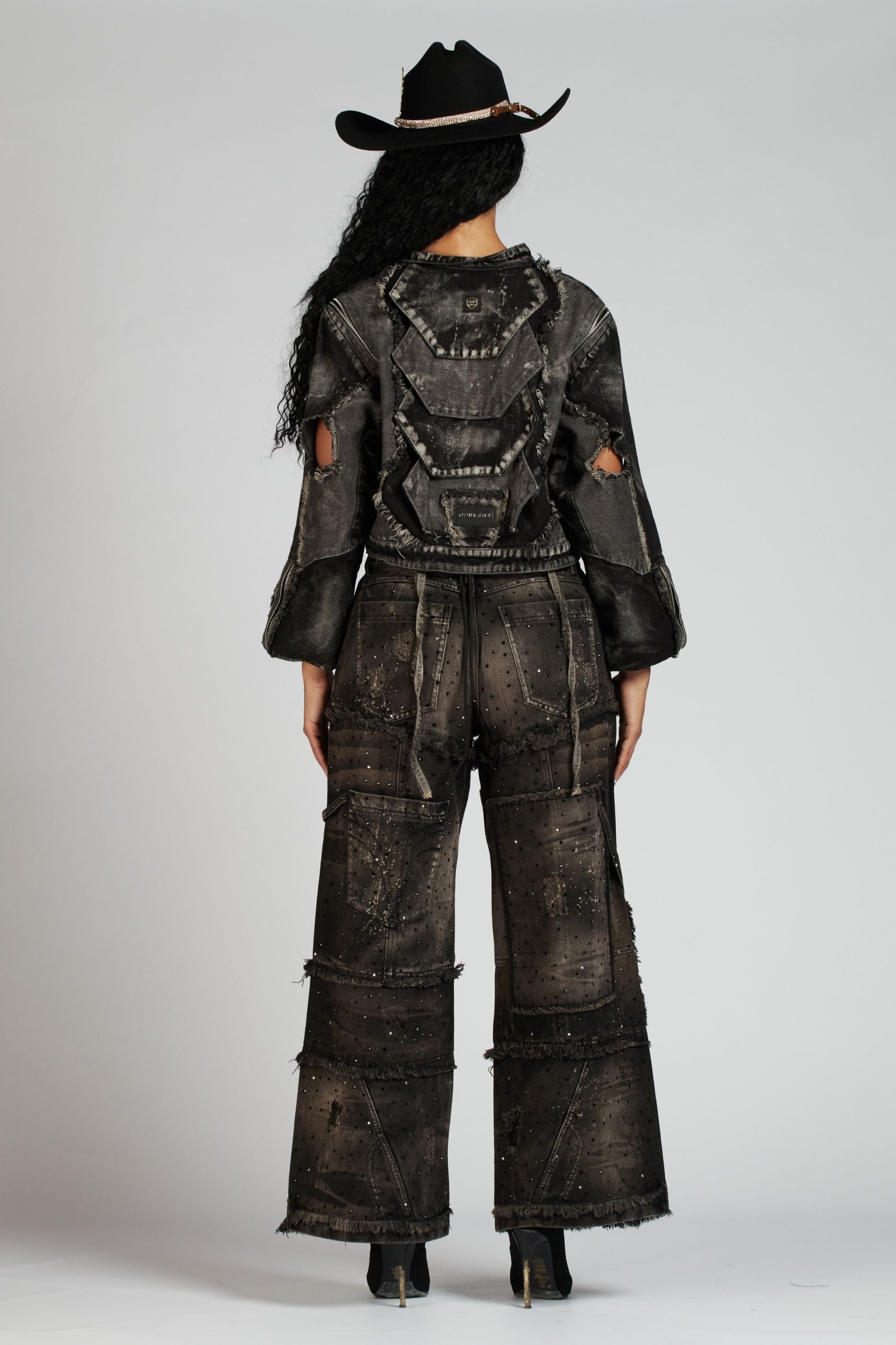 Intervenido con pedrería cristal aplicada a mano, este modelo descaderado incluye bragueta con botón contramarcado y una construcción precisa. Destaca por su bolsillo aéreo incorporado en el diseño, además de detalles en desfleque y costuras visibles. Su acabado combina negro en escala de tonos tierra oscuros con costuras en color ocre, un proceso exclusivo de OPULENT.