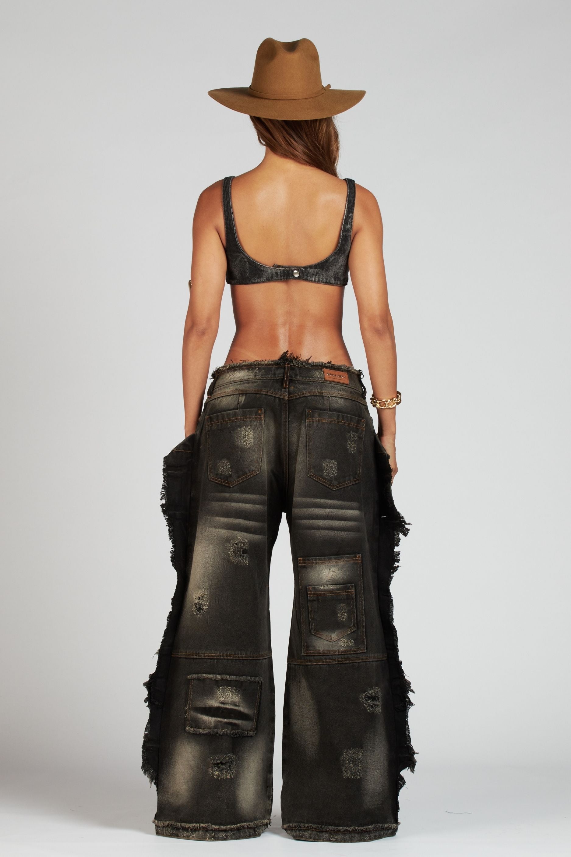 Modelo descaderado con bragueta y botón contramarcado. Su construcción integra aletas laterales desflecadas, además de costuras visibles y zonas de desfleque que refuerzan su carácter. En la parte inferior, las botas del jean replican la pretina superior, aportando un detalle diferenciador. El acabado combina un negro base con luces blancas y toques amarillos dirty, desarrollado en un proceso exclusivo de OPULENT.