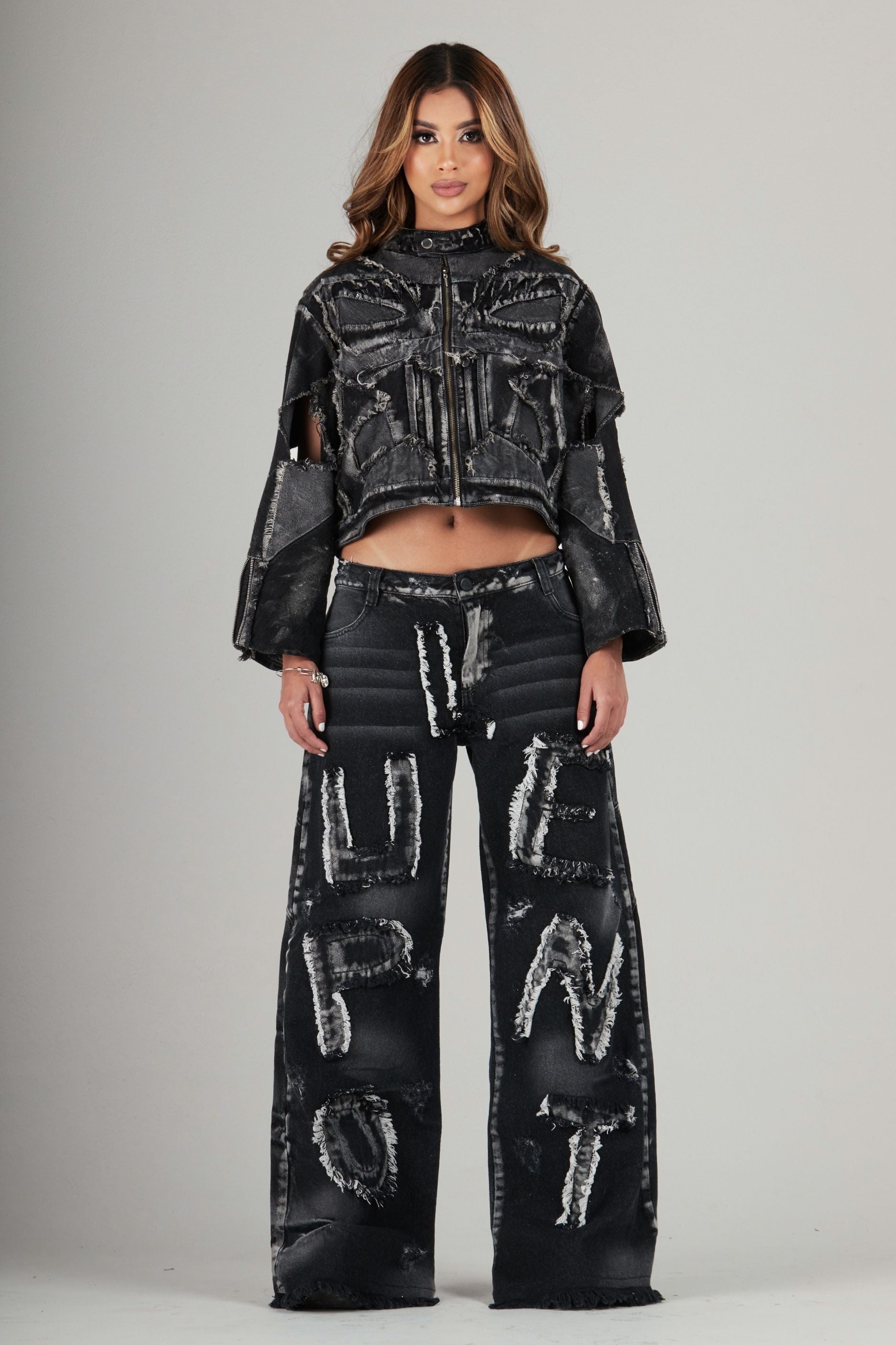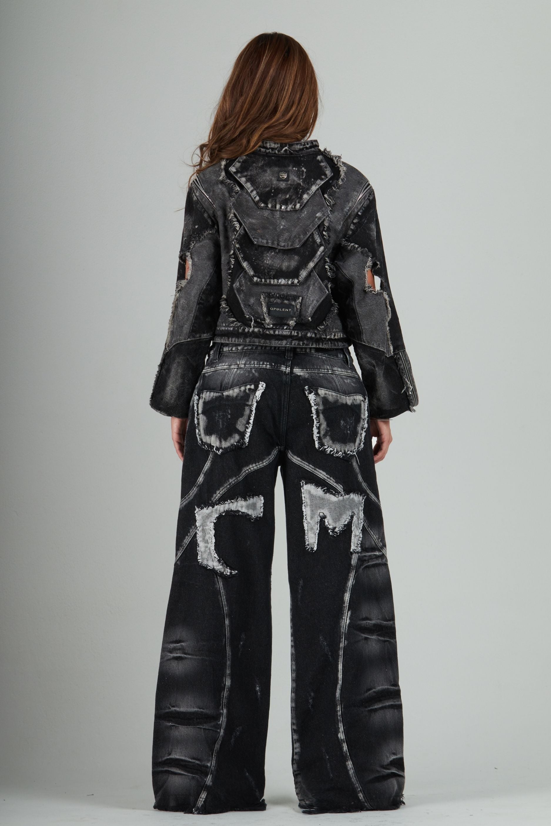 Modelo descaderado con bragueta y botón contramarcado. Su diseño incluye las letras OPULENT en la parte frontal y dos piezas traseras que forman la CM de Casa de Moda. El acabado en negro con luces blancas, junto a los detalles de desfleque y costuras visibles, surge de un proceso exclusivo de OPULENT.