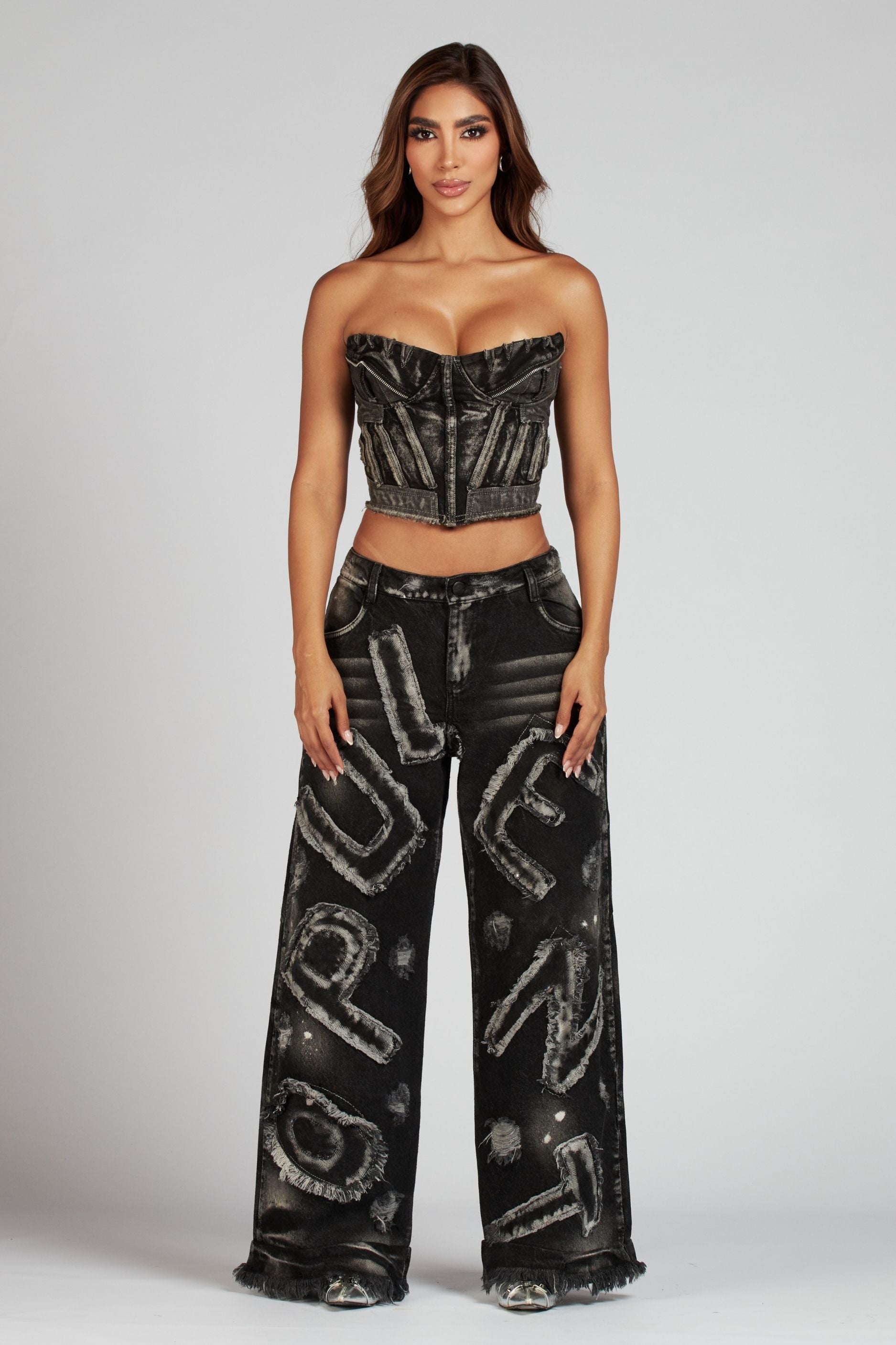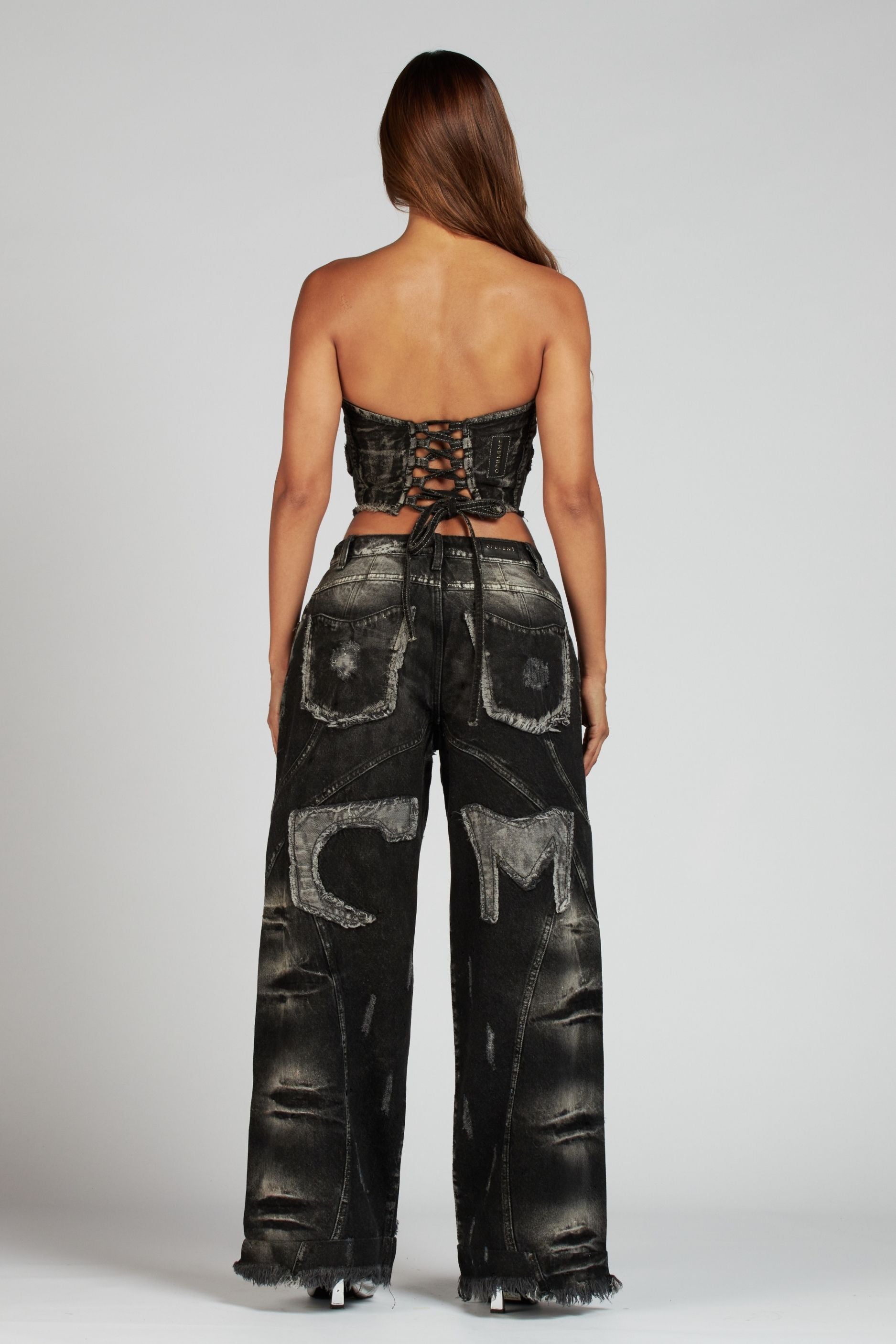 Este modelo descaderado con bragueta y botón contramarcado ofrece una construcción precisa y contemporánea. El diseño incorpora las letras OPULENT en el frente y dos piezas en la parte trasera que representan la CM de Casa de Moda. Su proceso exclusivo de color en negro contrastado con luces blancas, sumado a los detalles de desfleque y costuras visibles, aporta carácter y refuerza la identidad de la prenda.