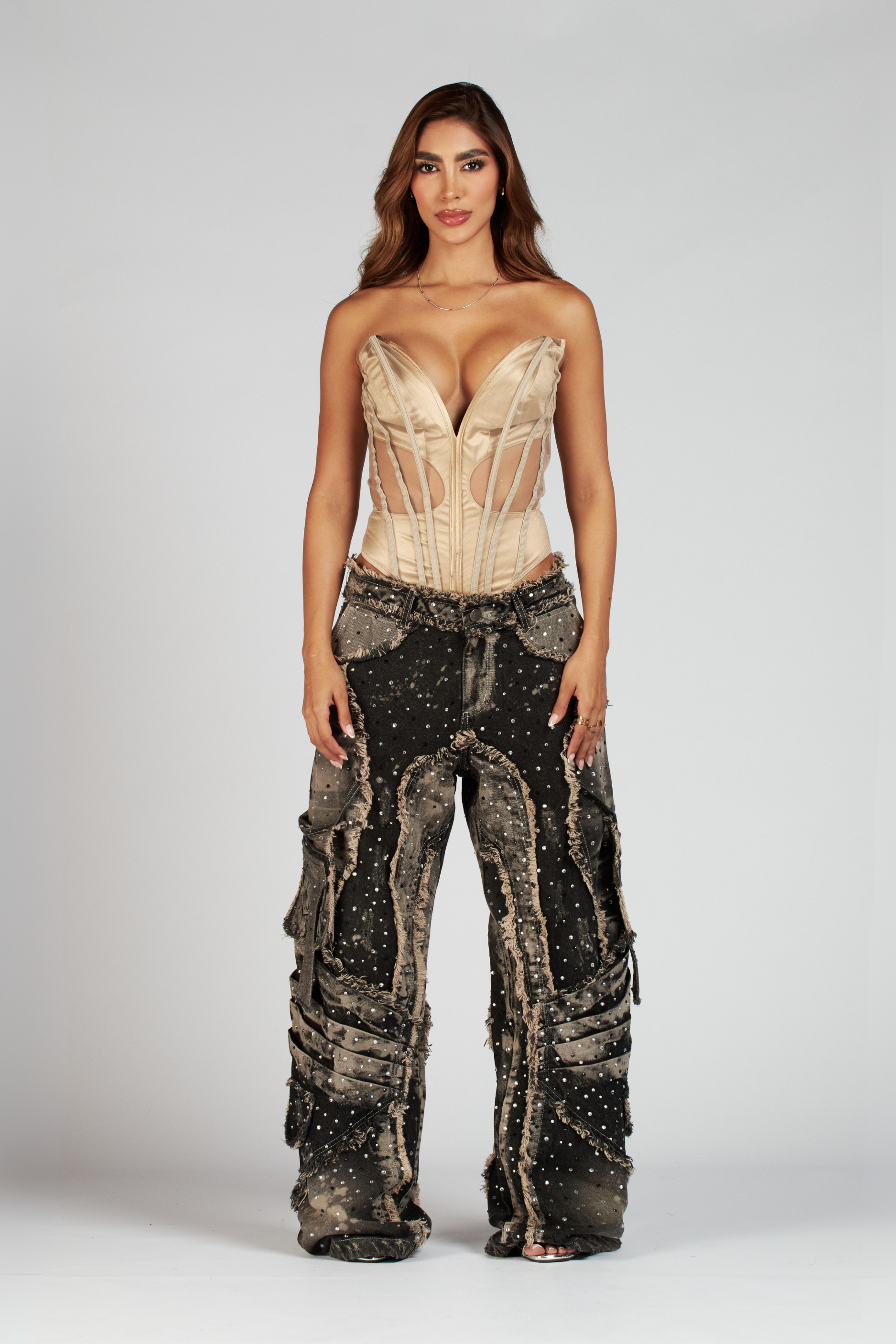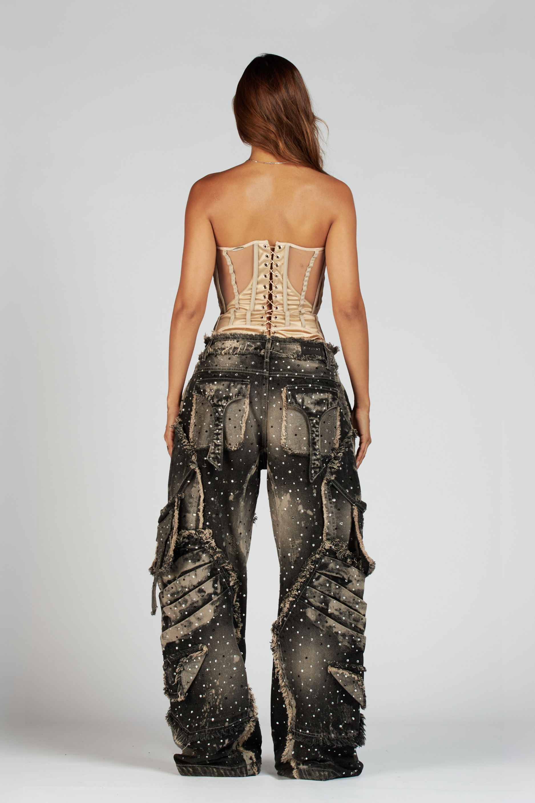 Intervenido con pedrería cristal aplicada a mano, este modelo descaderado incluye bragueta y botón contramarcado. Su construcción incorpora bolsillos colgantes en los laterales, un grapeado en la parte inferior de las botas y múltiples cortes asimétricos. Detalles en desfleque y costuras visibles refuerzan la identidad de la prenda. El acabado combina un fondo negro con lavados en chafados y dirtys, desarrollado en un proceso exclusivo de OPULENT.