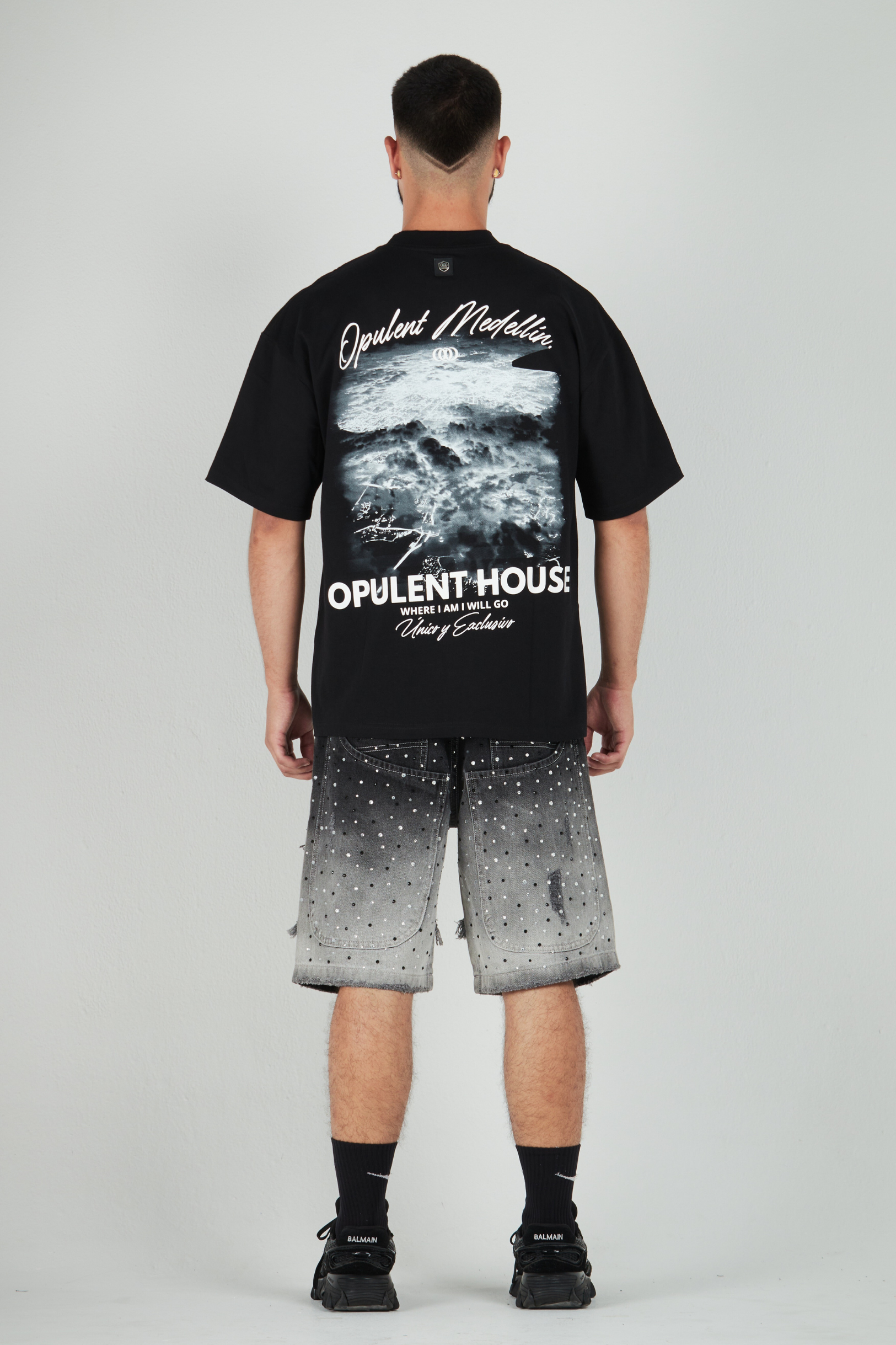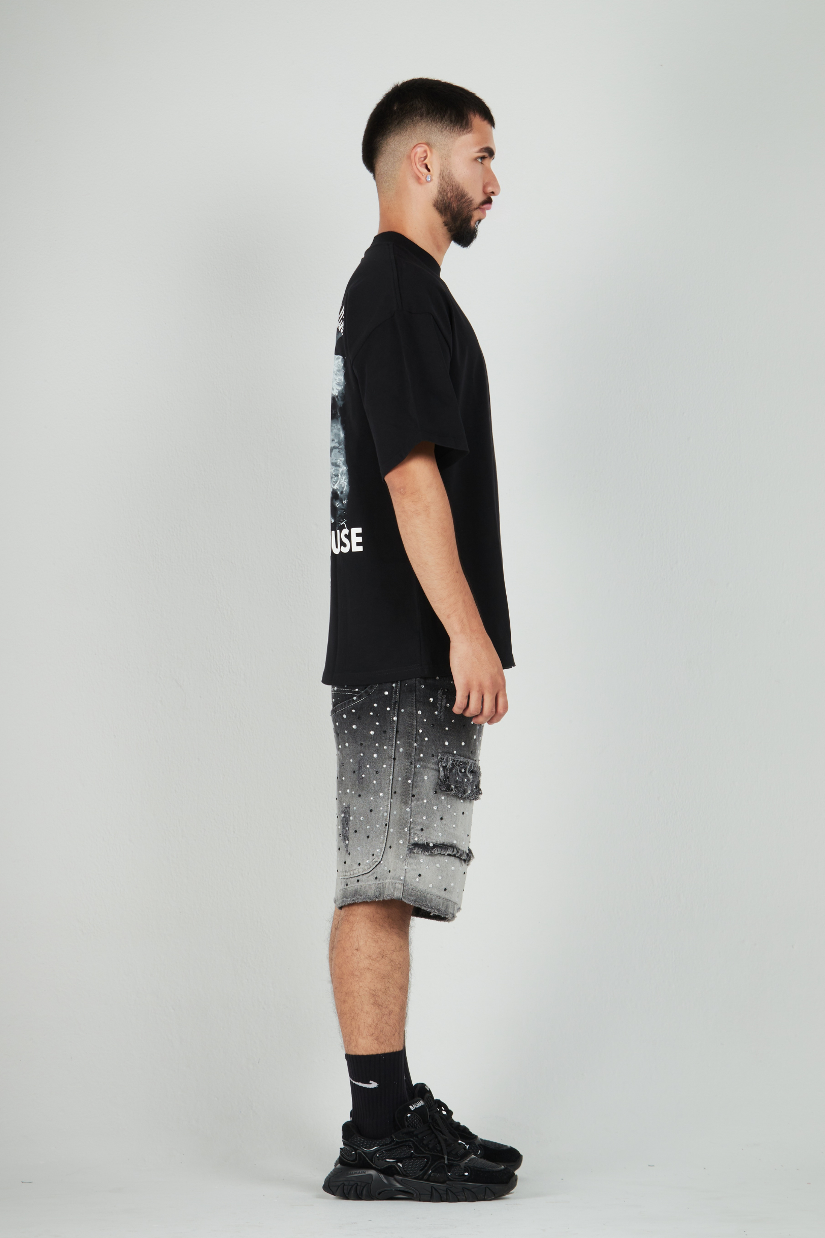Intervenida con pedrería cristal aplicada a mano, esta bermuda incluye cortes frontales sutiles y detalles traseros con cortes bajo los bolsillos, que refuerzan su diseño. El degradado de negro a gris le aporta profundidad y un acabado distintivo.