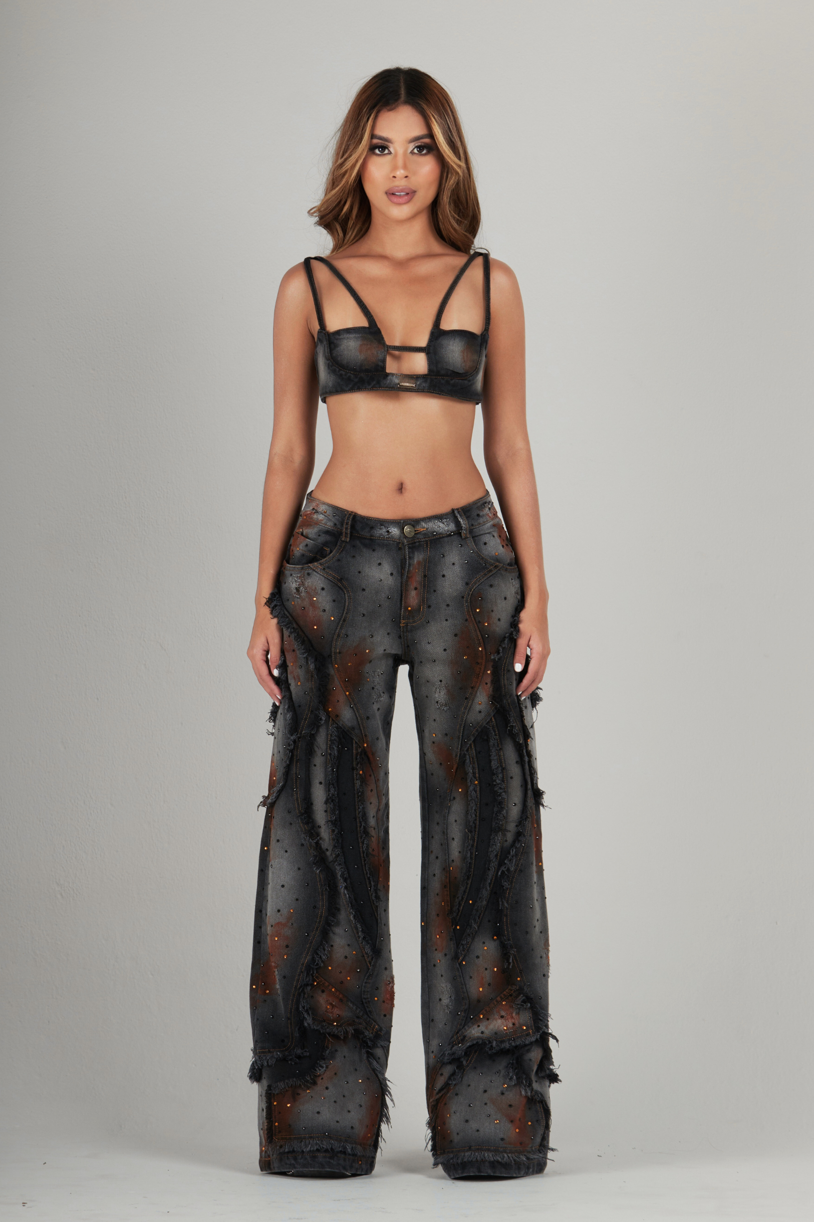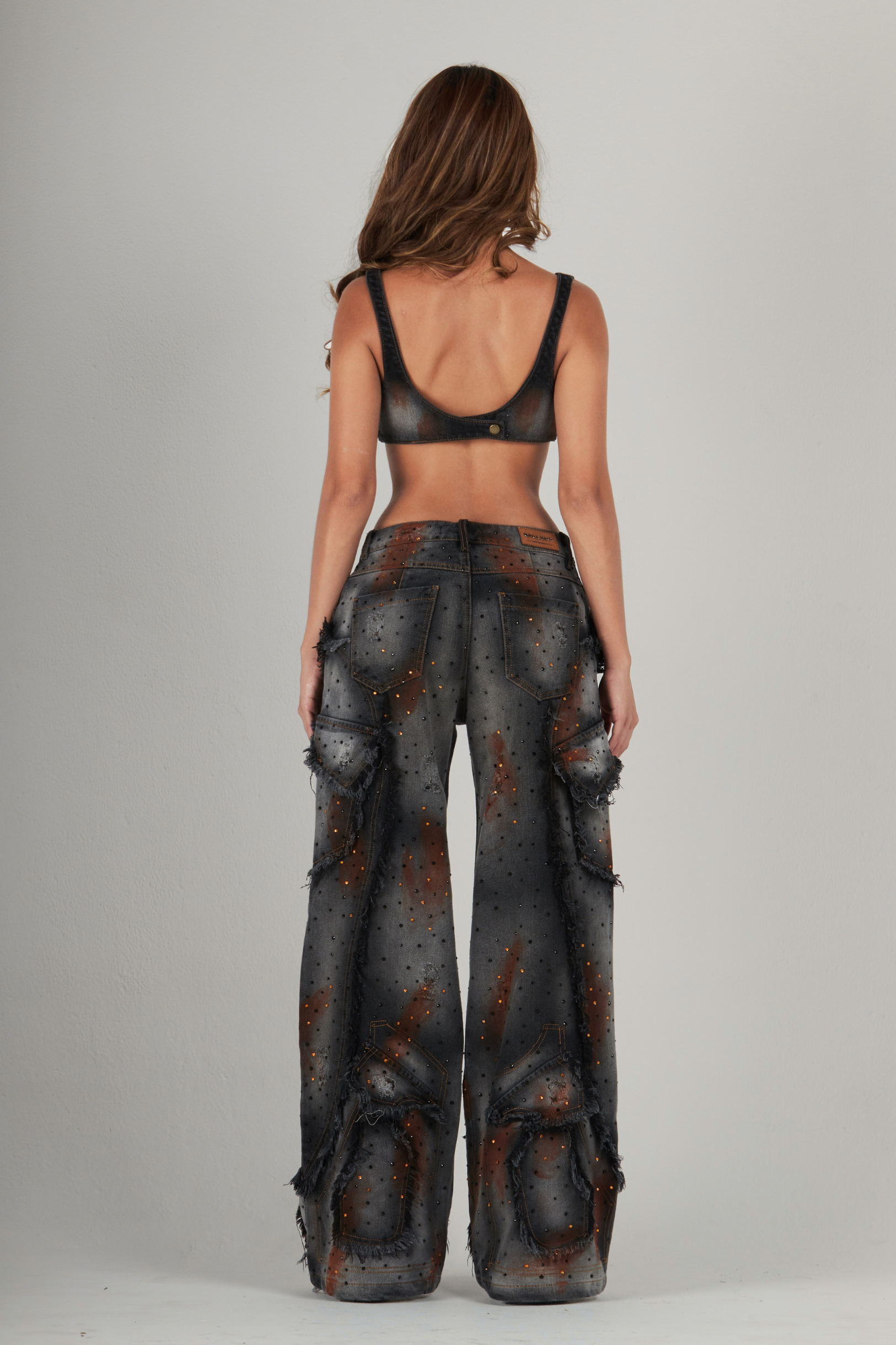 Intervenido con pedrería cristal aplicada a mano, este modelo integra bolsillos asimétricos y piezas en construcción vertical y asimétrica. Incluye bolsillos delanteros y traseros funcionales, botones contramarcados, piezas con desfleque y cortes con costuras visibles. Su acabado combina negros oscuros con luces blancas y parches en color naranja, logrado mediante un proceso exclusivo de OPULENT.