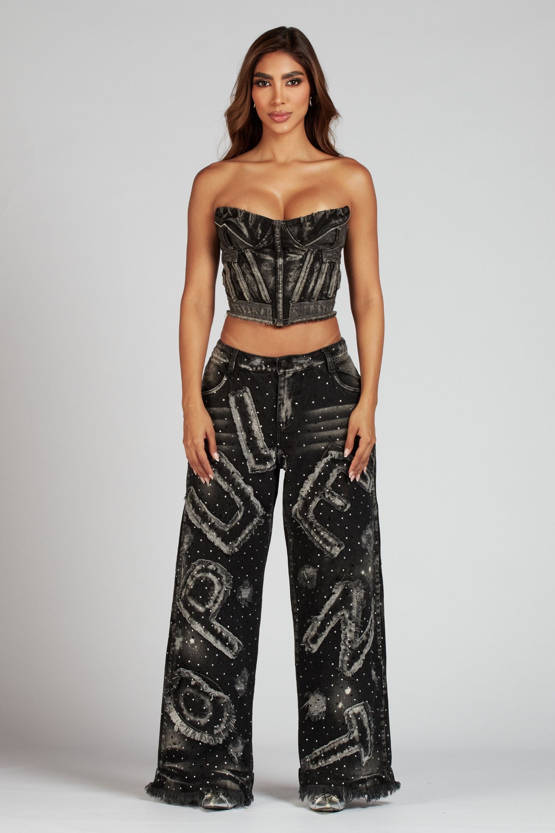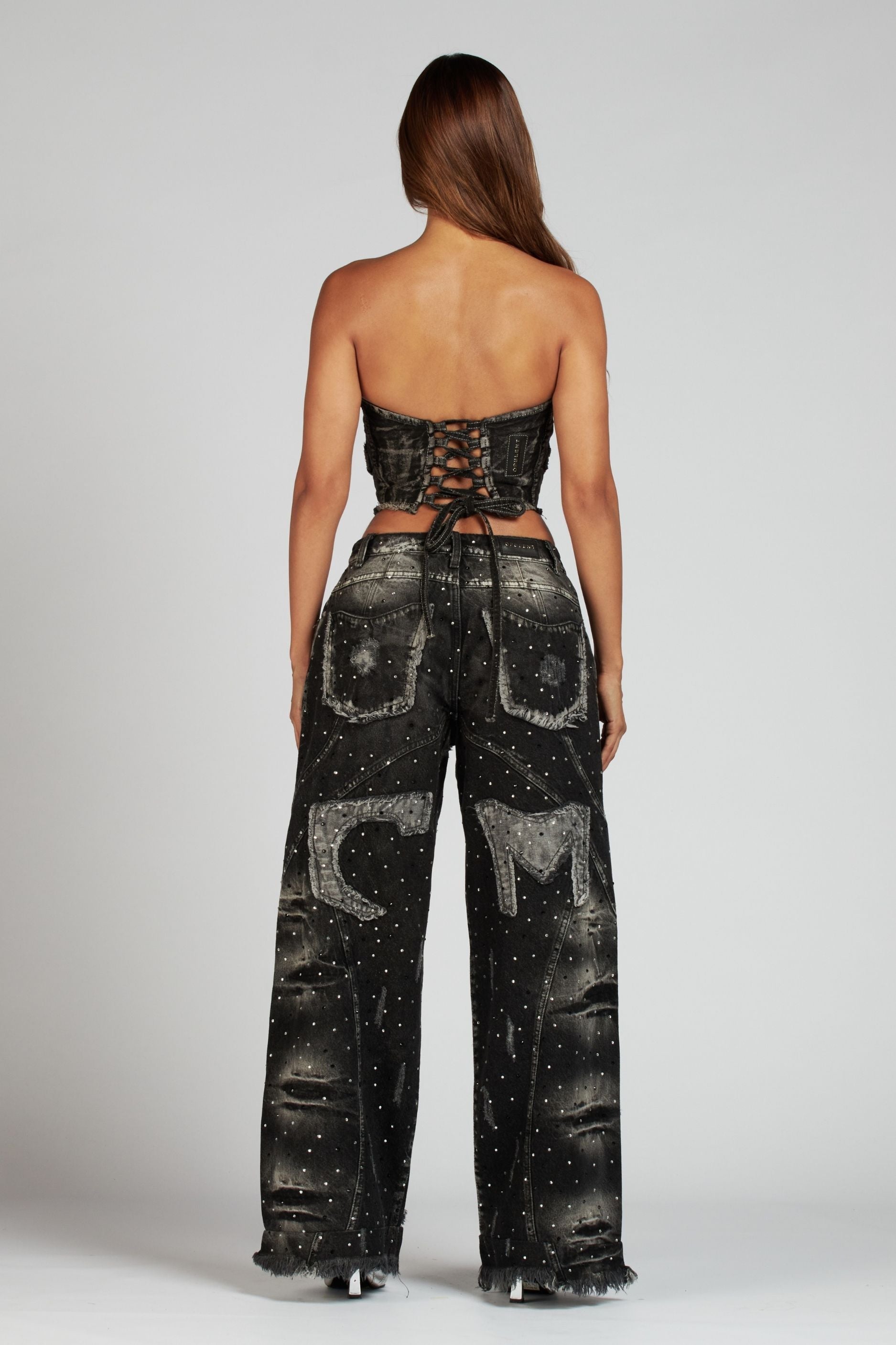 Intervenido con pedrería cristal aplicada a mano, este modelo descaderado con bragueta y botón contramarcado ofrece una construcción precisa y contemporánea. El diseño incorpora las letras OPULENT en el frente y dos piezas en la parte trasera que representan la CM de Casa de Moda. Su proceso exclusivo de color en negro contrastado con luces blancas, sumado a los detalles de desfleque y costuras visibles, aporta carácter y refuerza la identidad de la prenda.