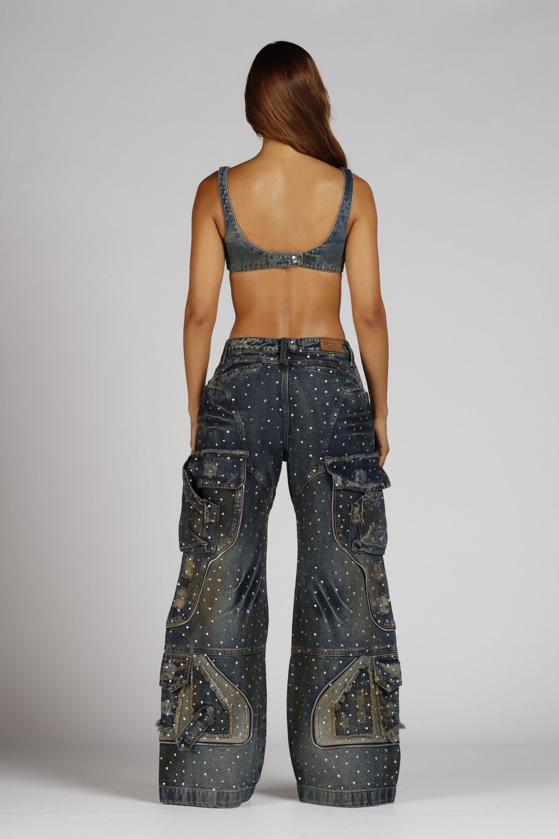 Intervenido con pedrería cristal aplicada a mano, este modelo incorpora cintas con cierres, piezas asimétricas, bolsillos traseros tipo ribete y botones contramarcados. Incluye además piezas con desfleque y cortes con costuras visibles. Su acabado en escala de azules oscuros responde a un proceso de color exclusivo de OPULENT.