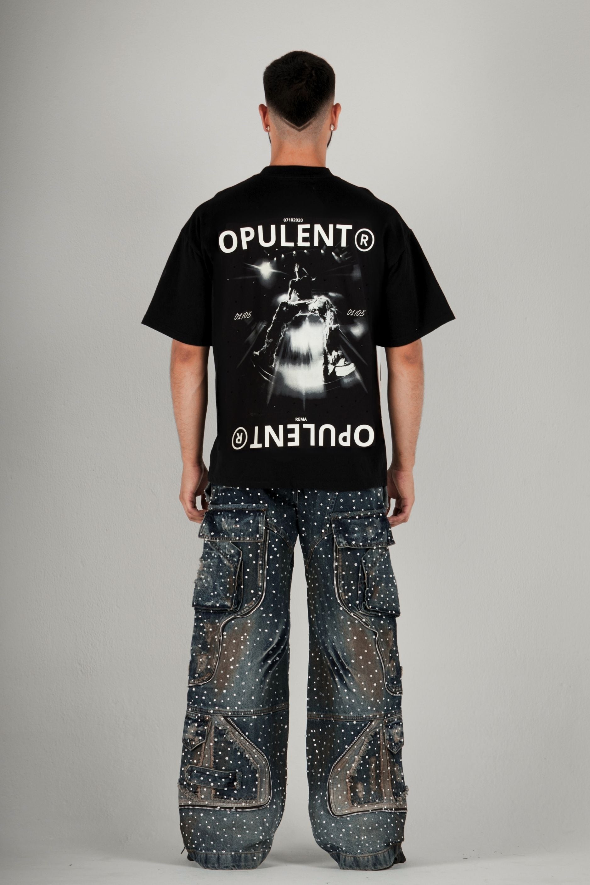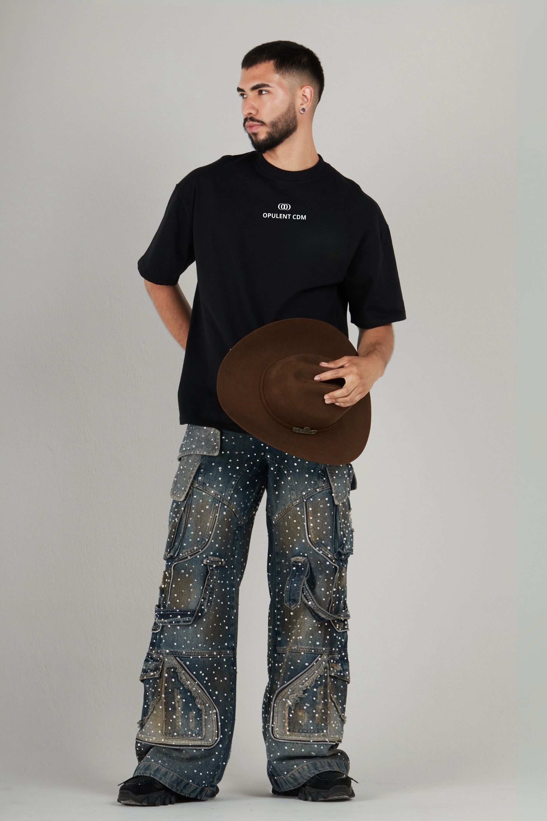 Intervenida con pedrería cristal aplicada a mano que eleva su carácter exclusivo. Su diseño incluye cintas con cierres, piezas asimétricas, bolsillos traseros tipo ribete, botones contramarcados y detalles con desfleque y cortes de costura visibles. El proceso de color en escala de azules oscuros, desarrollado exclusivamente por OPULENT.